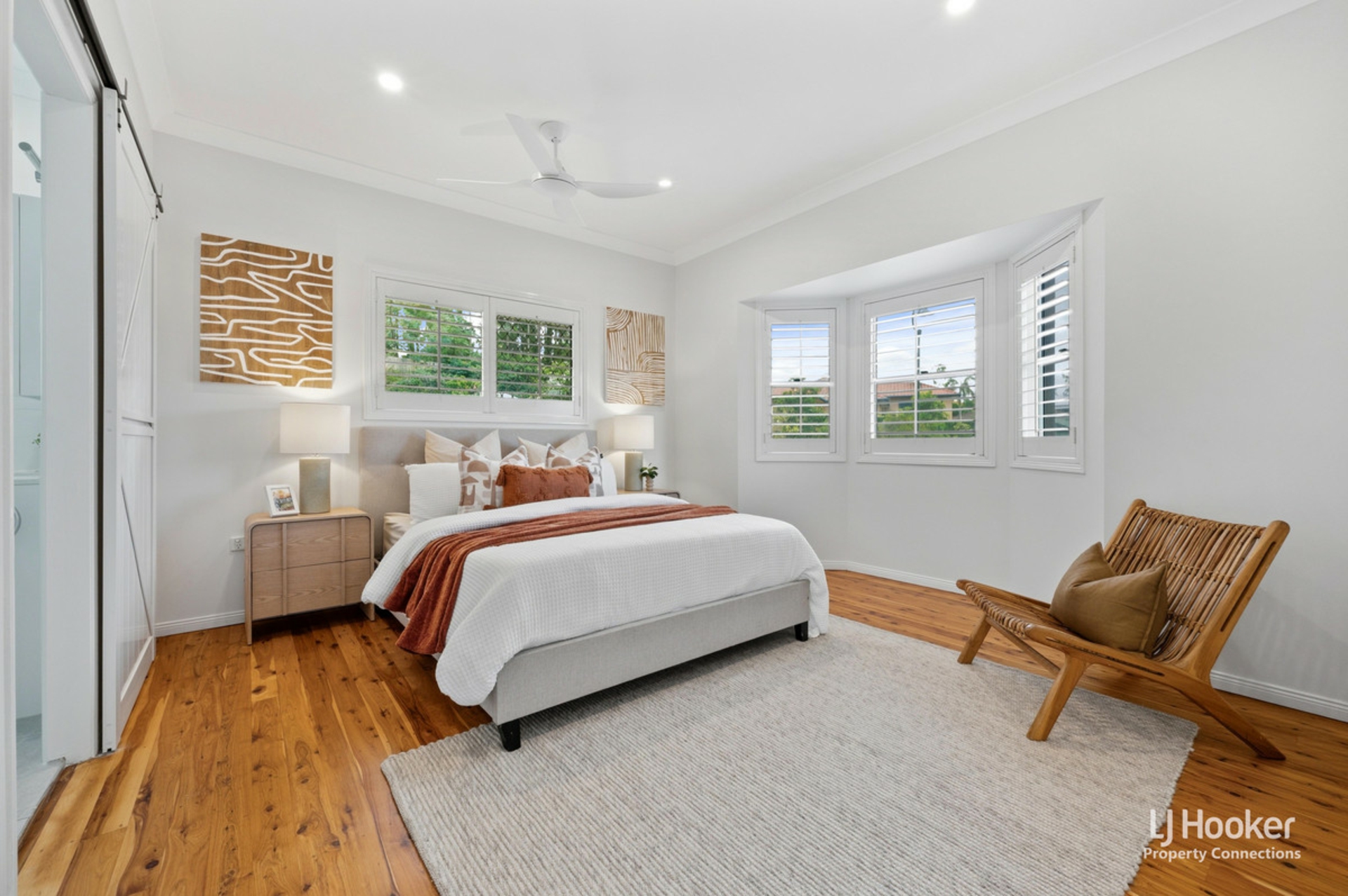 • Four spacious bedrooms, all with built-in robes and ceiling fans. Master bedroom offers a private ensuite, walk-in robe and plantation shutters