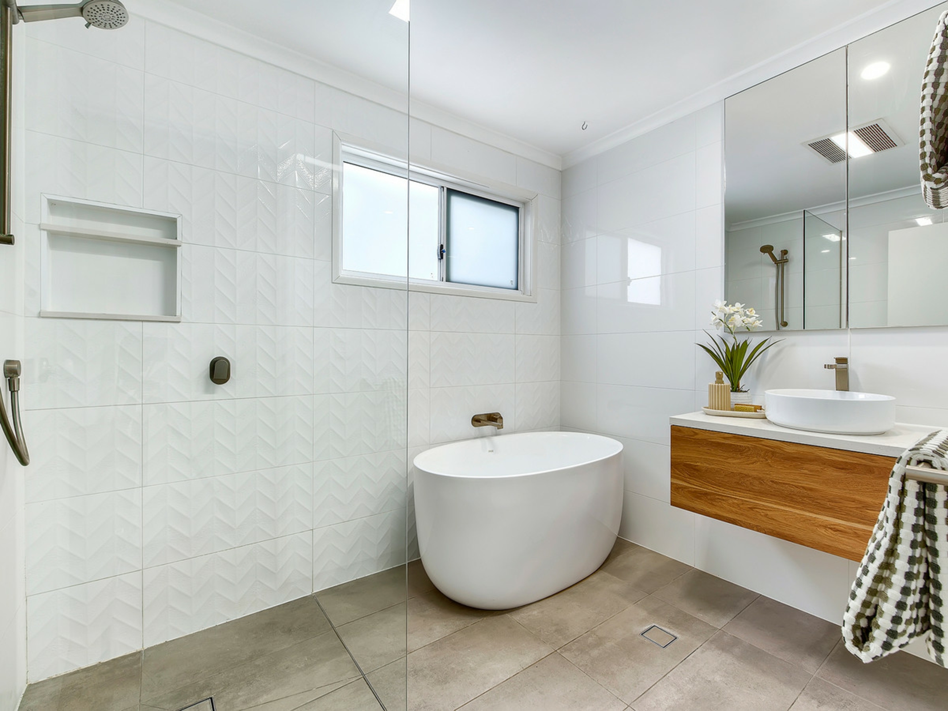 - Renovated main bathroom with floor to ceiling tiling and freestanding bath.