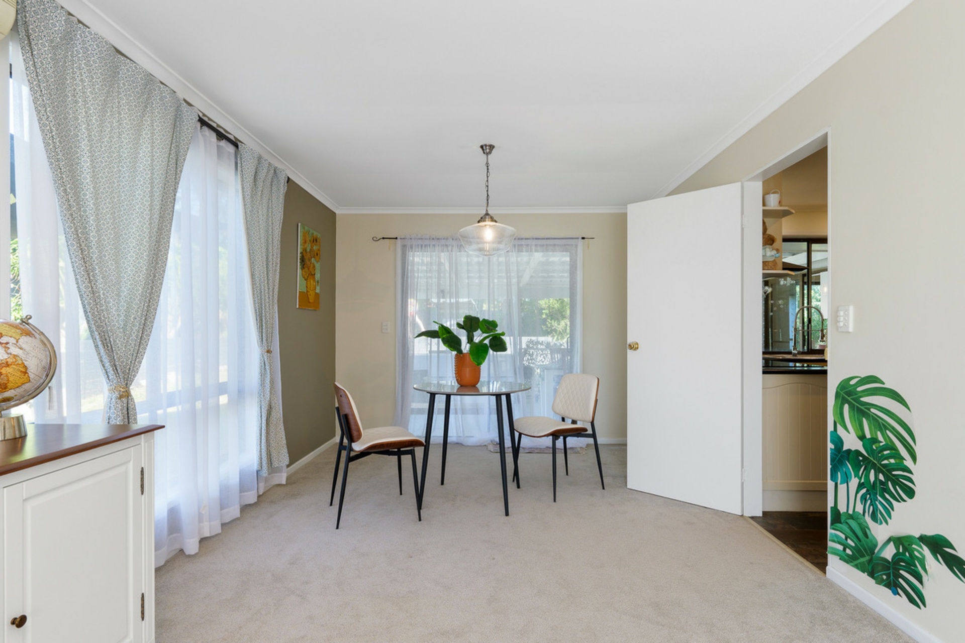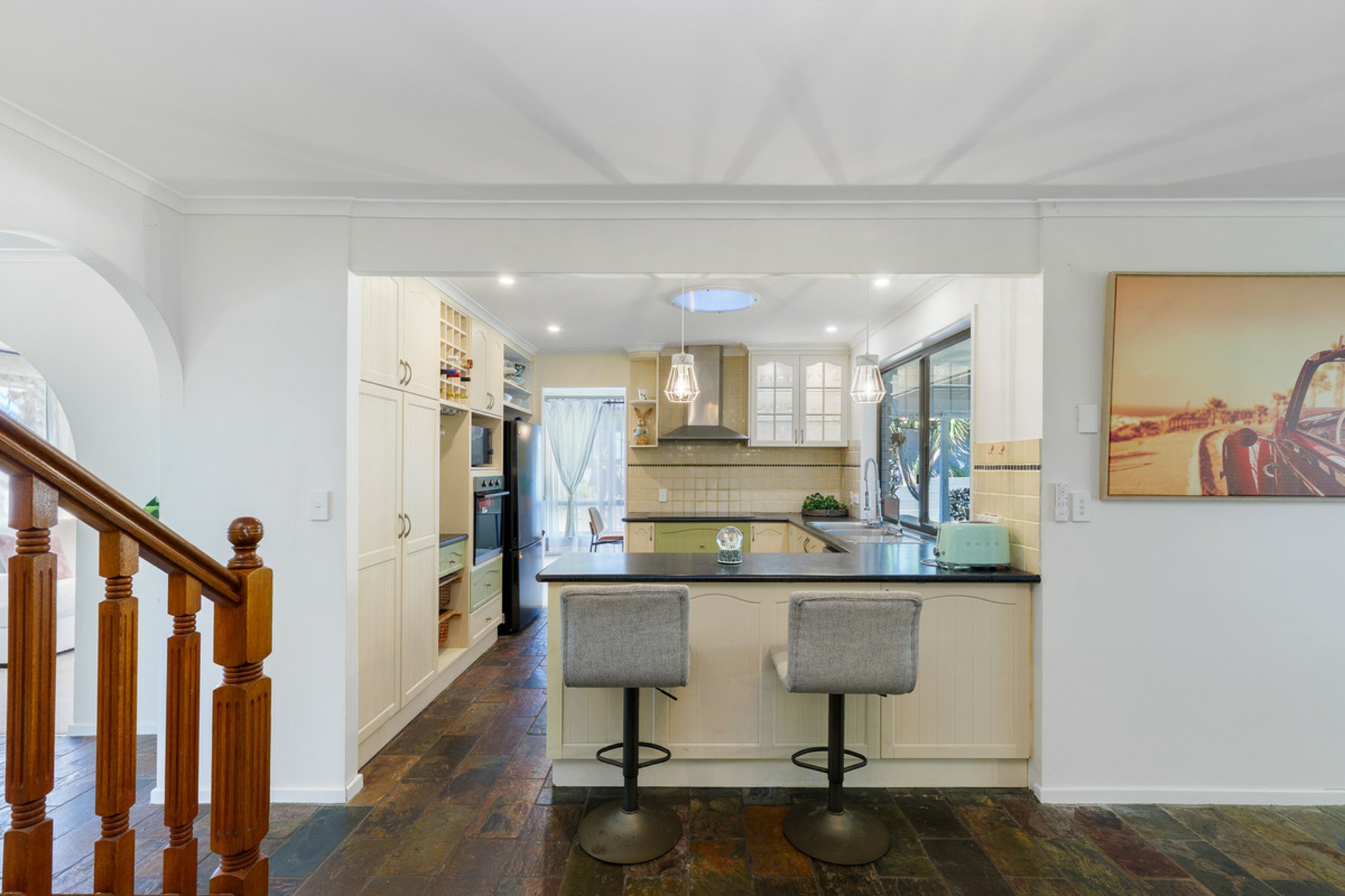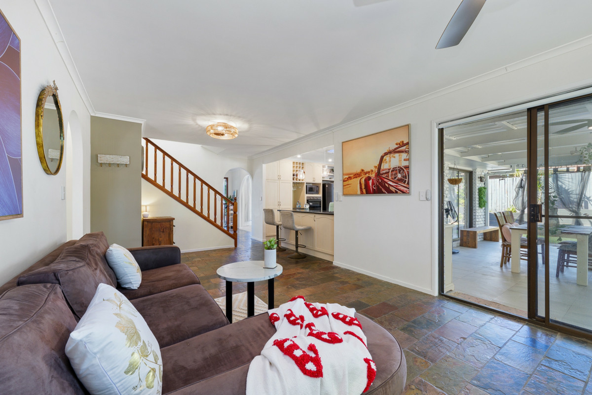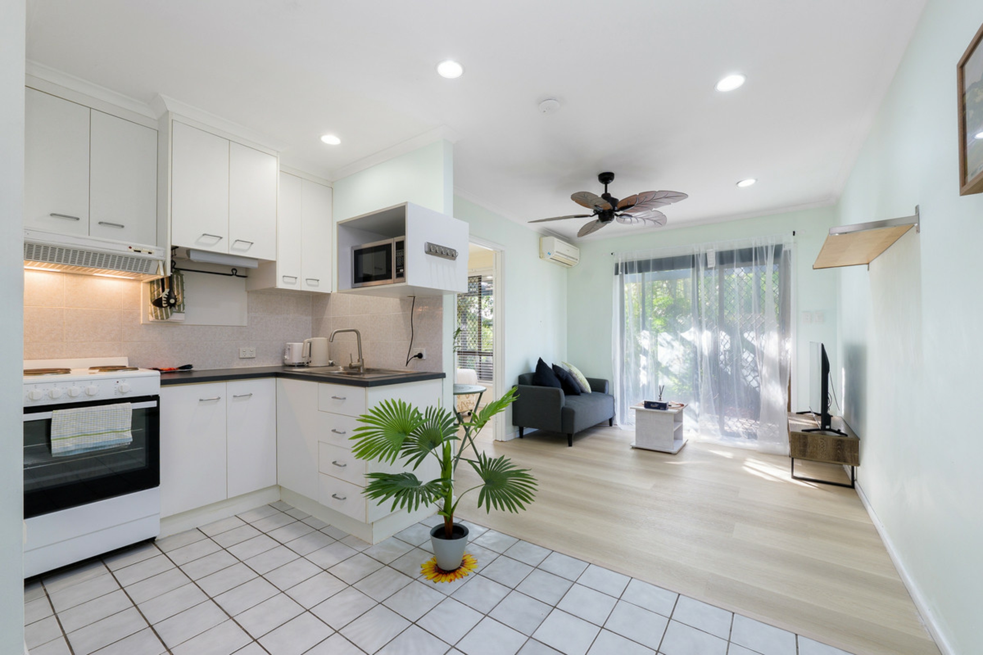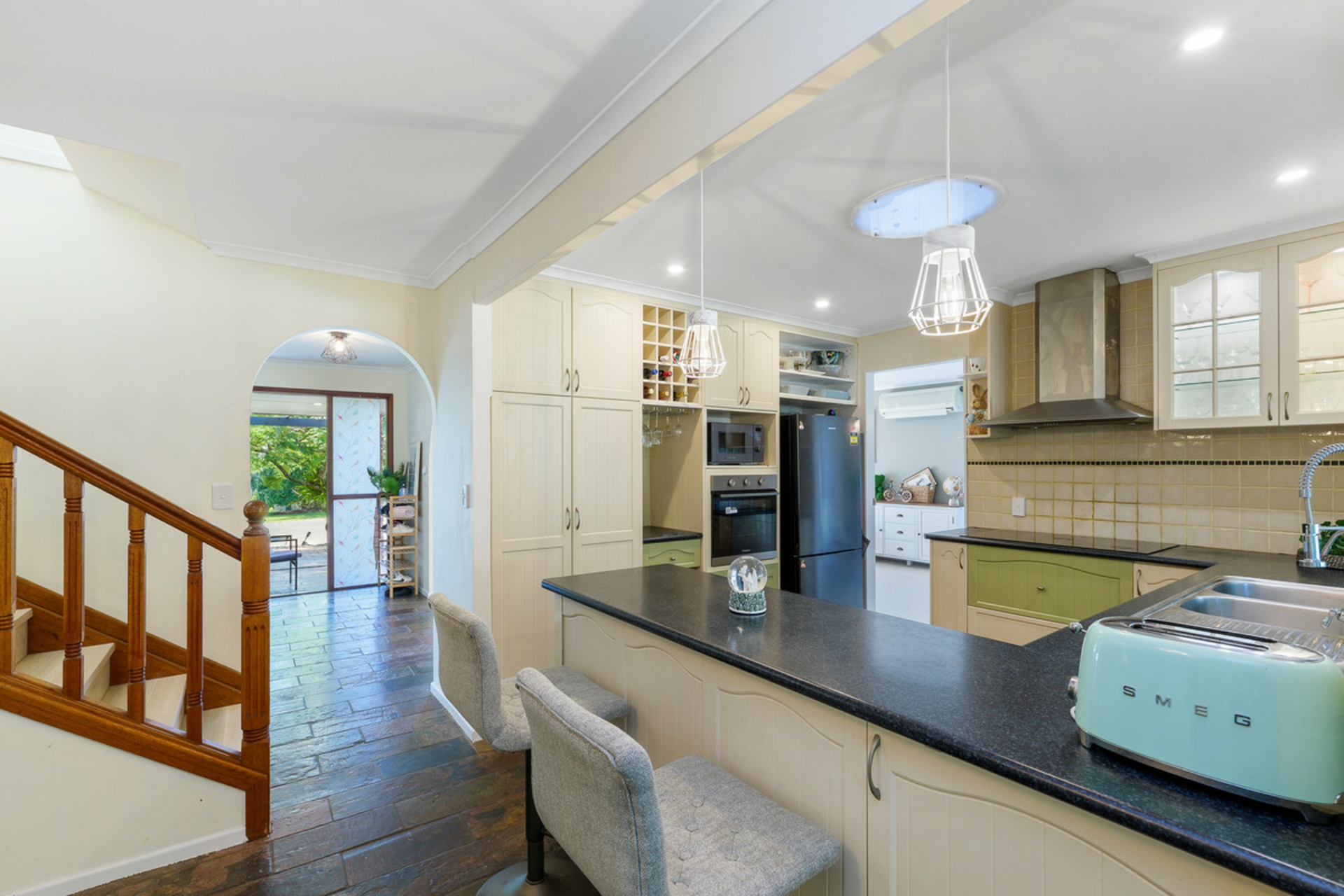 At the heart of the home, the well-appointed kitchen is equipped with quality appliances and induction cooking, perfectly positioned to connect with the indoor and outdoor living spaces.