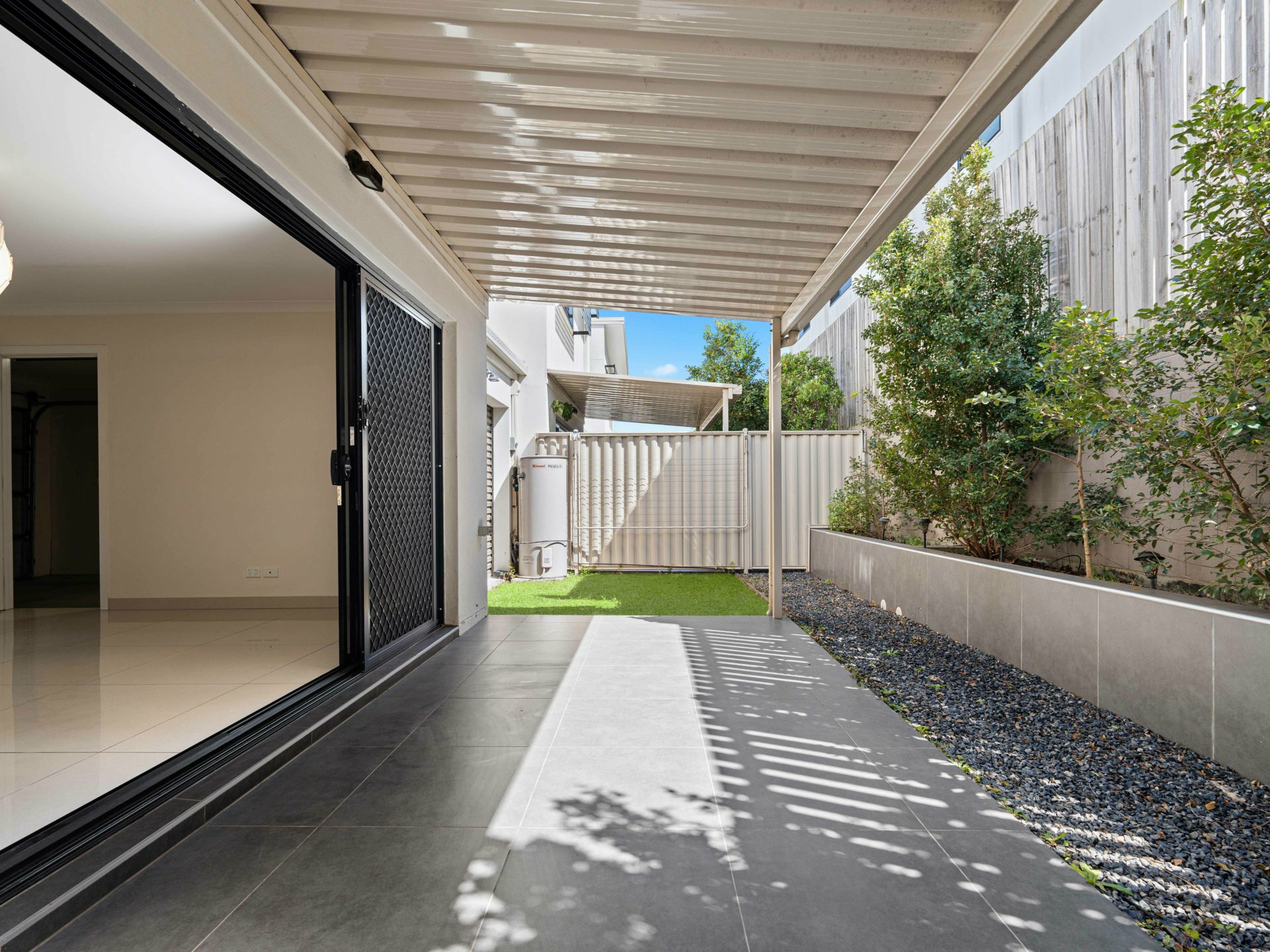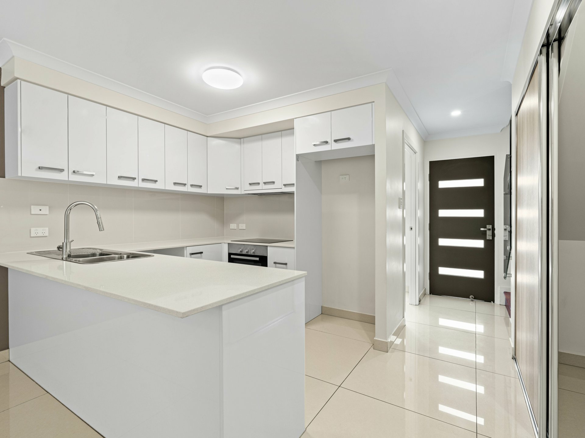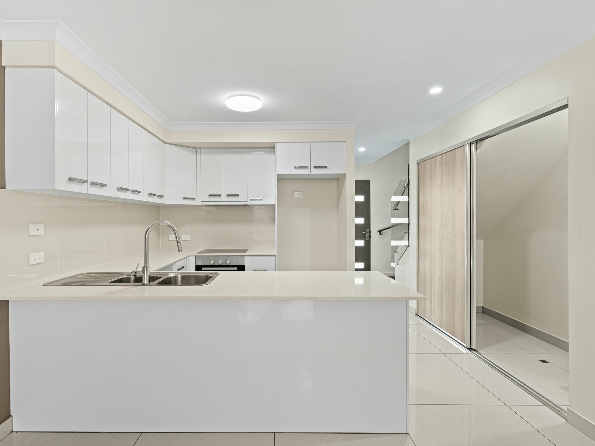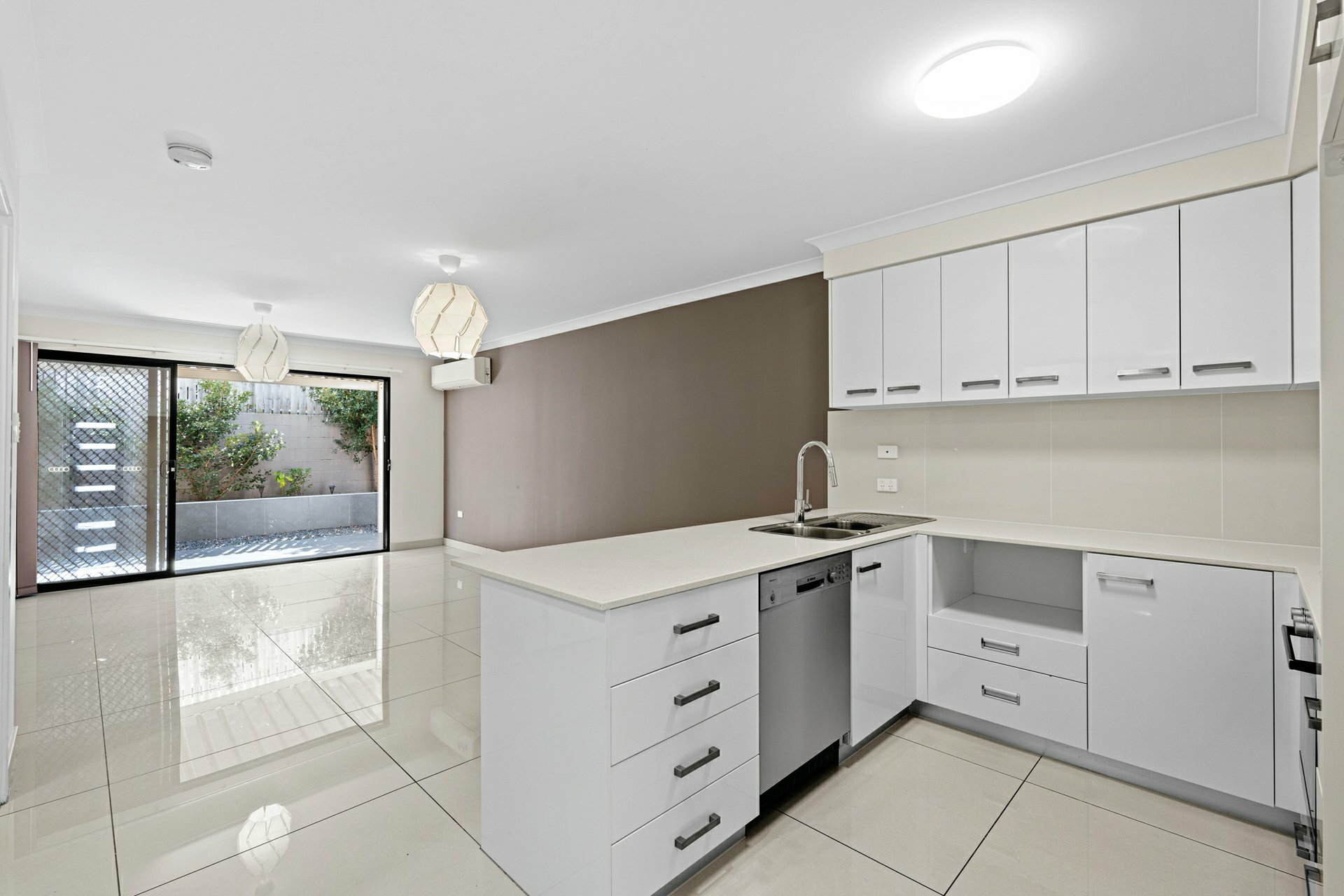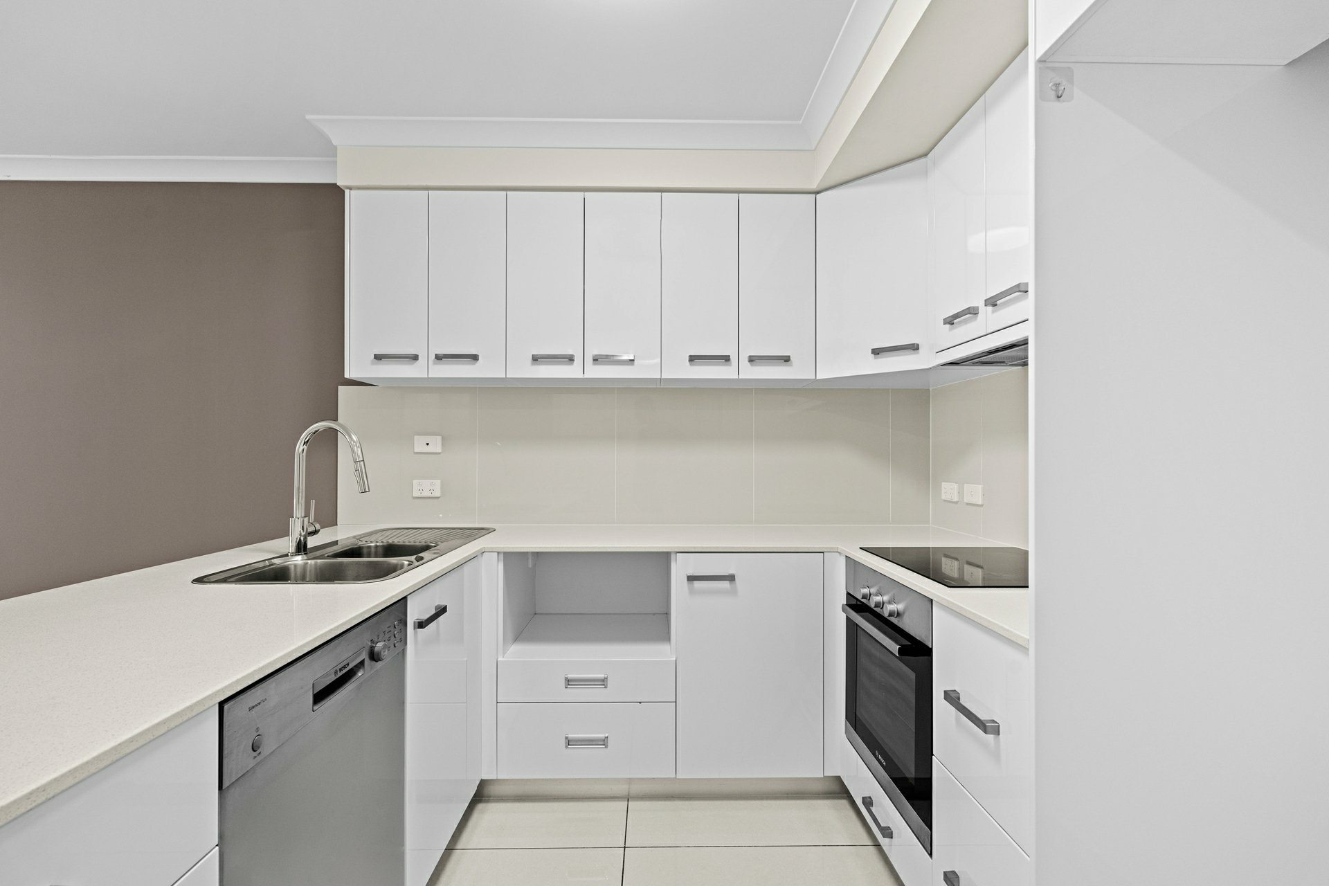 - All-electric stainless steel kitchen appliances, dual sink, gooseneck tap, tiled splashbacks