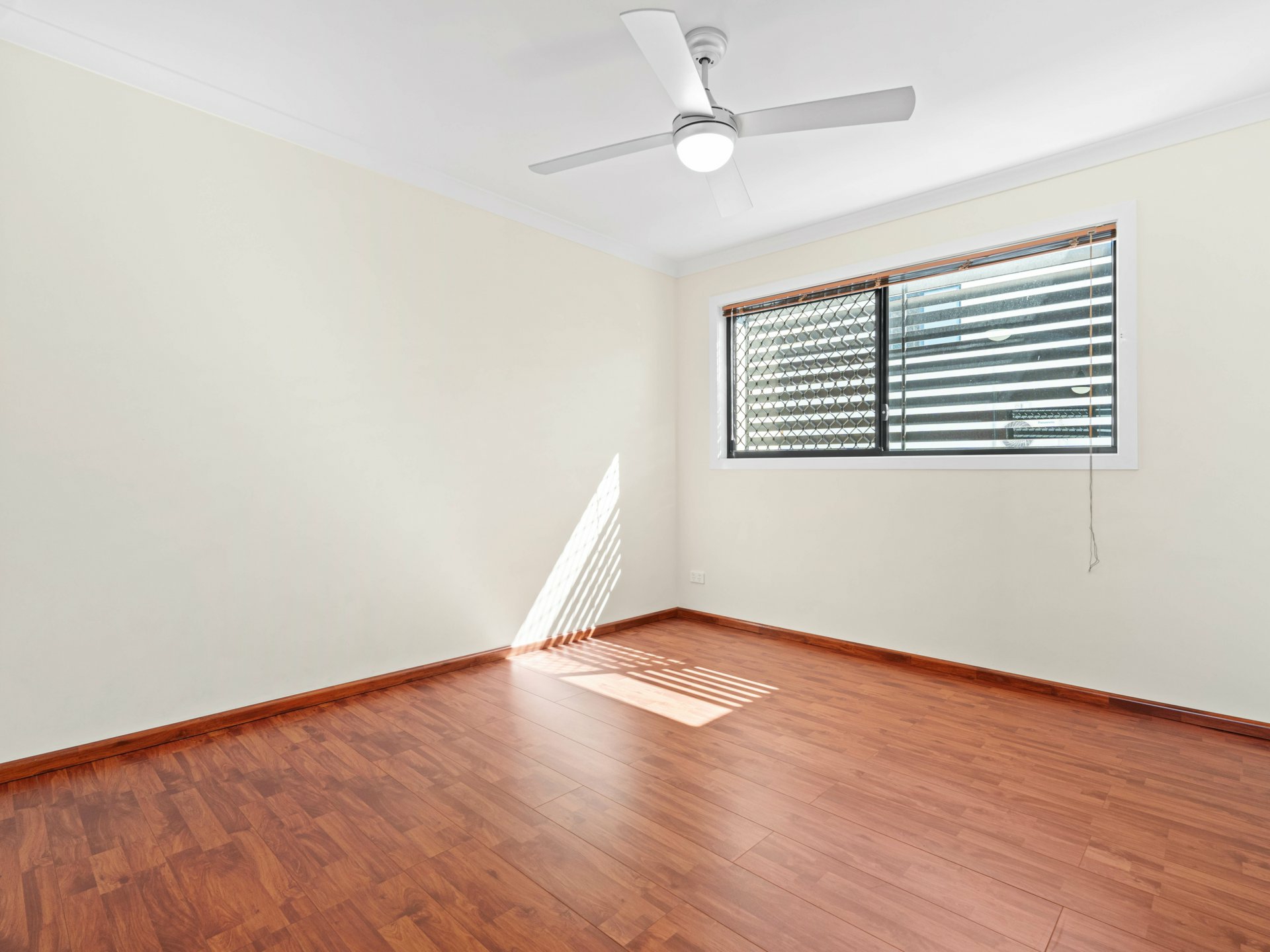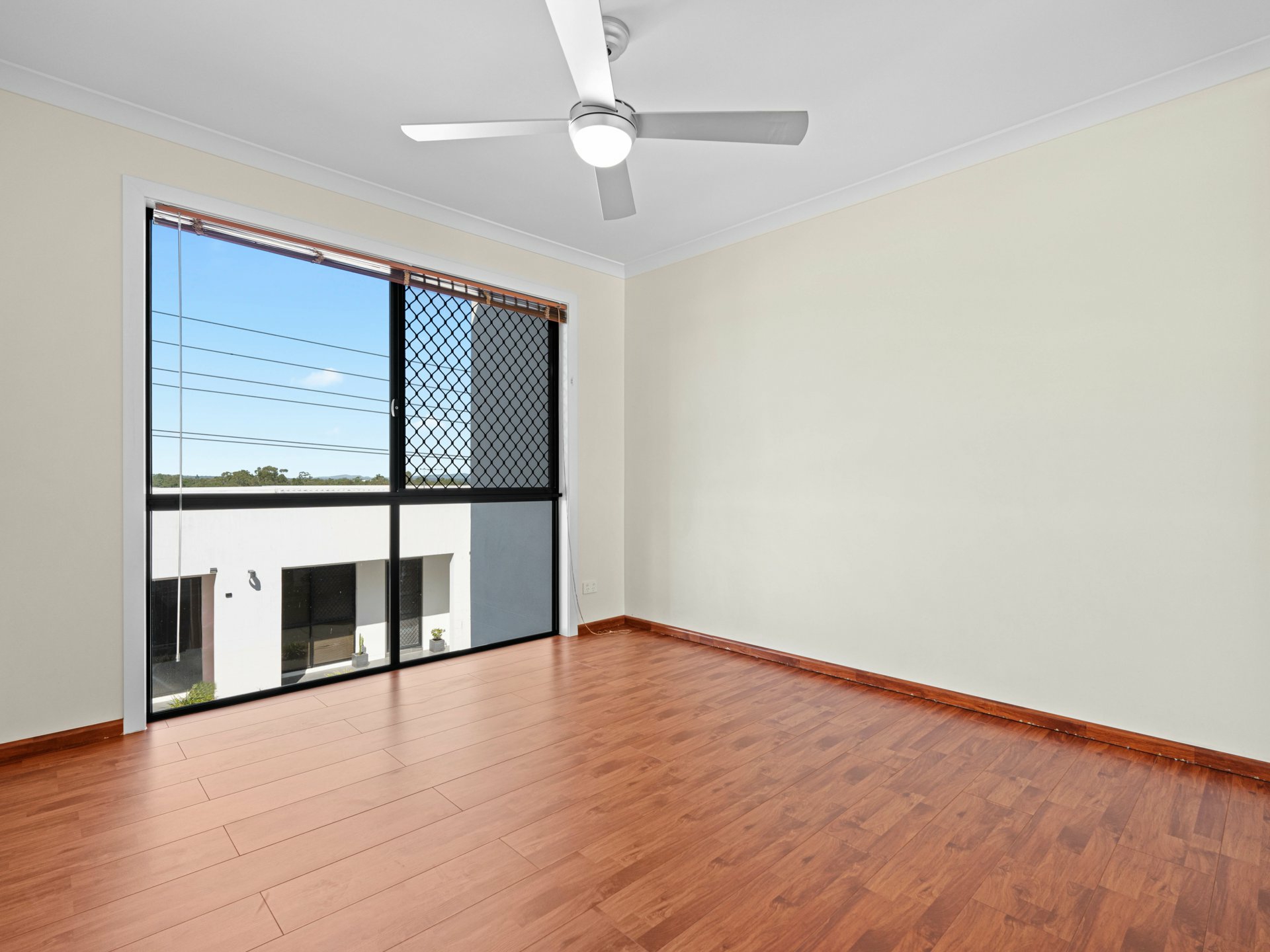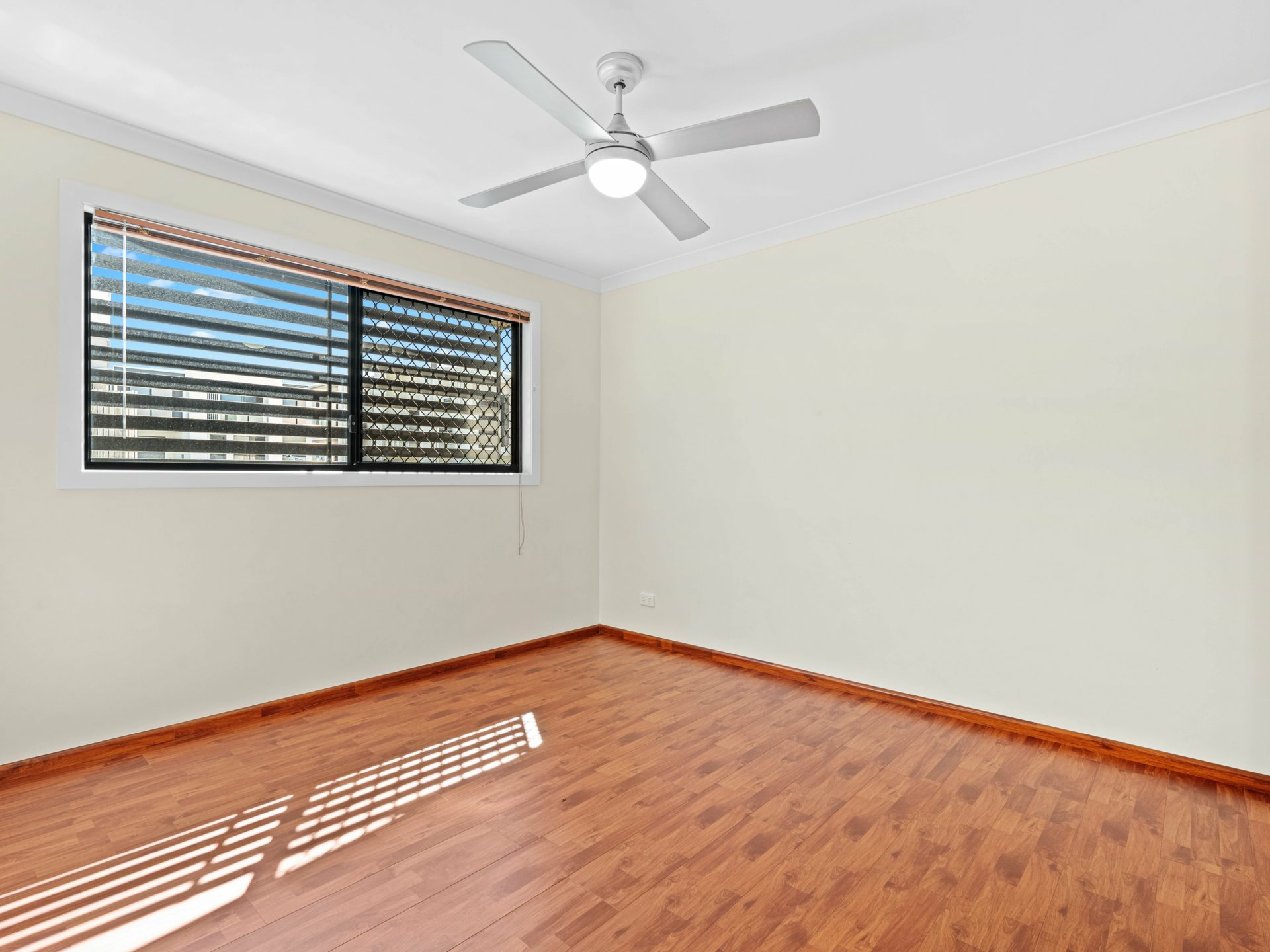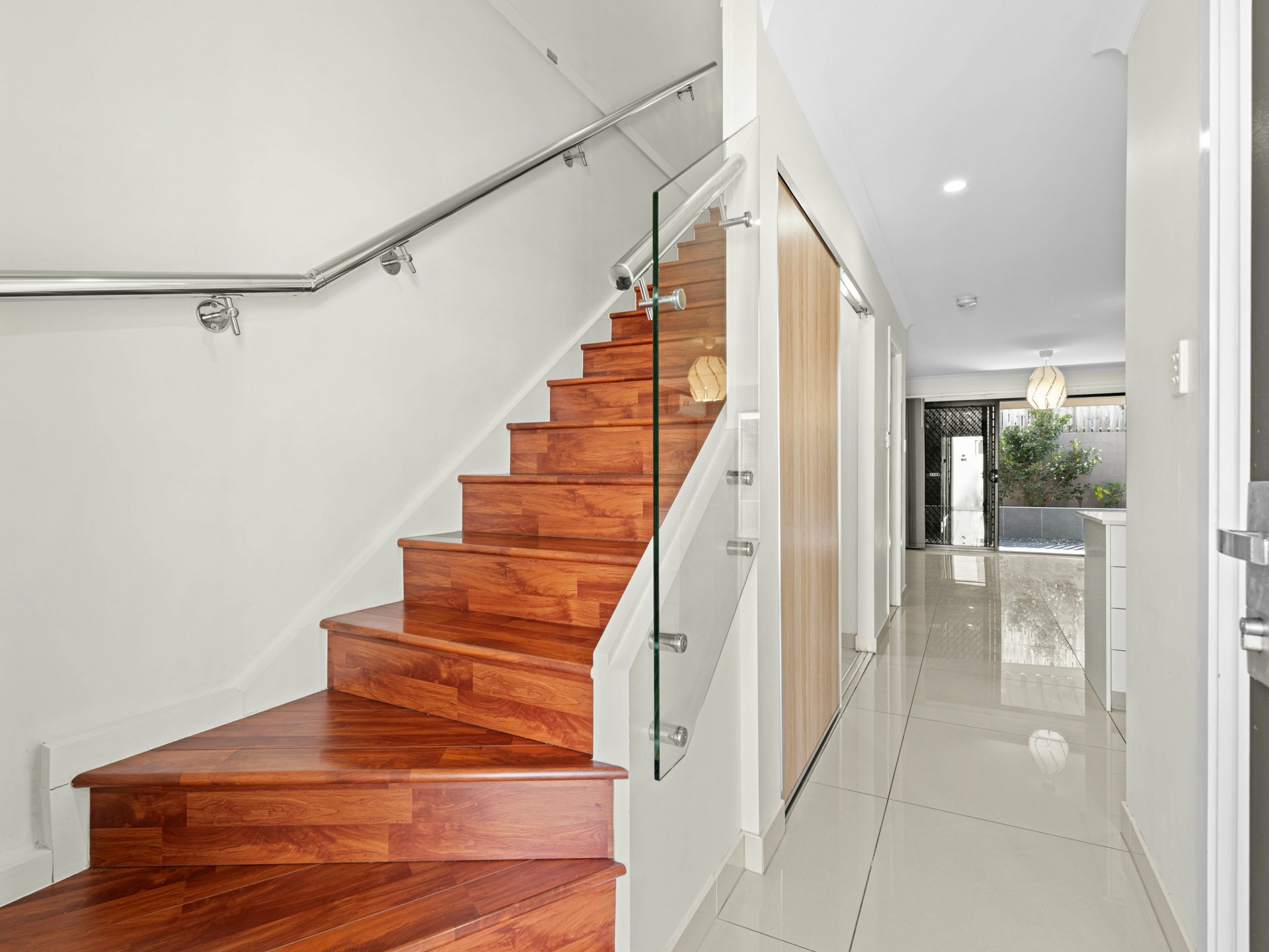 Connecting the 2 floors is a flash, timber-floored staircase with low-profile steel handrail and glass balustrade. The timber continues underfoot through 4 fan-cooled bedrooms, 3 with BIRs sharing a full-height tiled family bathroom, and a larger master with its own balcony, a WIR and chic ensuite with a shower, also full-height tiled.