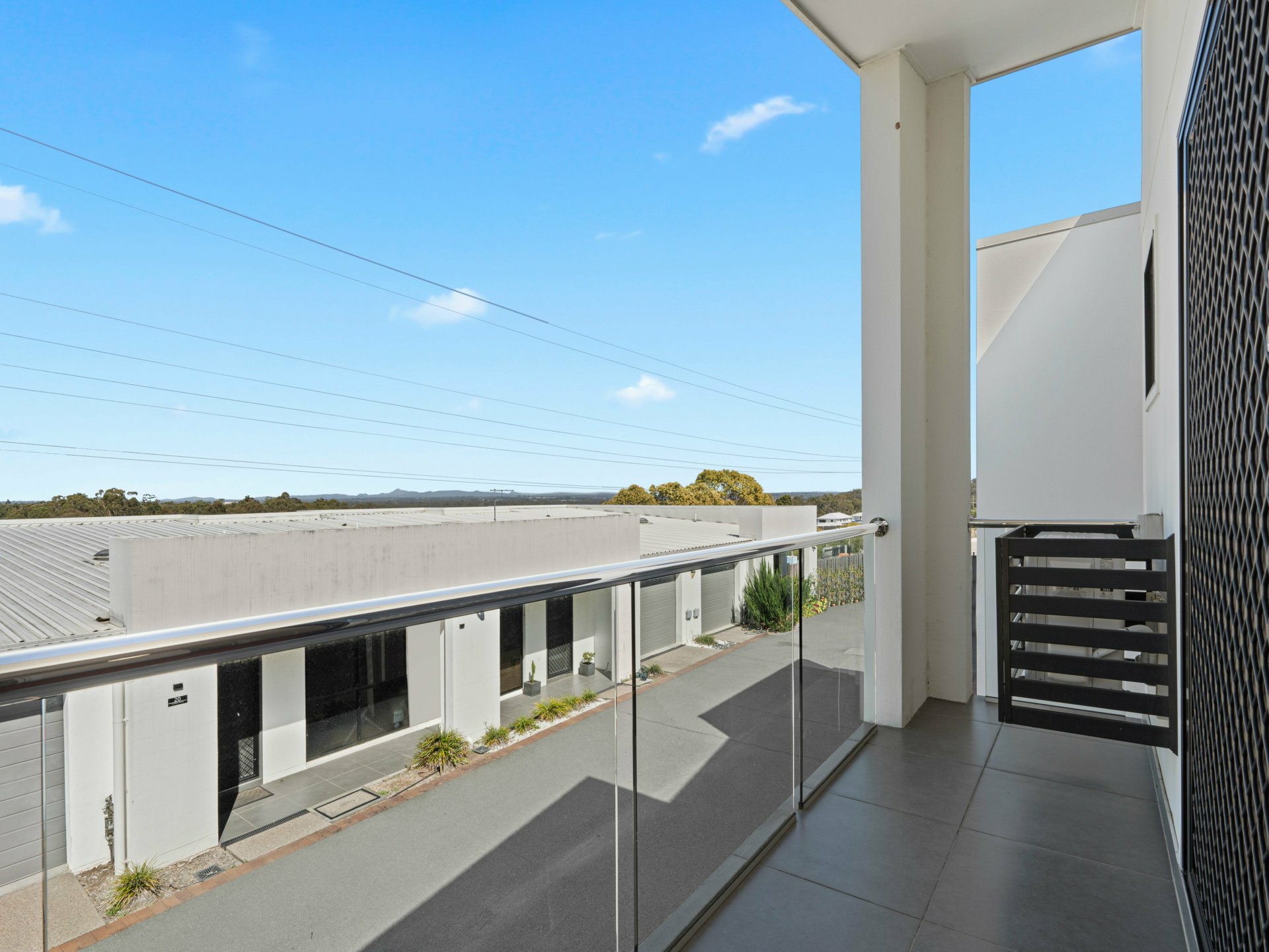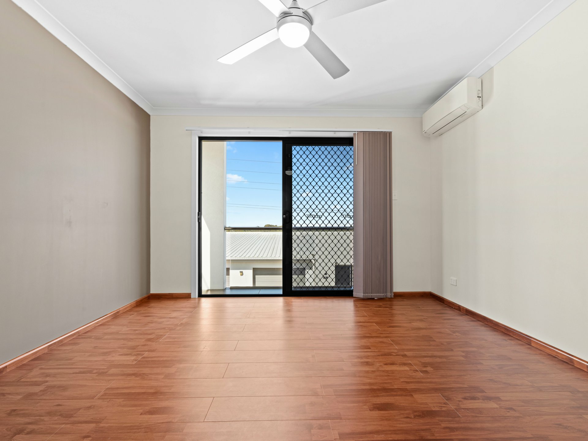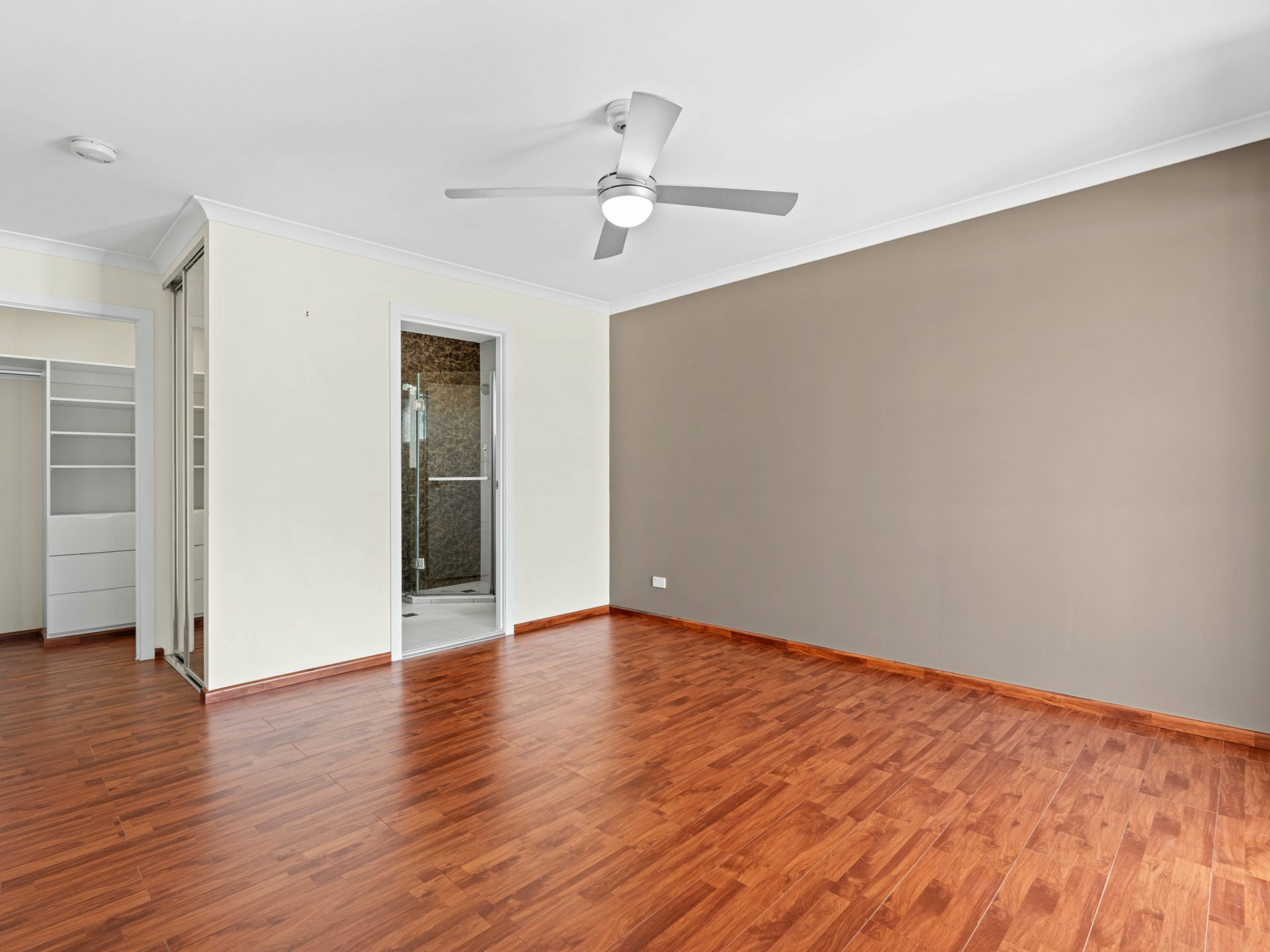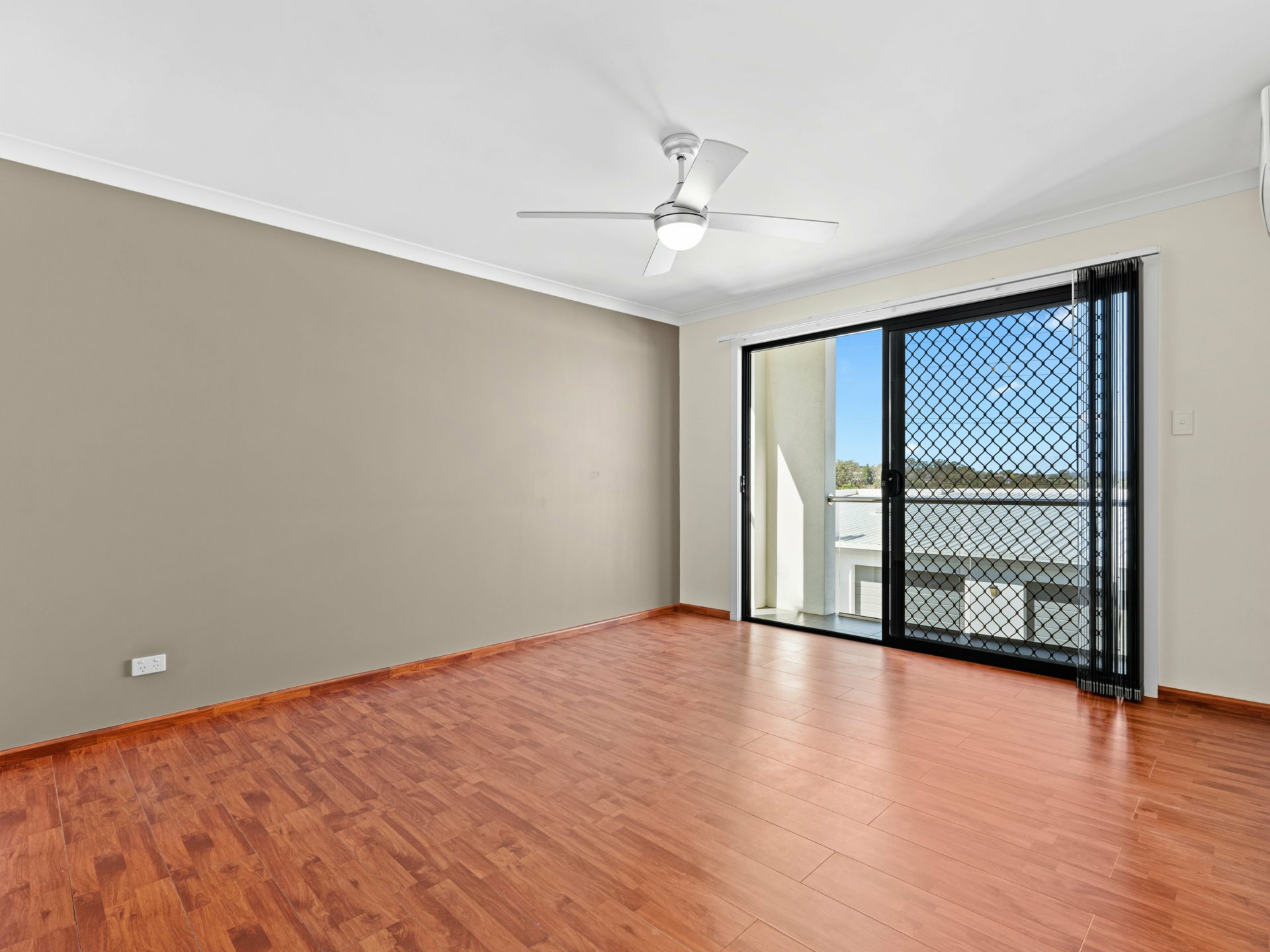 Connecting the 2 floors is a flash, timber-floored staircase with low-profile steel handrail and glass balustrade. The timber continues underfoot through 4 fan-cooled bedrooms, 3 with BIRs sharing a full-height tiled family bathroom, and a larger master with its own balcony, a WIR and chic ensuite with a shower, also full-height tiled.