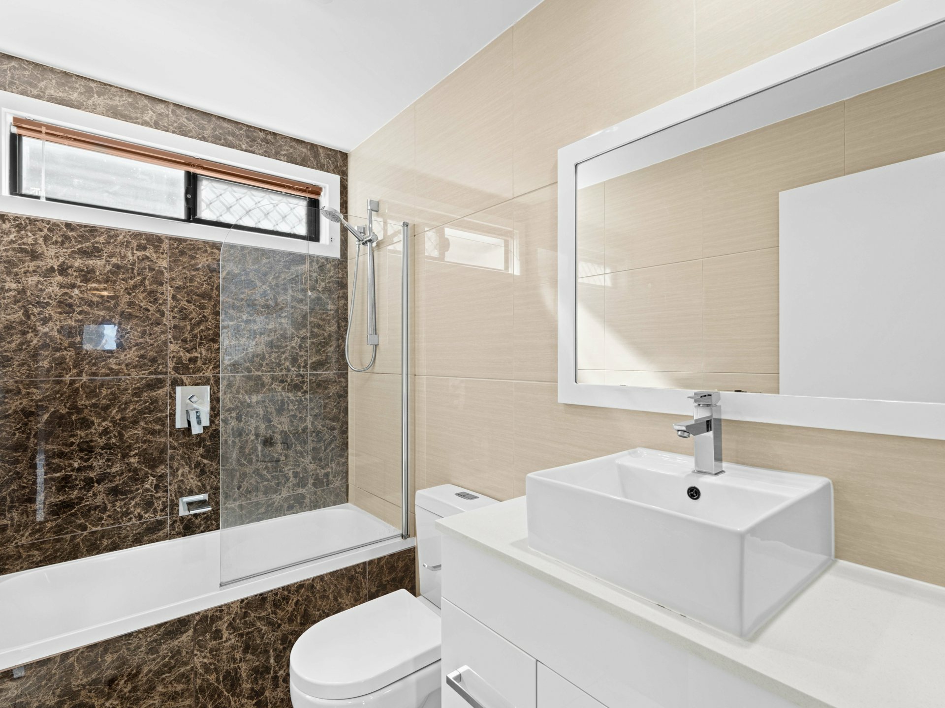 - Another full-height tiled bathroom upstairs (shower/tub combo) + a powder room below