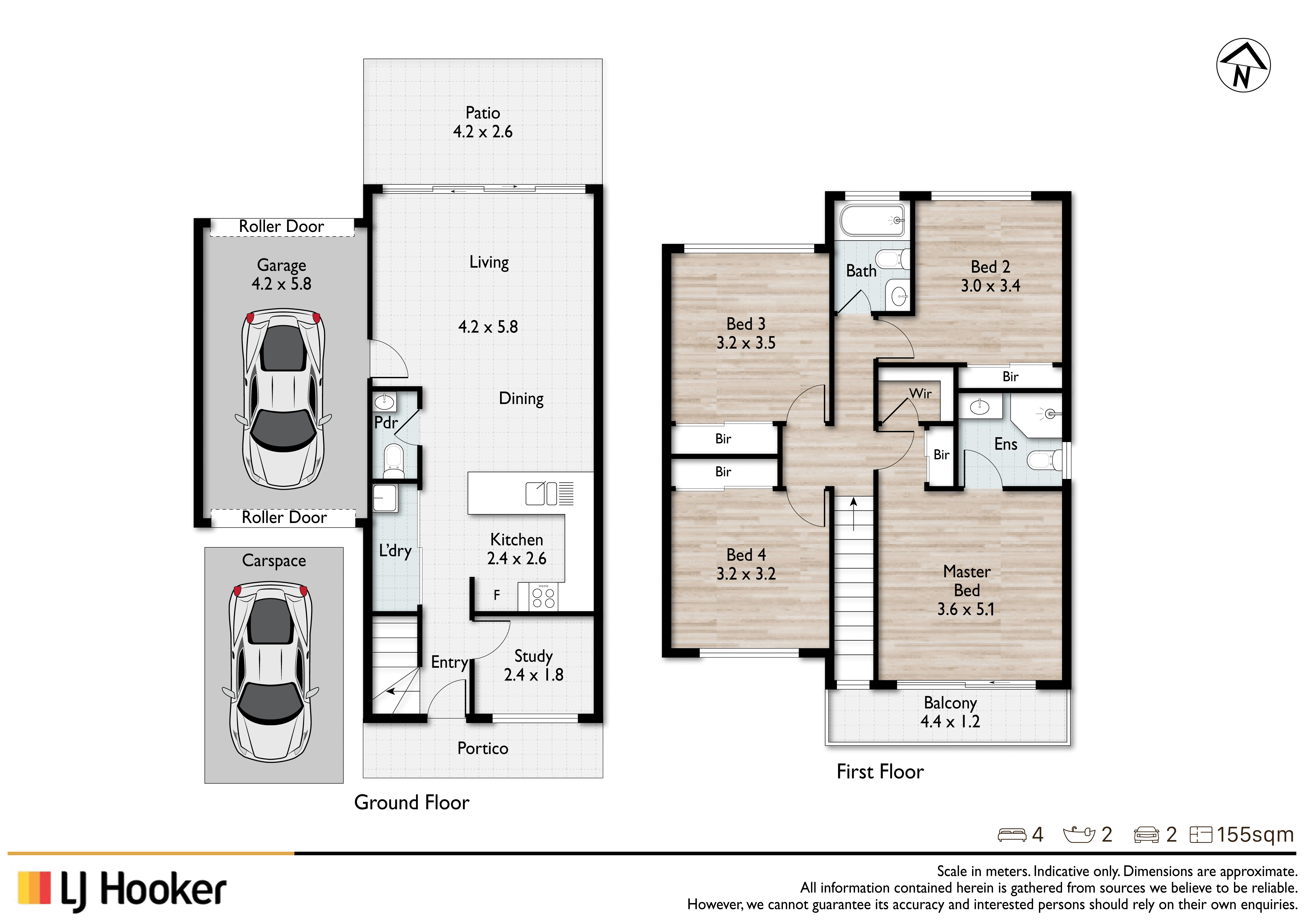- 4 timber-floored beds above with fans & BIRs, master also has a WIR, A/C, ensuite & balcony