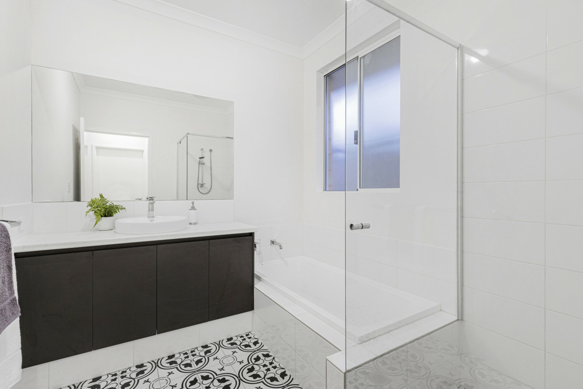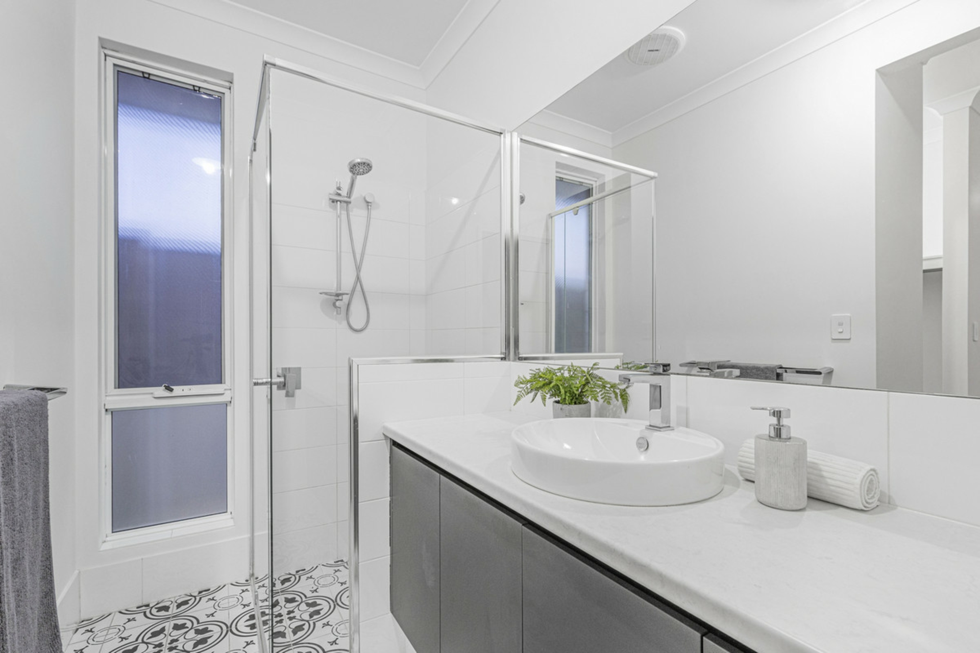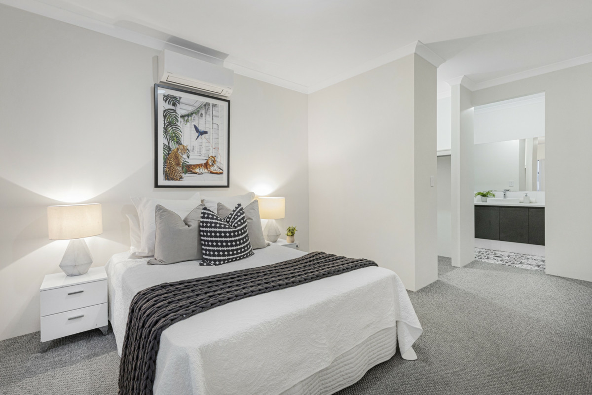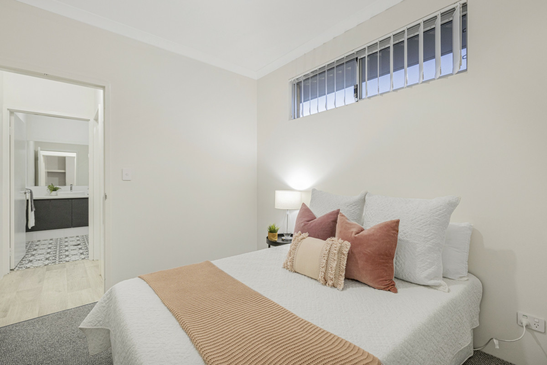 All three bedrooms are positioned toward the front of the home, creating a quiet and private zone away from the main living areas. The main bedroom features a walk-in robe that leads through to a light, open ensuite finished with stone benchtops, while the additional bedrooms are well sized and include built-in robes. The main bathroom follows the same clean, modern style with stone surfaces, a full-size bath and separate shower.