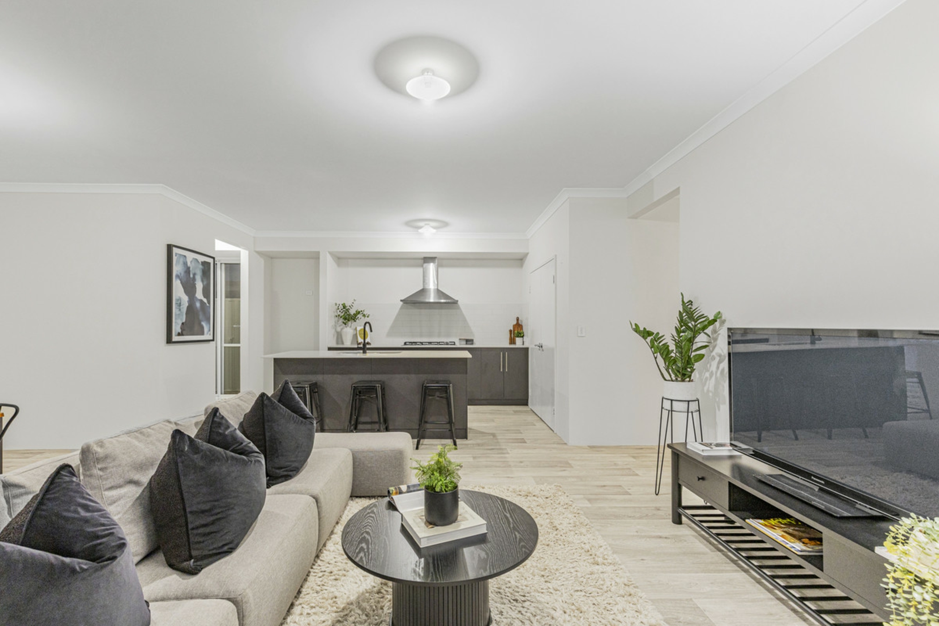 Toward the rear of the home, the kitchen and living area form the heart of the space. The kitchen is finished with stone benchtops and modern appliances, overlooking the open-plan living and dining area and connecting seamlessly to the alfresco and easy-care courtyard.