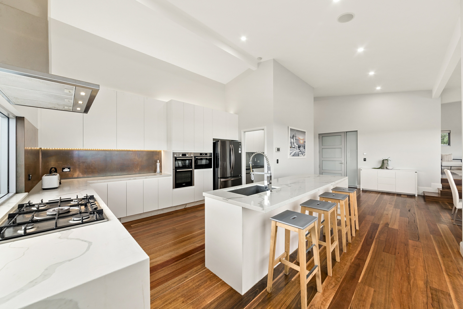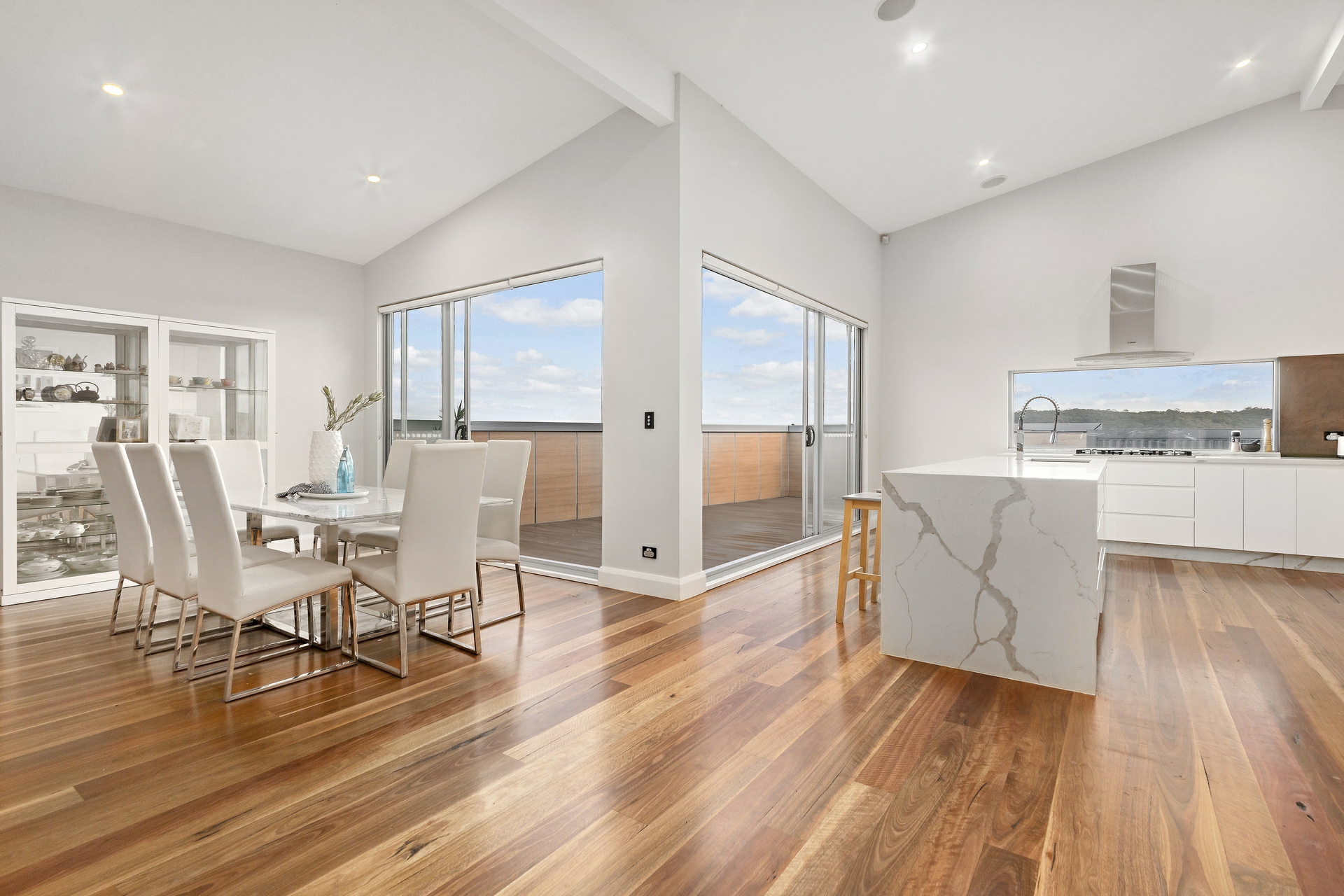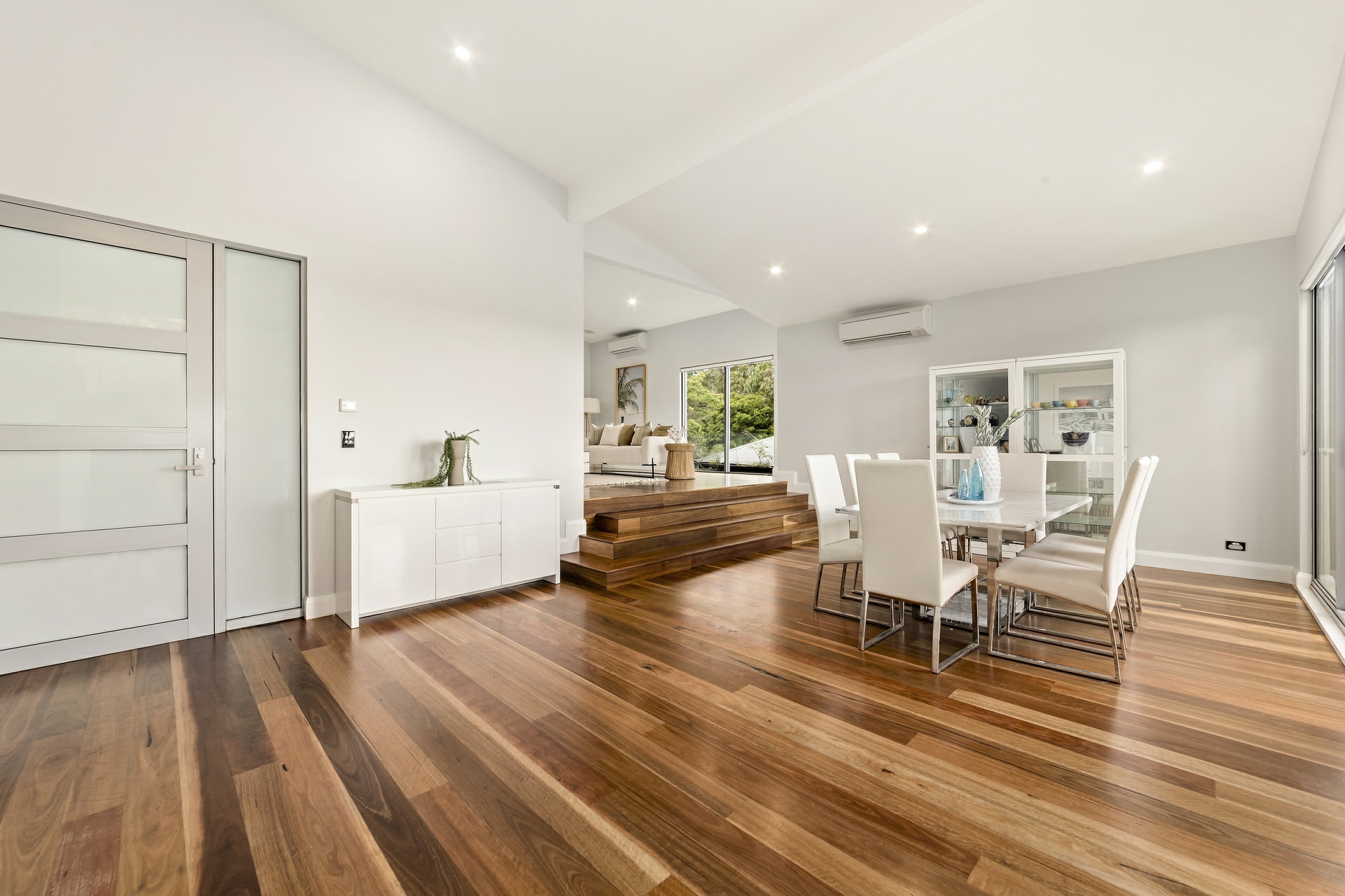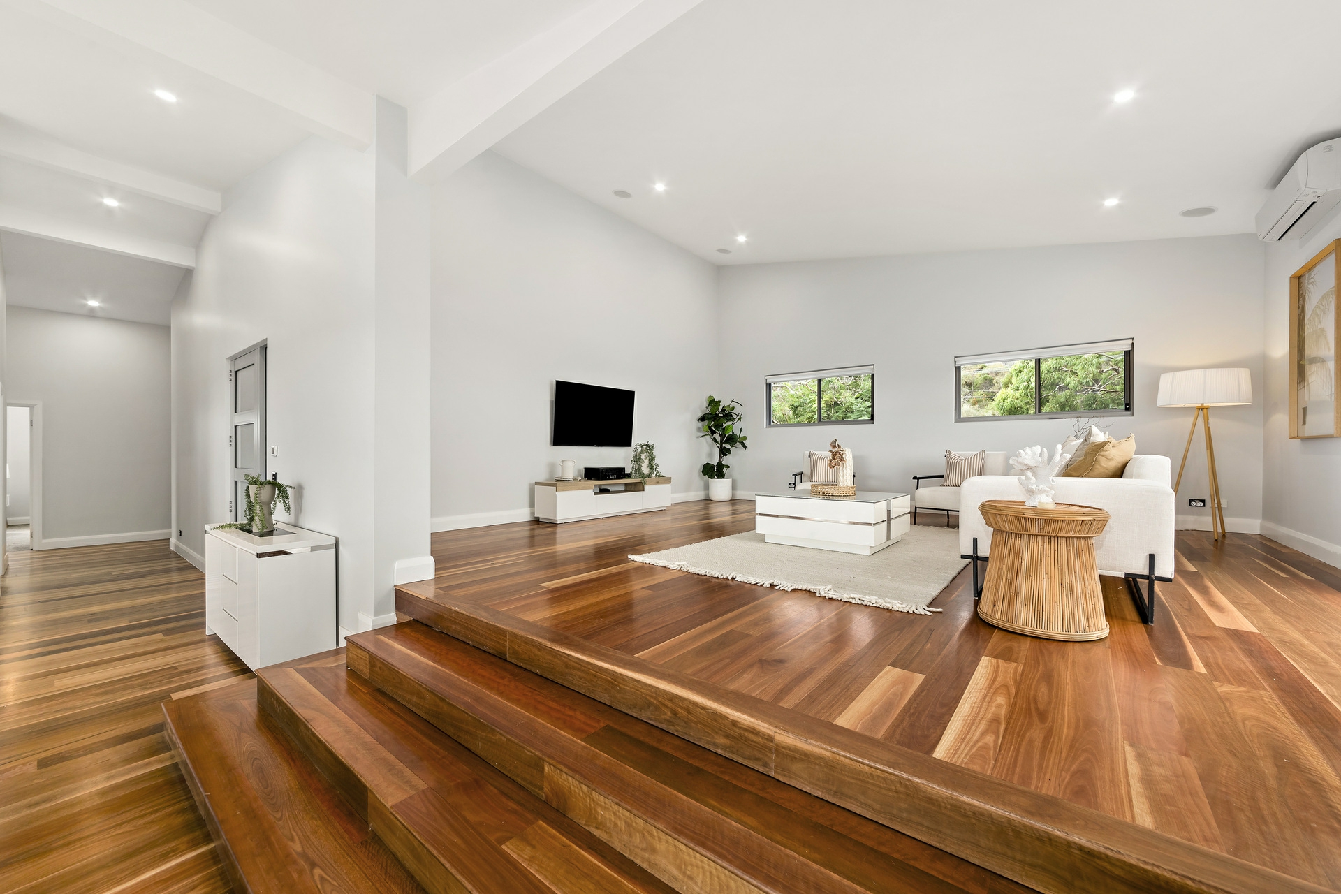 - Soaring raked ceilings, timber flooring, air con and surround sound