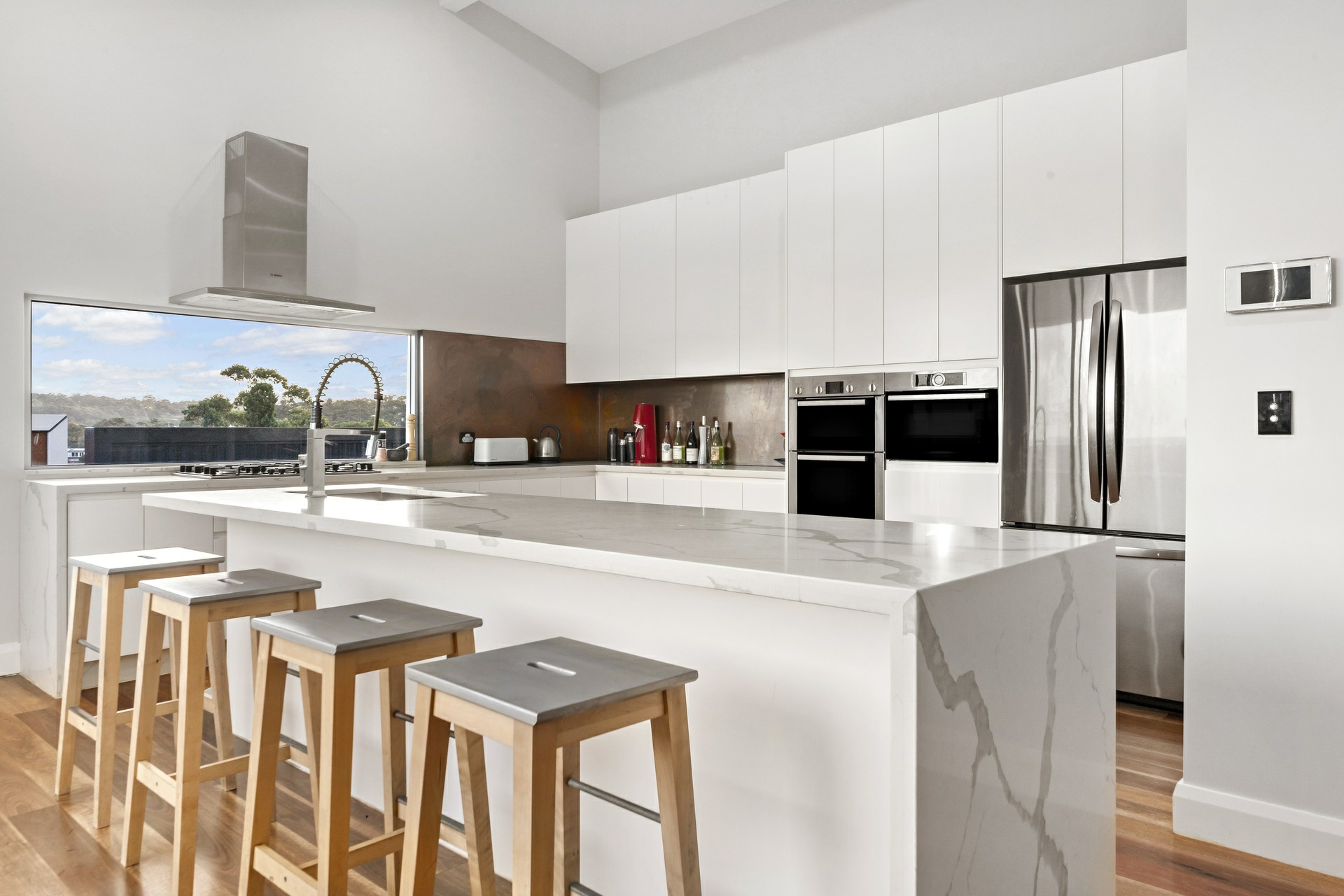 - Sleek marble-look stone island kitchen, gas cooktop, wall and steam ovens