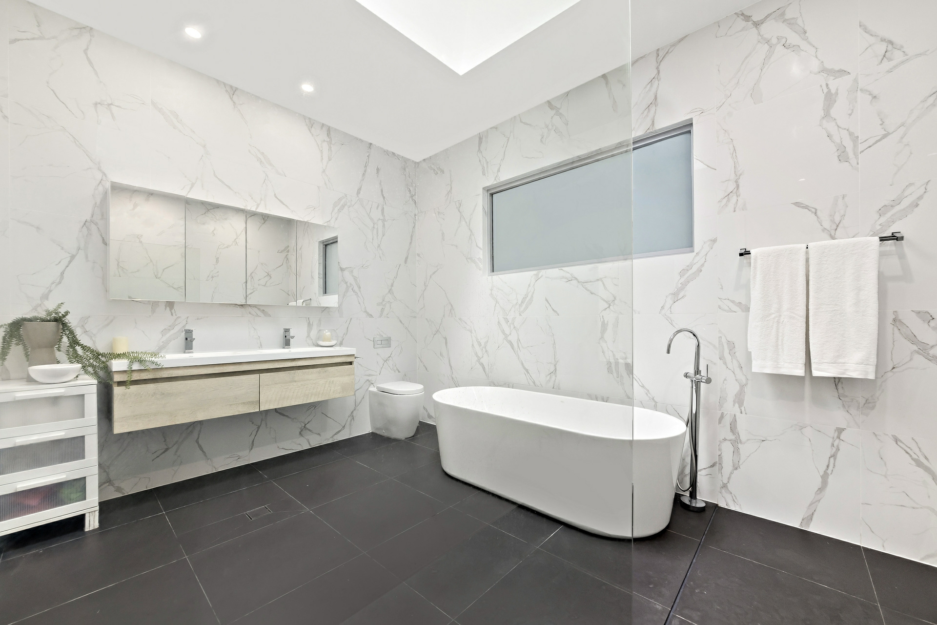 - Ultra-chic bathrooms, main with a standalone bath and twin wash basins