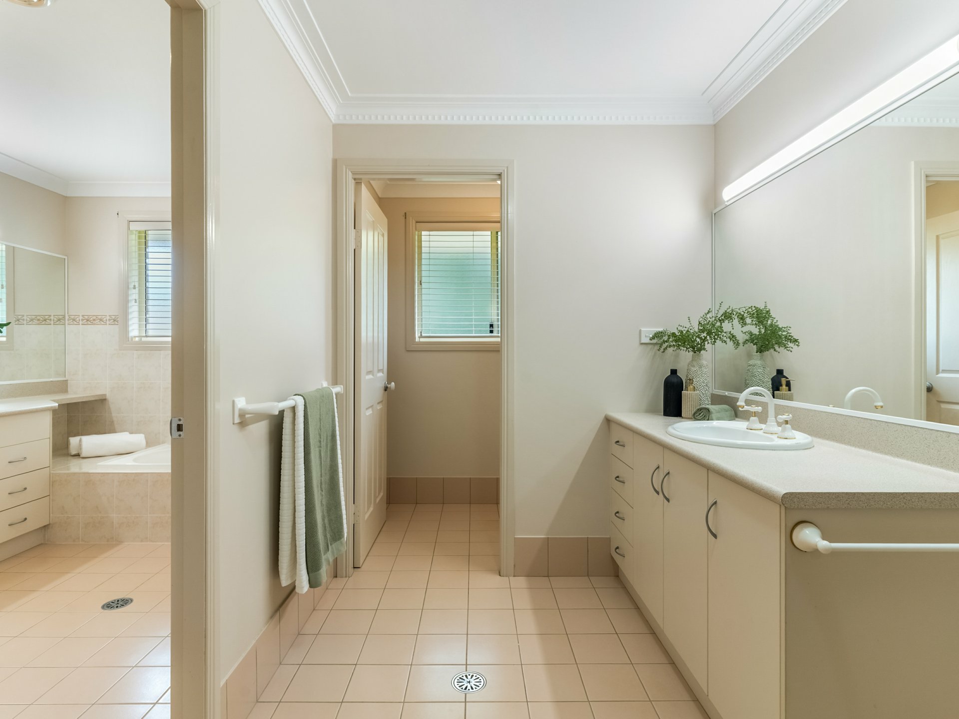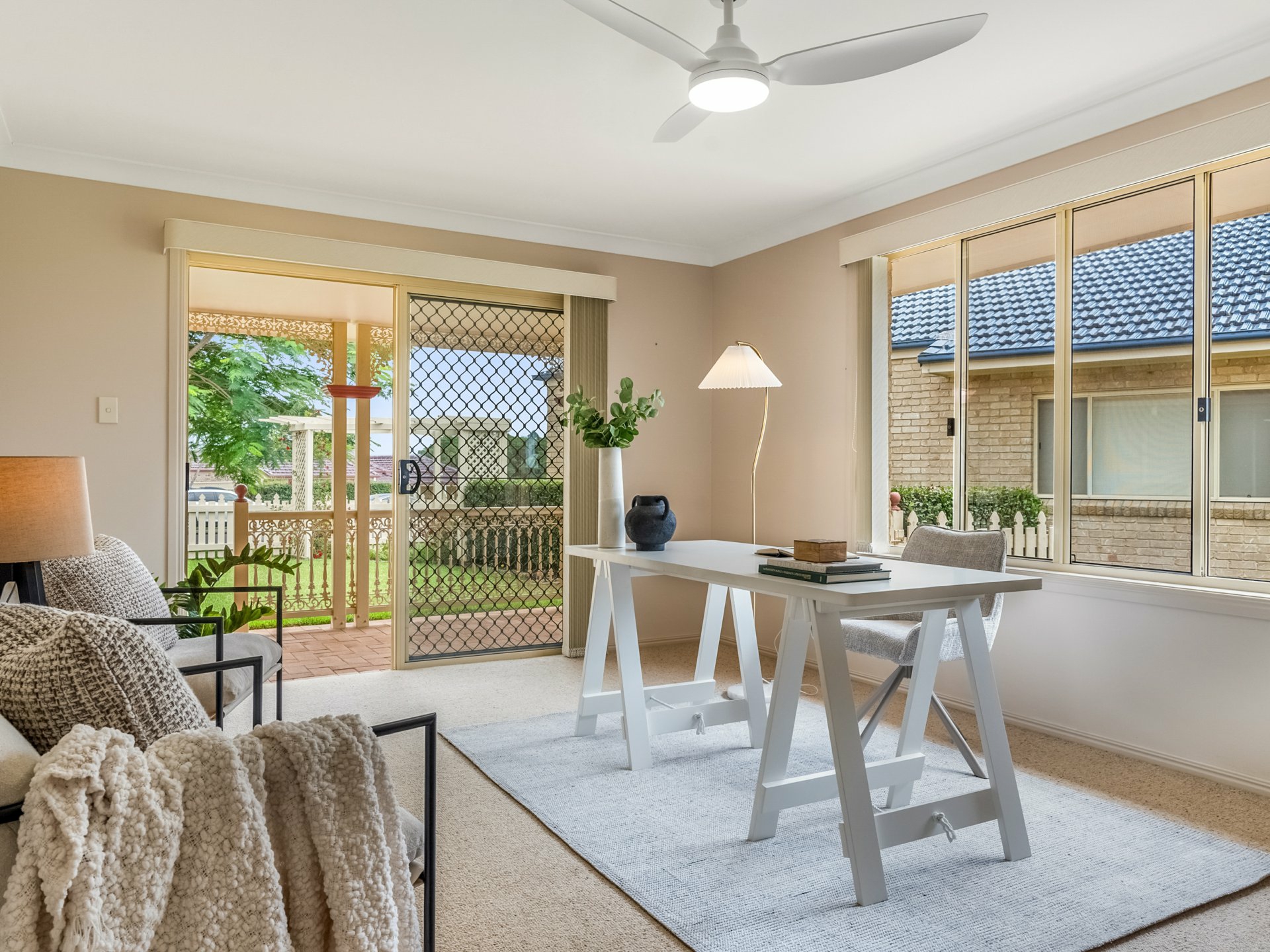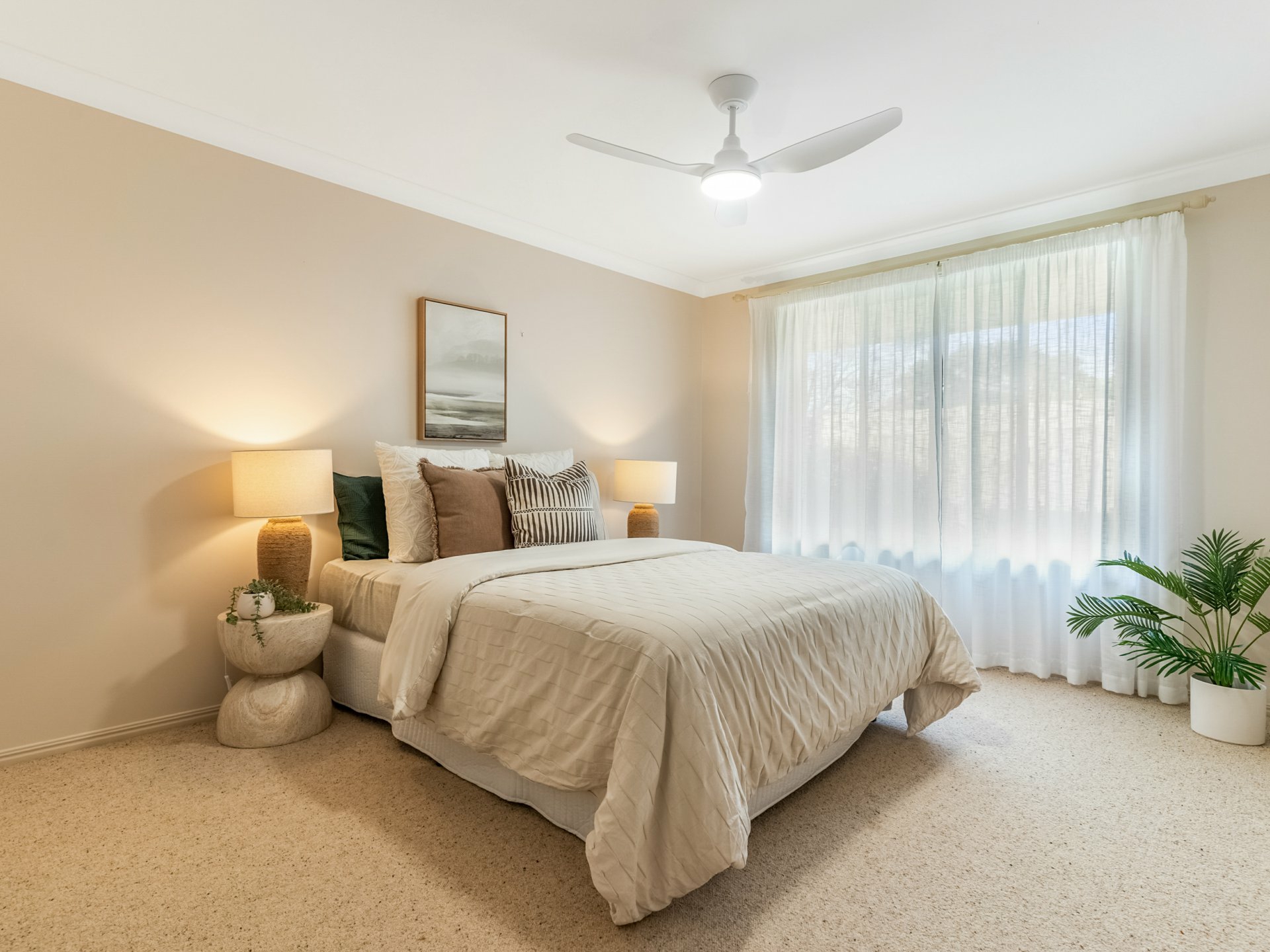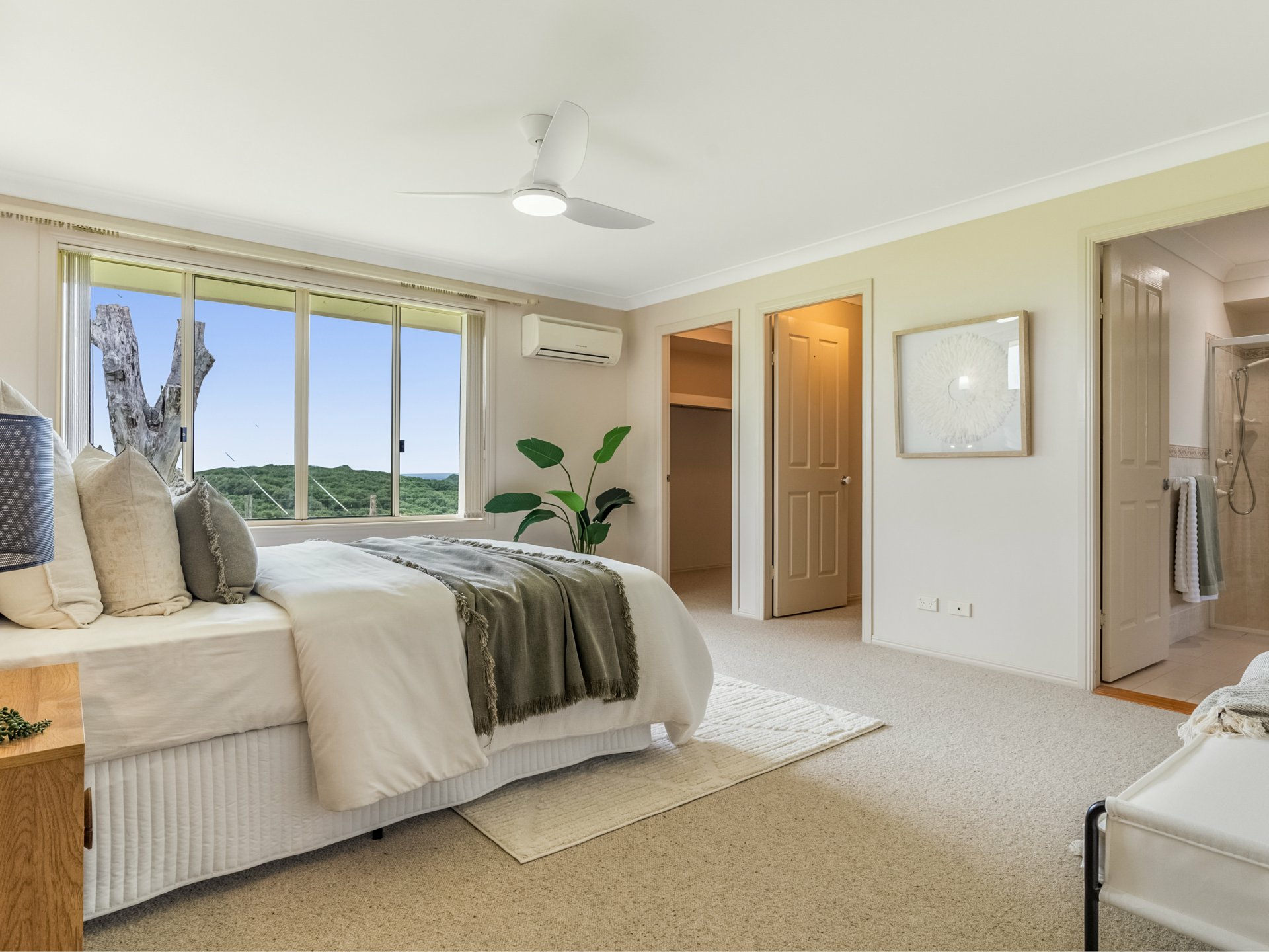 Main bedroom enjoys coastal views and features twin walk-in wardrobes, an ensuite, ceiling fan, and air-conditioning. 2 additional generous bedrooms with built-in robes and ceiling fans are serviced by a convenient main bathroom with a separate toilet and second vanity functioning as a powder room. The 4th bedroom offers flexible use, with a large sliding door opening to the fully fenced front yard, ideal for a home office.