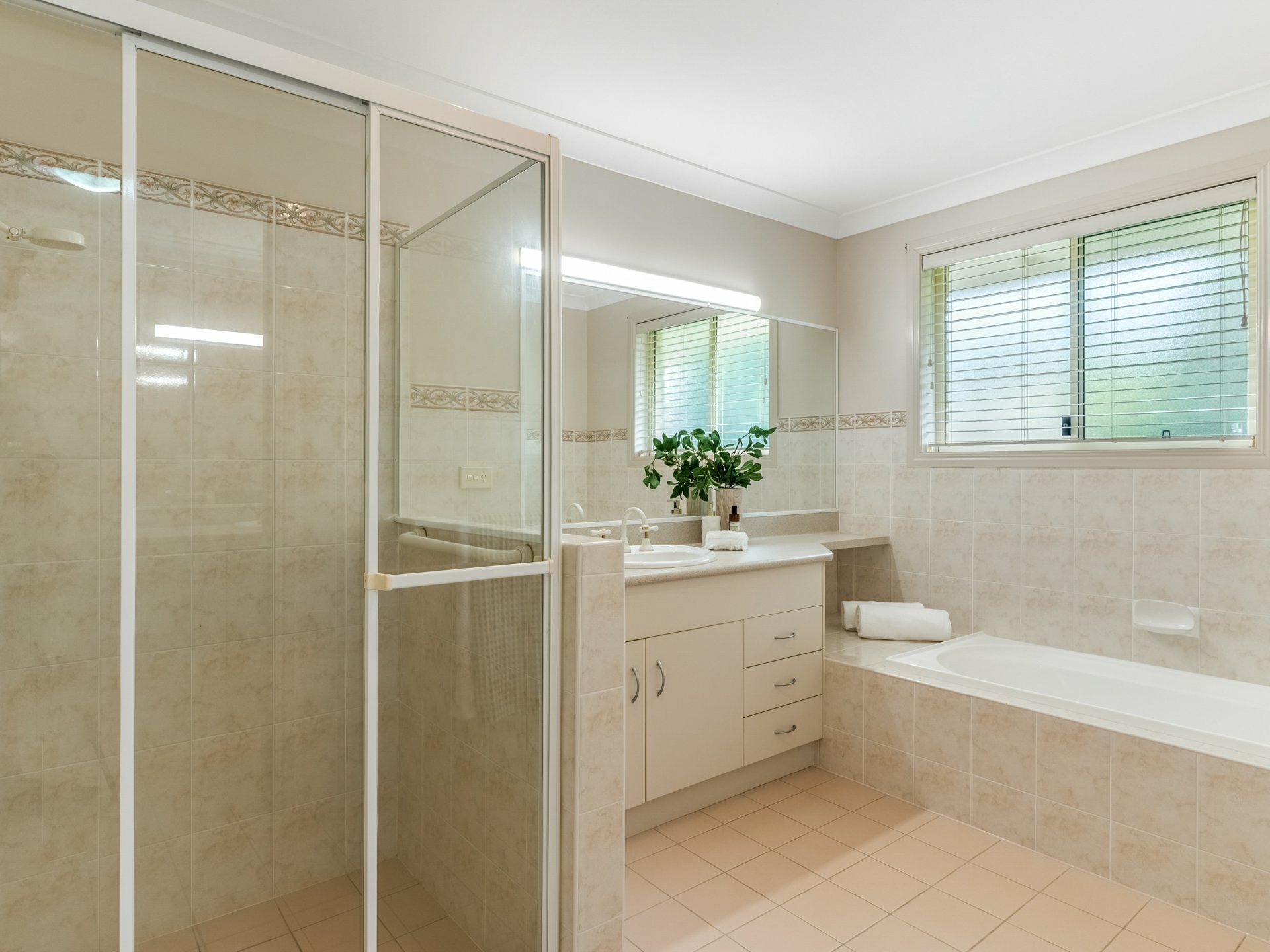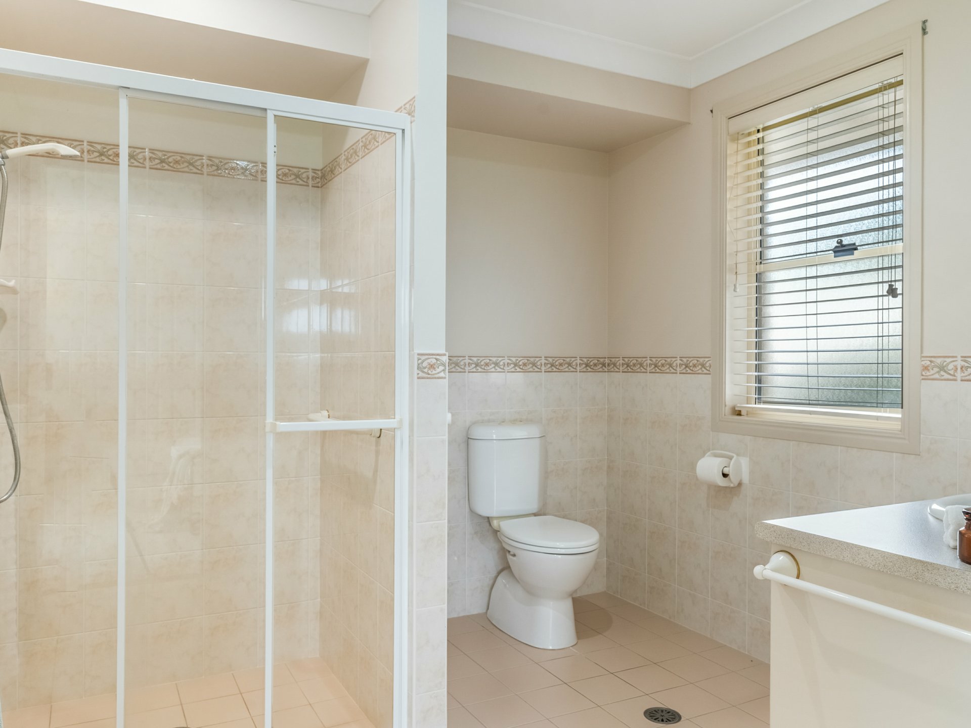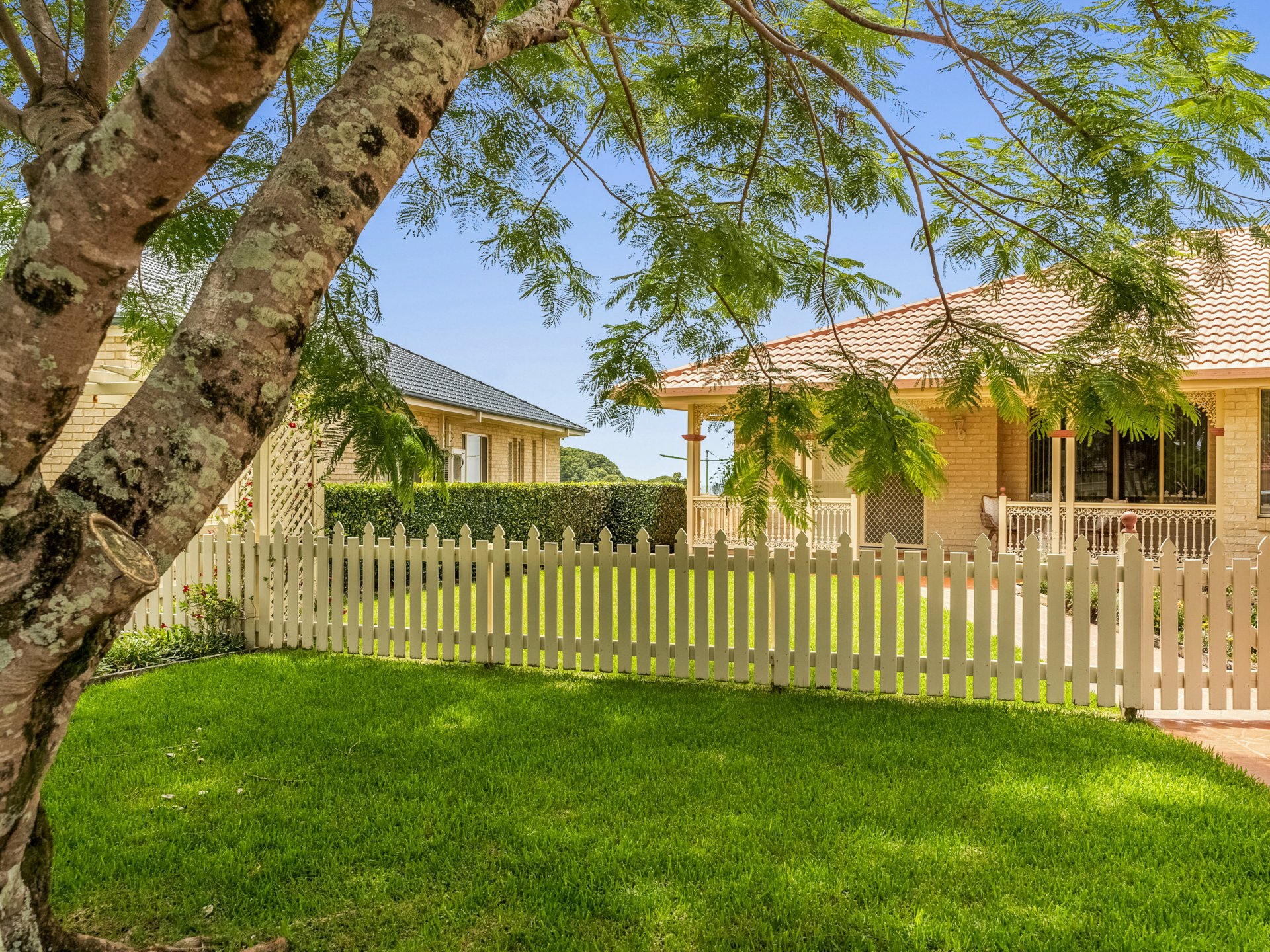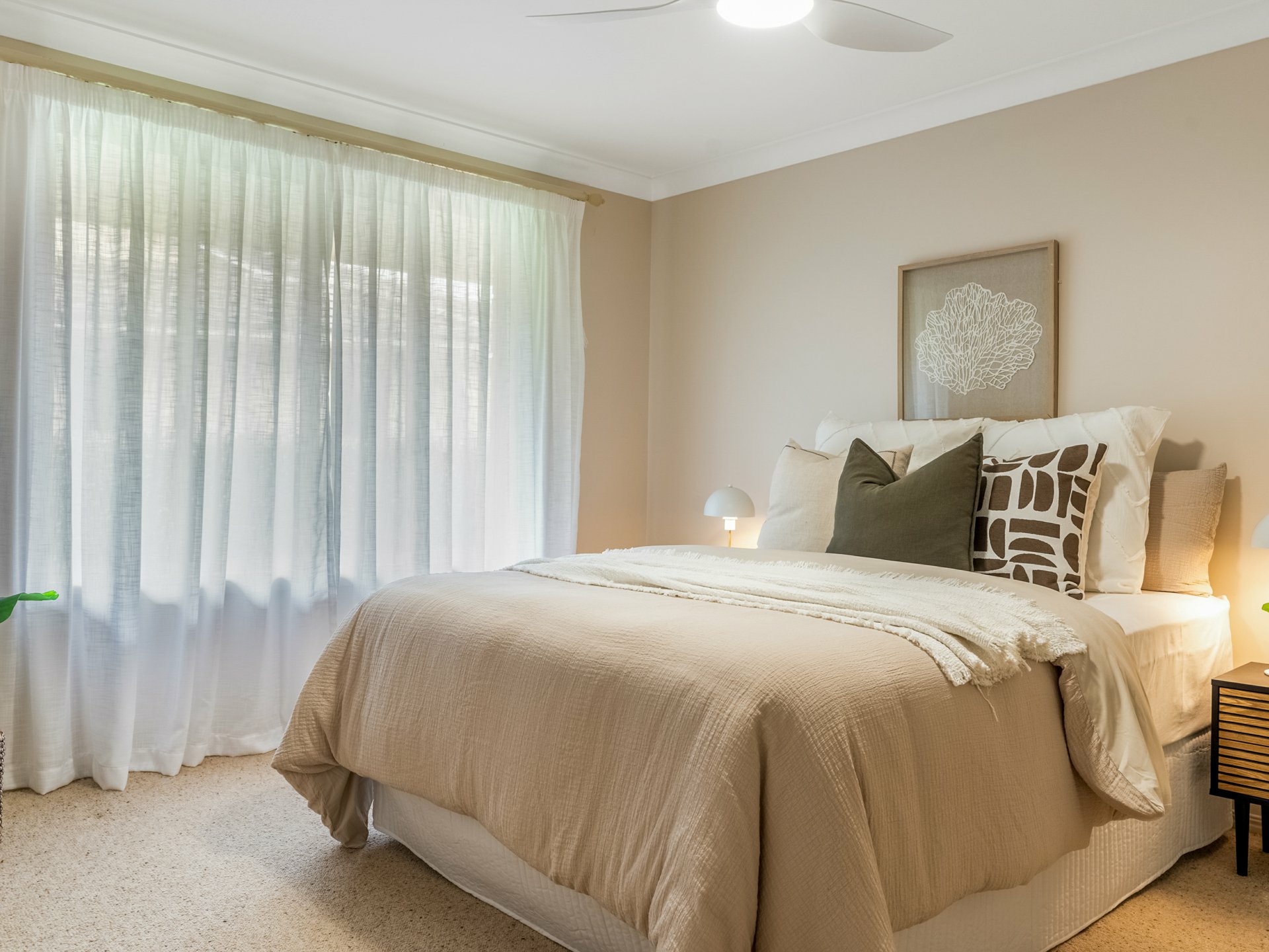 Main bedroom enjoys coastal views and features twin walk-in wardrobes, an ensuite, ceiling fan, and air-conditioning. 2 additional generous bedrooms with built-in robes and ceiling fans are serviced by a convenient main bathroom with a separate toilet and second vanity functioning as a powder room. The 4th bedroom offers flexible use, with a large sliding door opening to the fully fenced front yard, ideal for a home office.