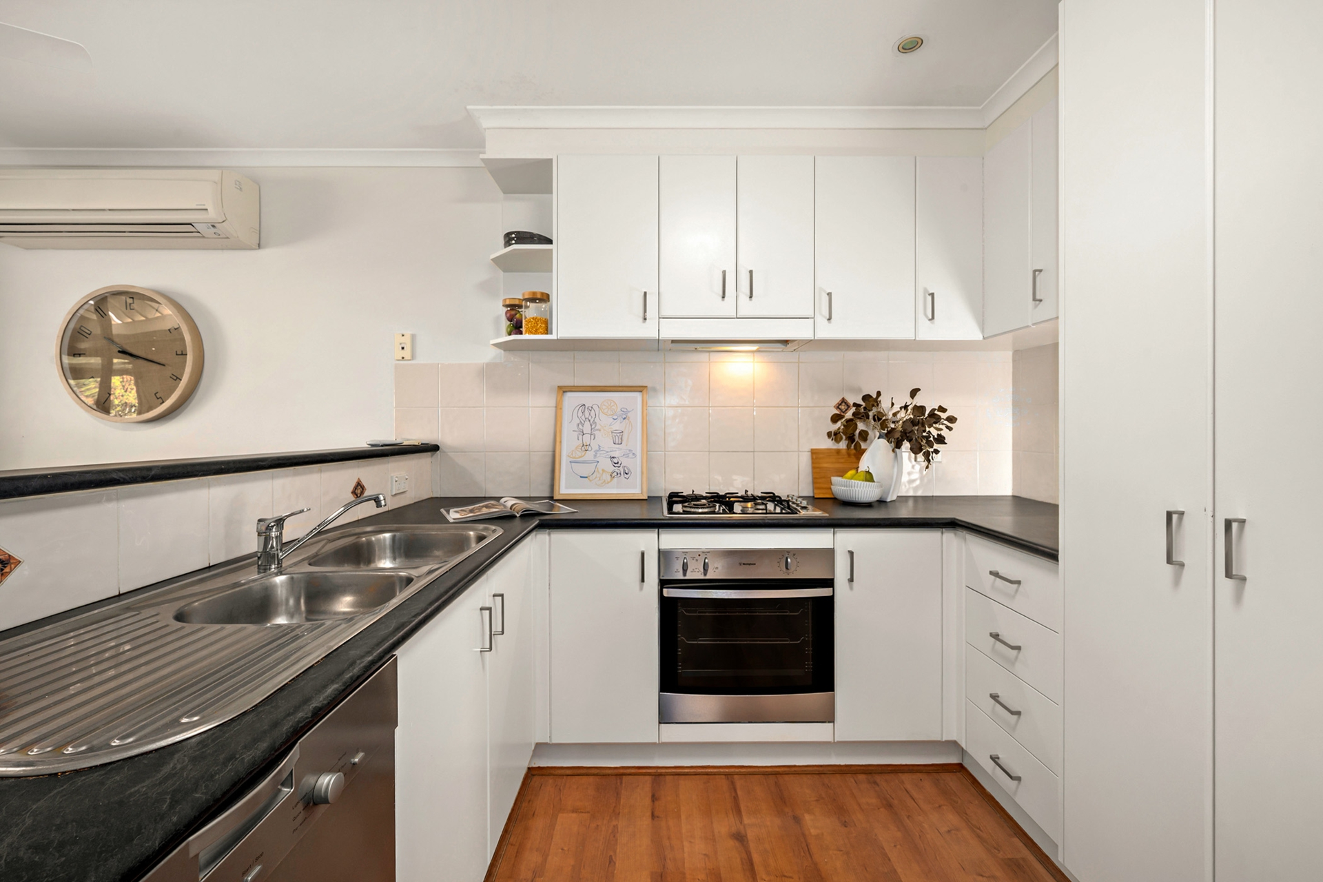 The property includes a superb wraparound kitchen with easy-clean benches, gas cook top, electric oven and dishwasher.