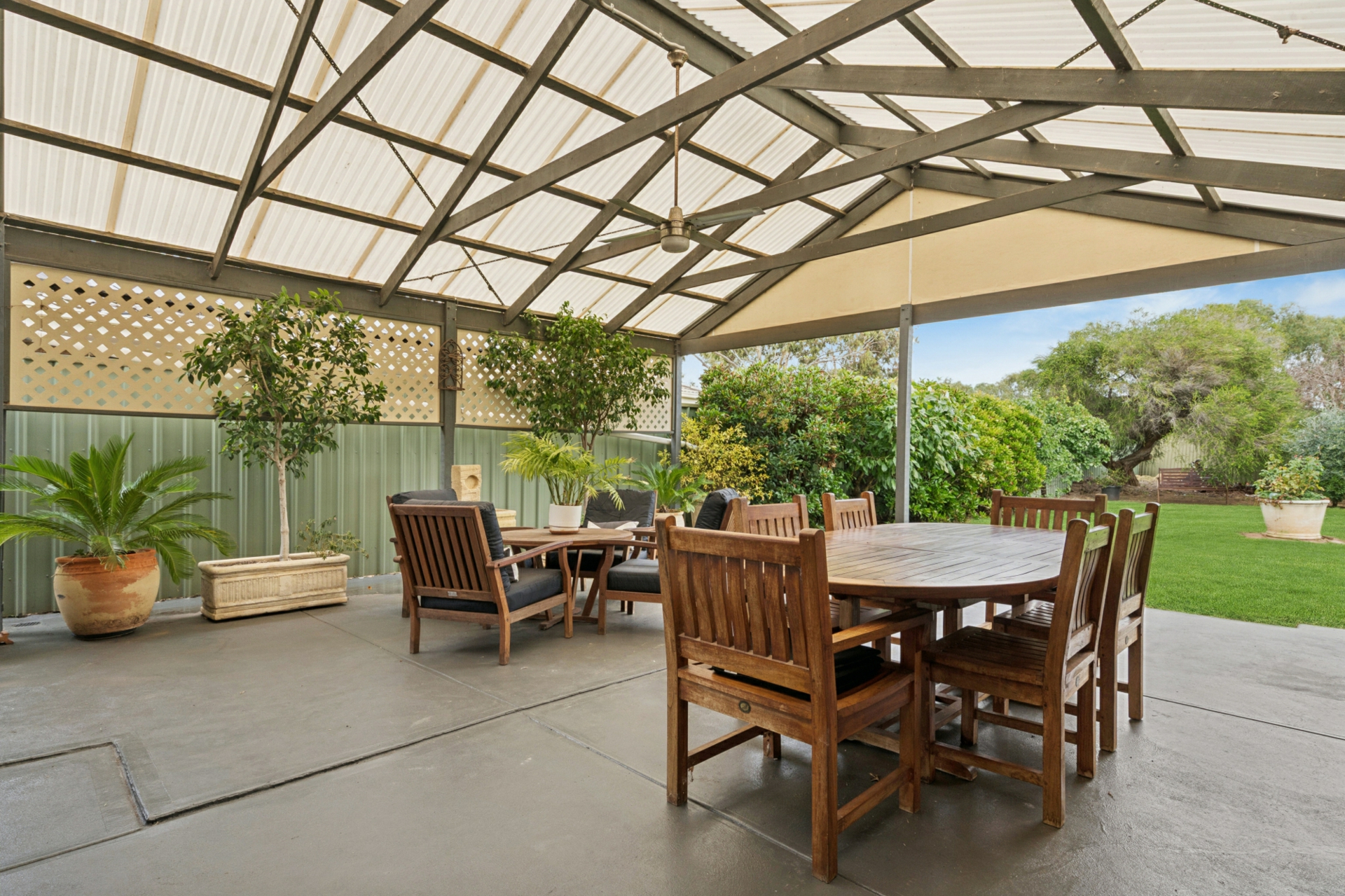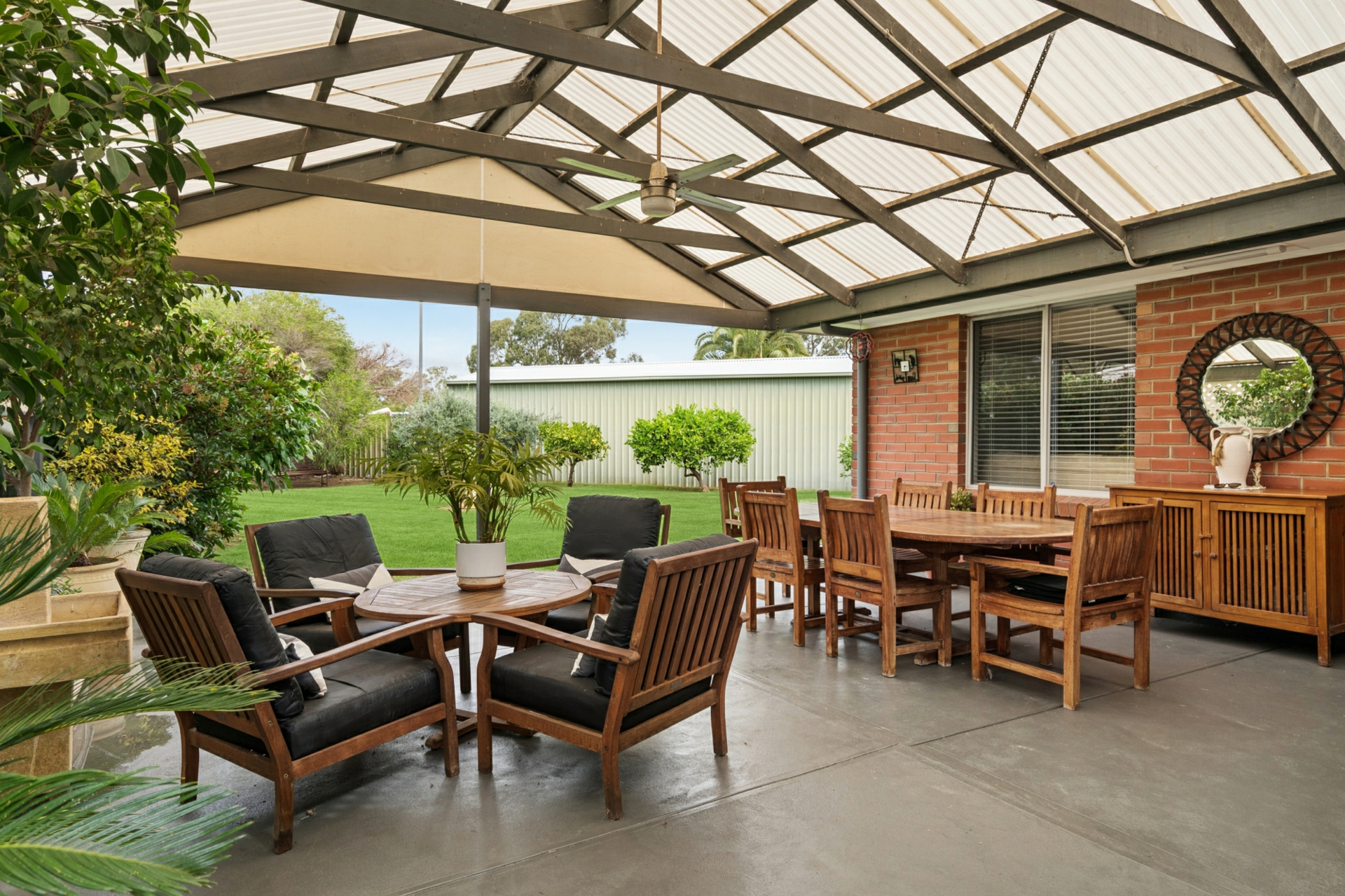 - Spacious outdoor entertaining area with pergola and ceiling fan