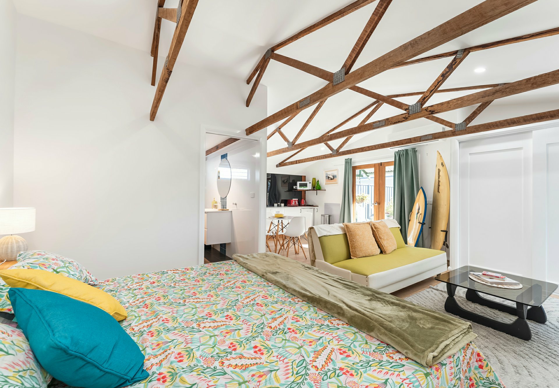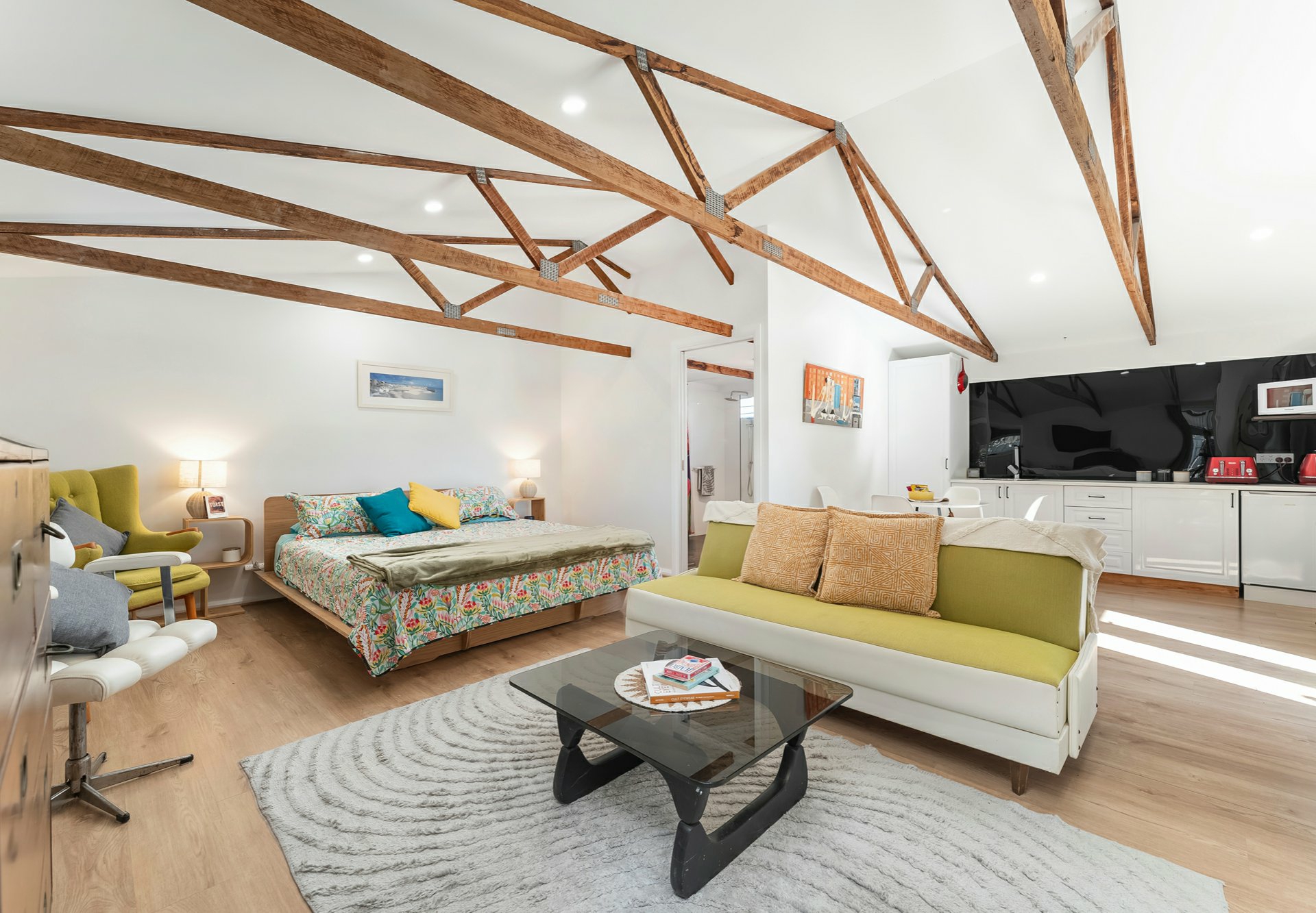 Out back, entertain under covered alfresco spaces while the kids splash in the pool. The separate studio is a total bonus with its own kitchenette, bathroom and generous open plan bedroom/living area under striking exposed trusses.