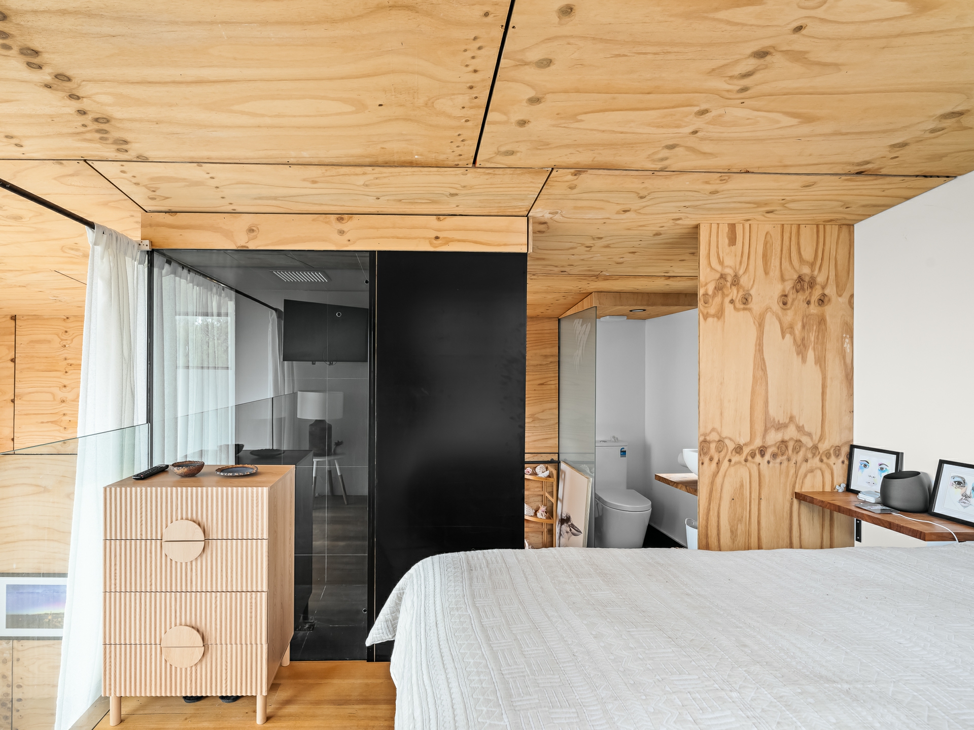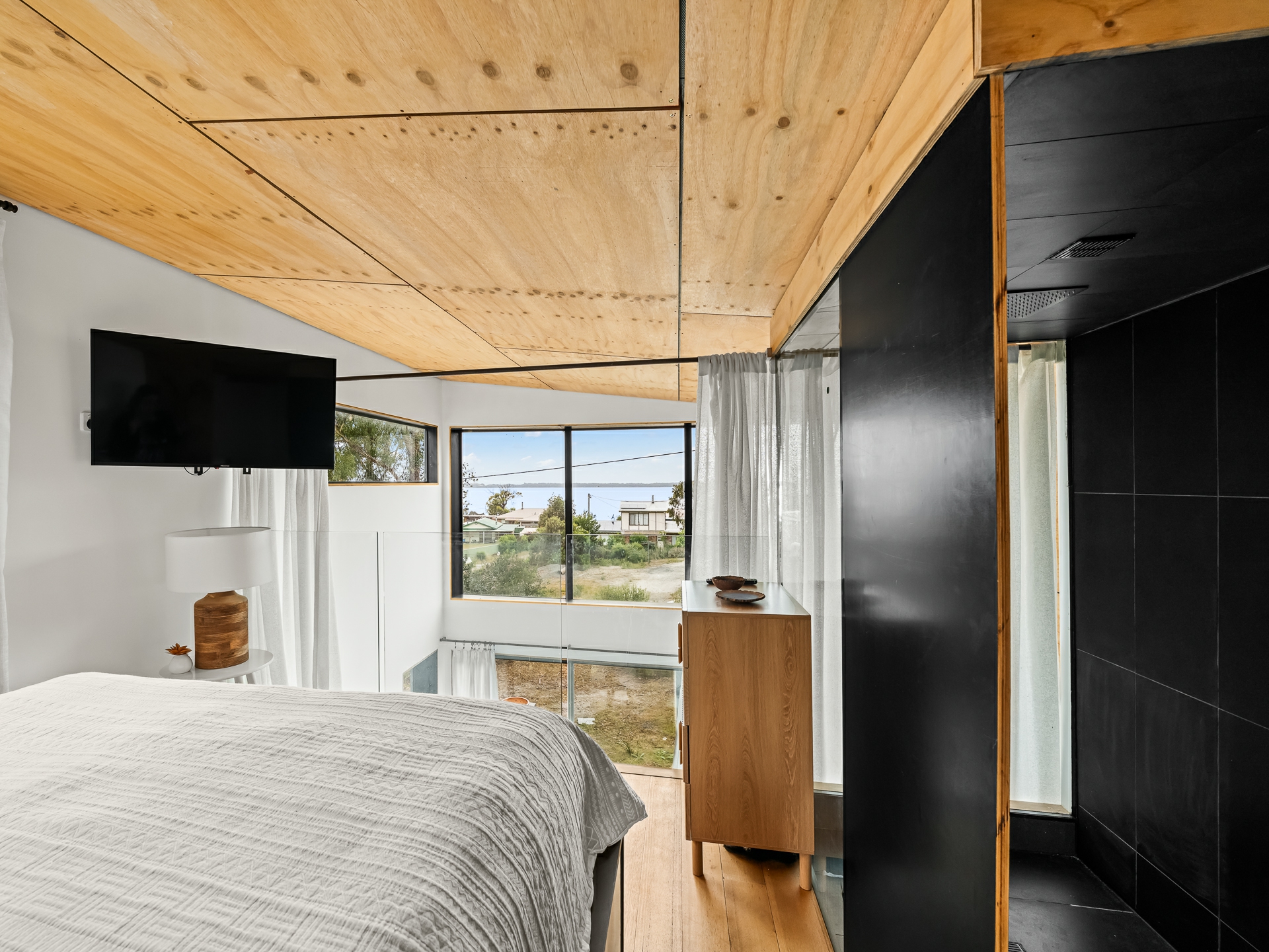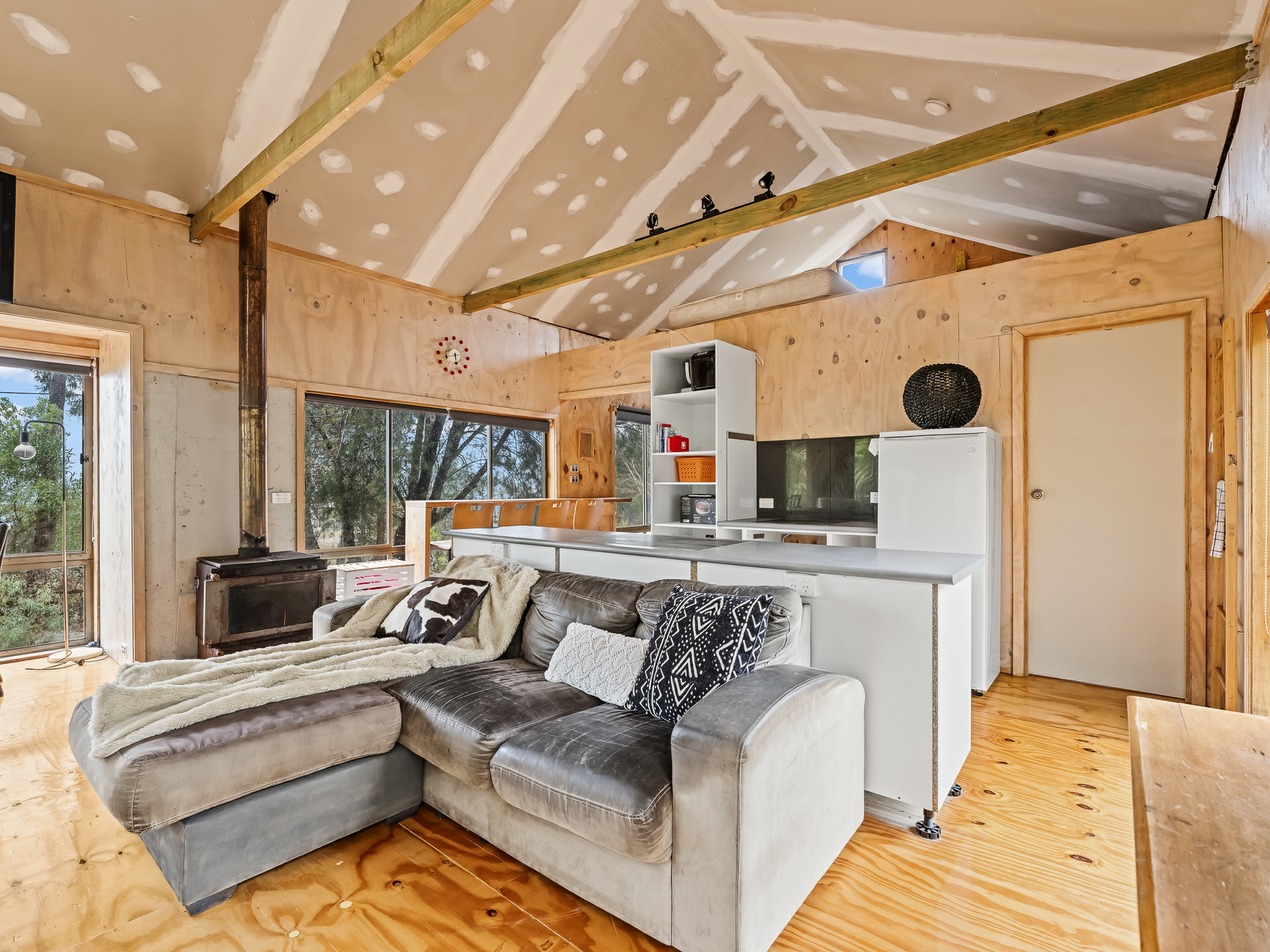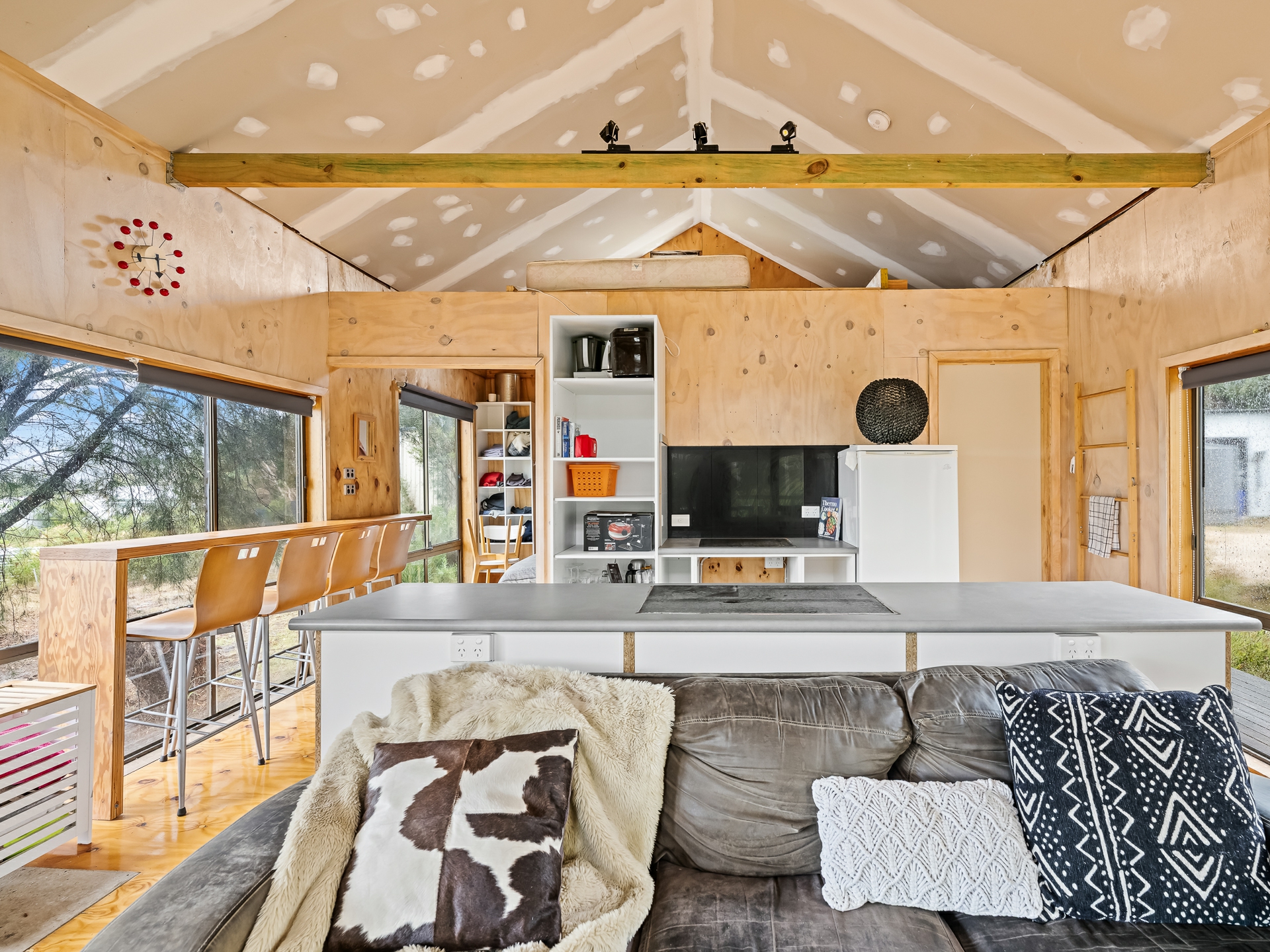 The cleverly designed "shack" is a standout, showcasing innovative storage solutions and a refined use of materials to ensure every inch is utilised with purpose. Clean lines and a considered layout create a seamless blend of style and practicality. The bedroom is perfectly positioned to capture stunning ocean views, offering a tranquil space to unwind, while expansive floor-to-ceiling glazing welcomes in an abundance of natural light. Designed with comfort in mind, the home captures the warmth of the winter sun, enhancing liveability and energy efficiency throughout the year.