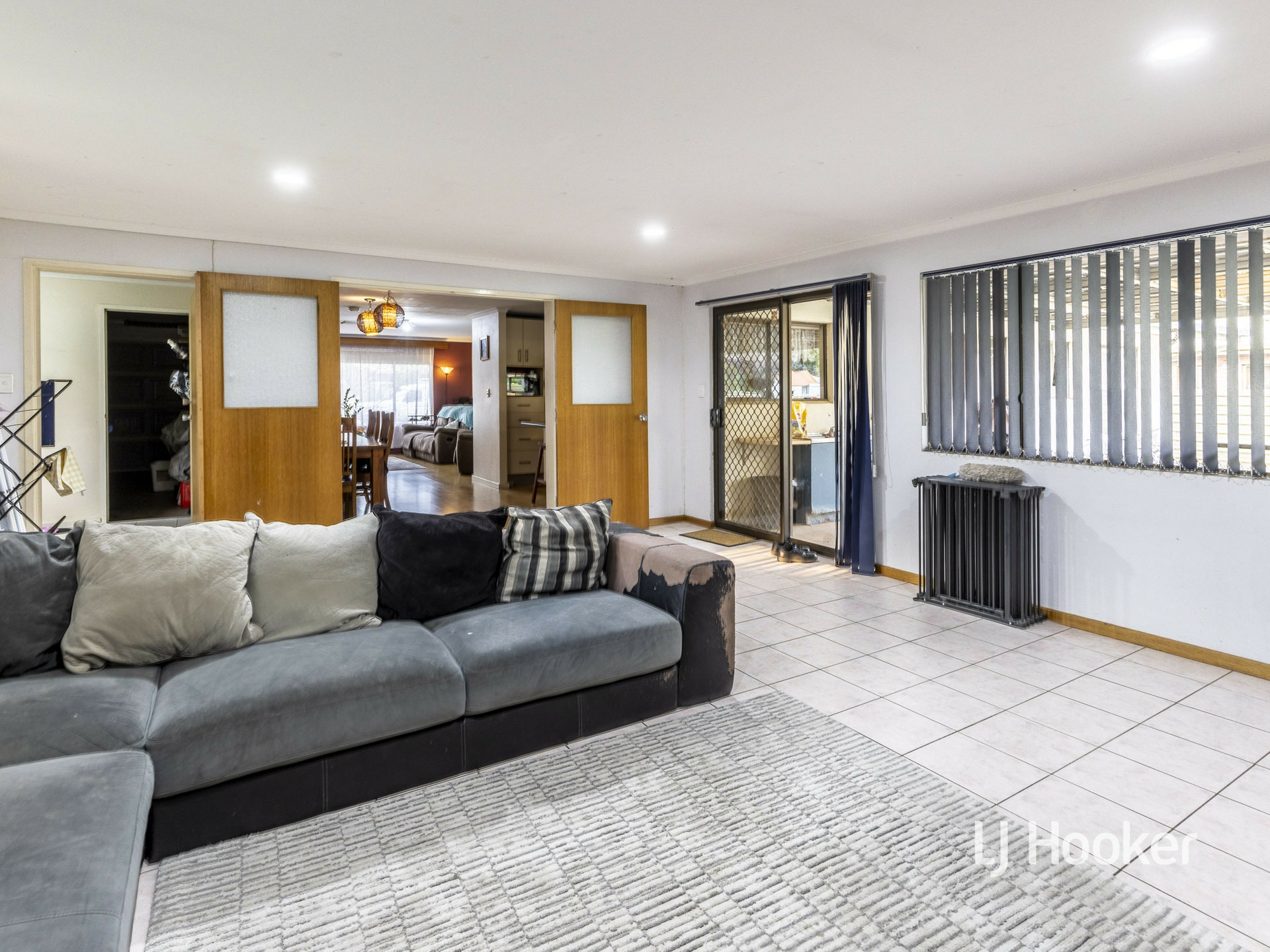 There are three bedrooms in the front wing of the home, a very large central family room with ceramic tiled floor and a built-in entertaining unit and another two bedrooms located in the rear wing of the home. There is a separate study or storeroom near the internal entrance to the garage.
