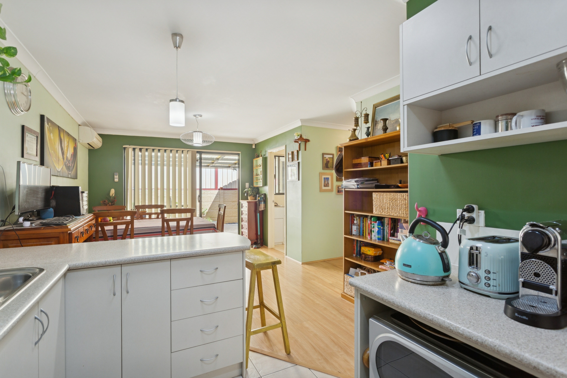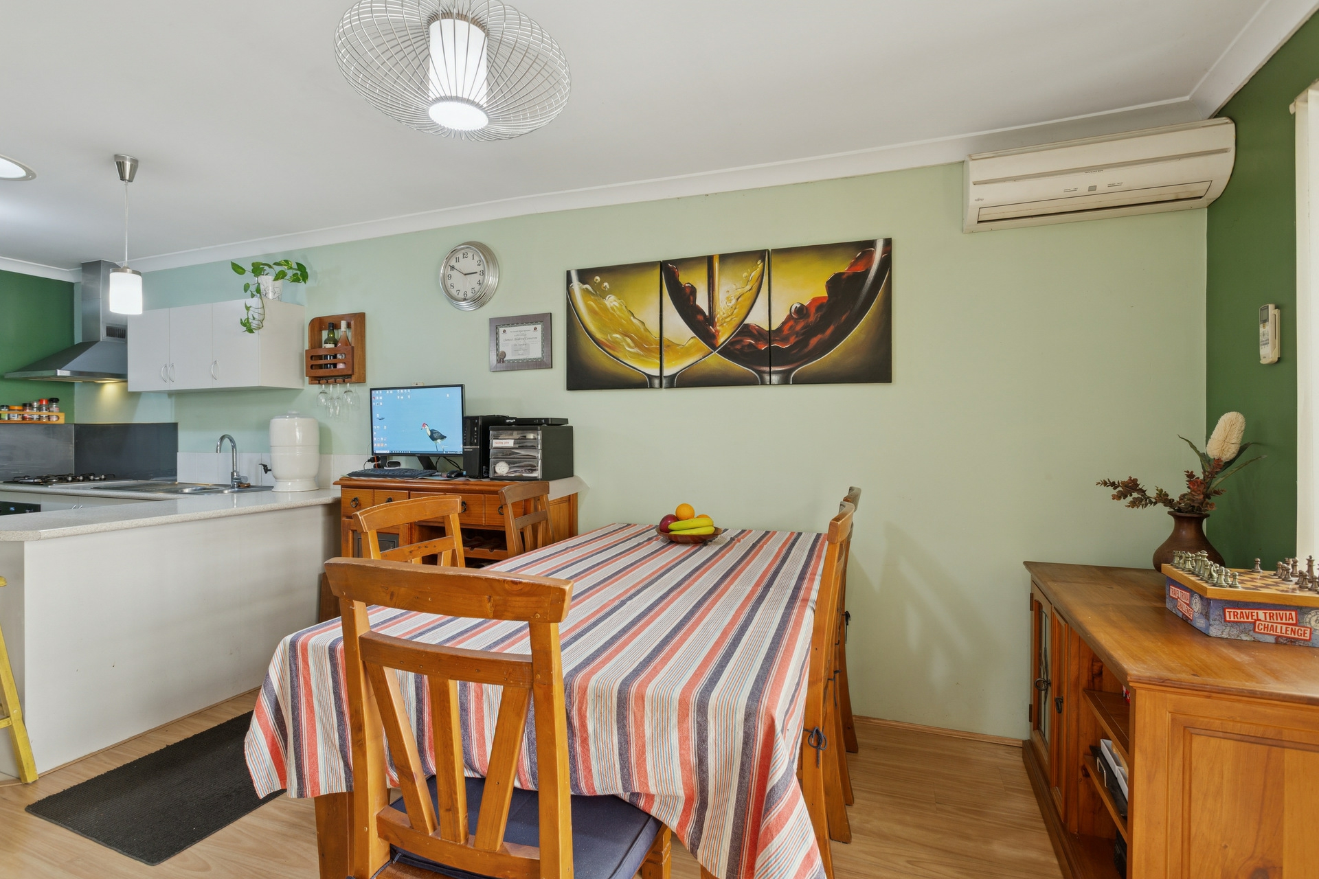The heart of the home is the open plan kitchen, boasting abundant storage above and below a wraparound benchtop, a gas cooktop, and a near new electric oven. This space flows seamlessly into the dining and main living area, kept comfortable year round by a split system air conditioner that efficiently services the home.