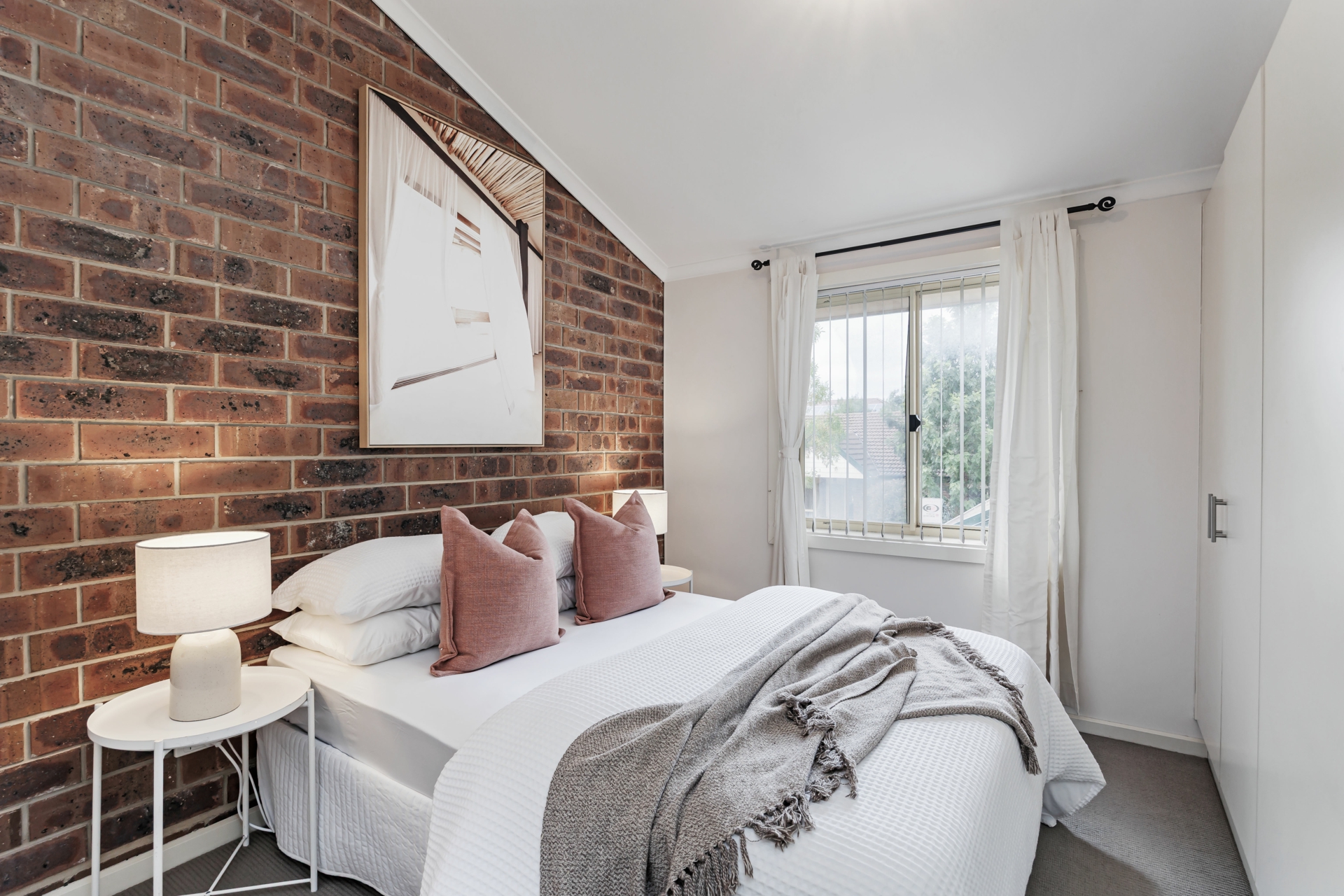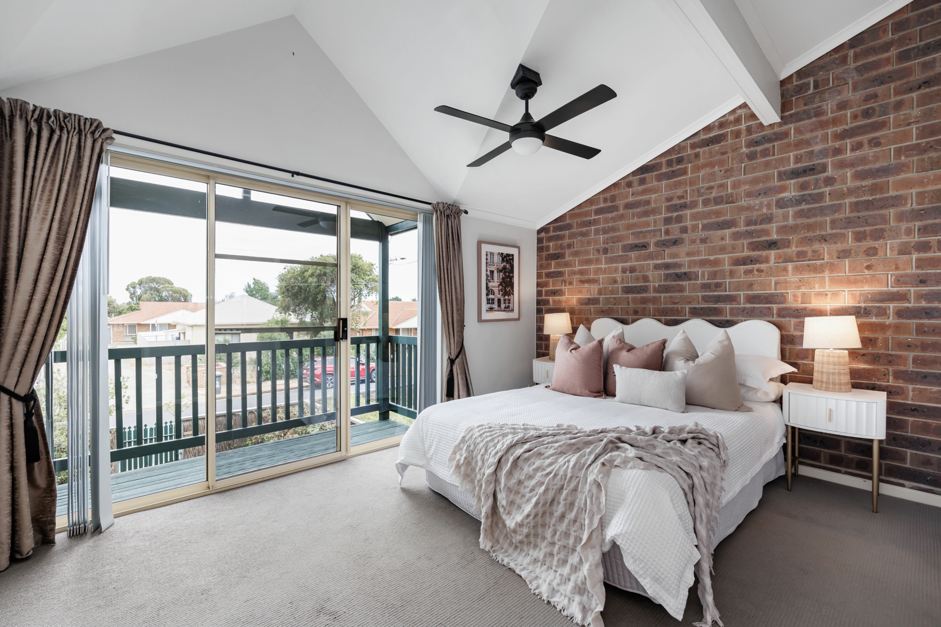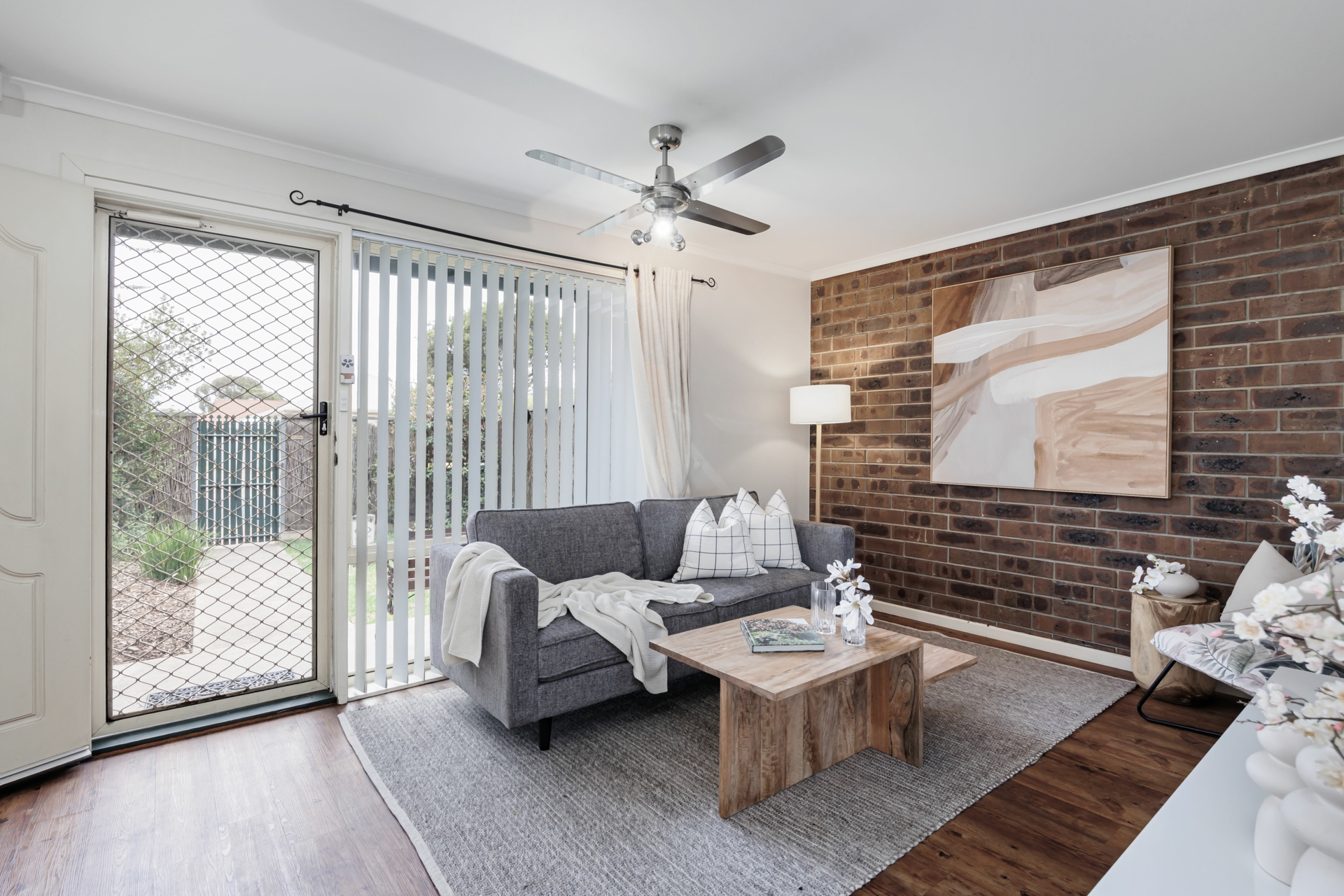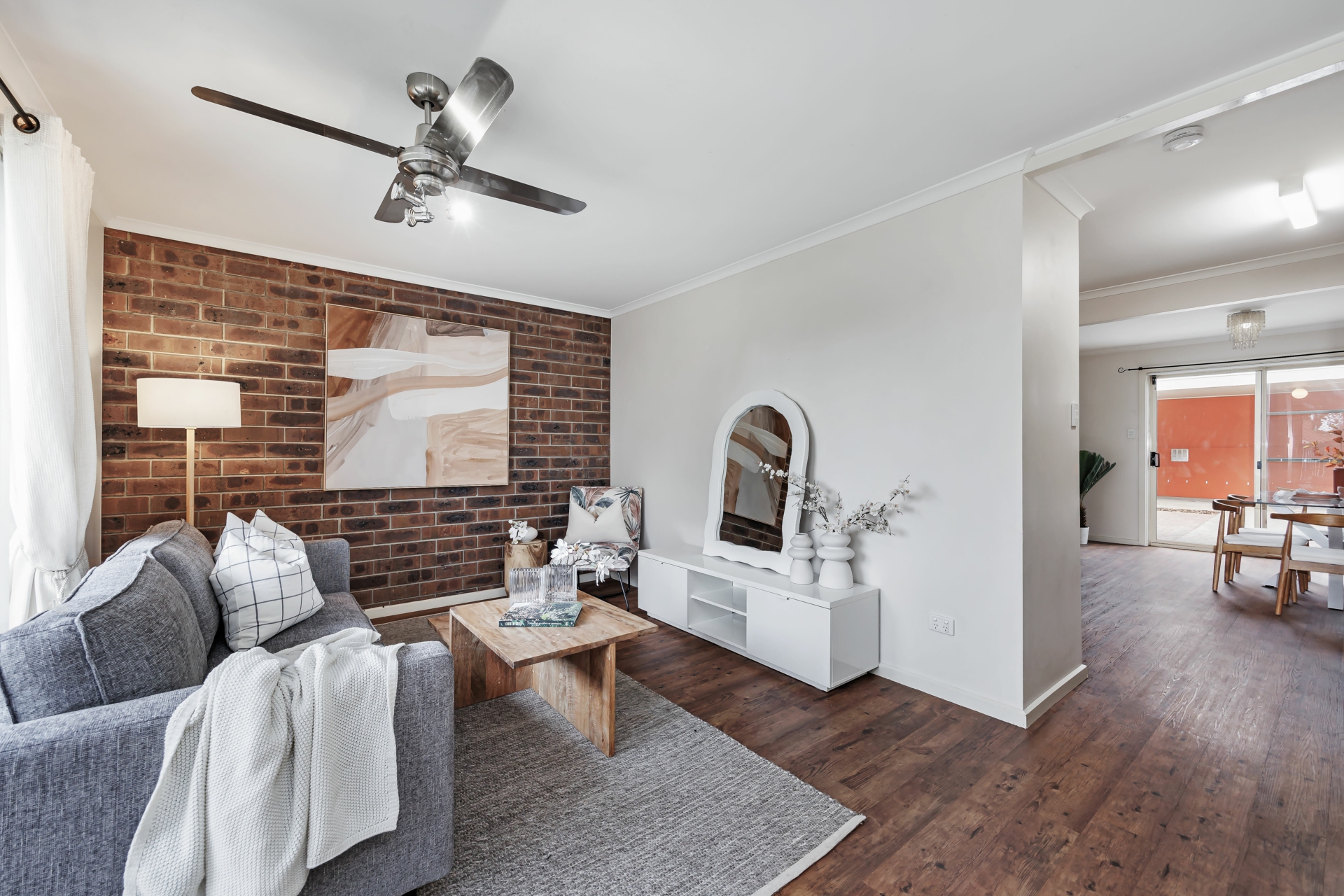 - Spacious lounge with feature brick wall and ceiling fans