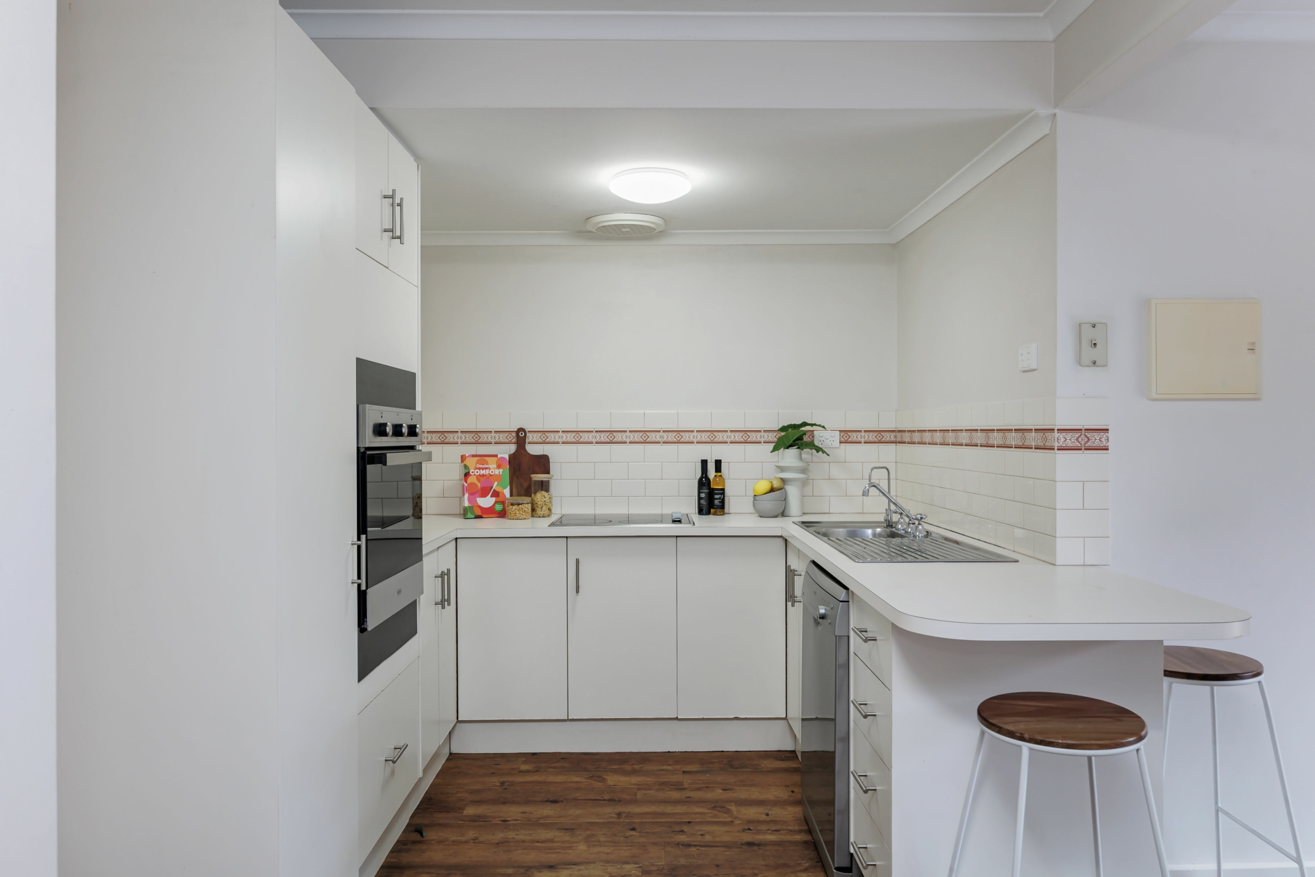 - Kitchen with electric cooktop, wall oven and dishwasher