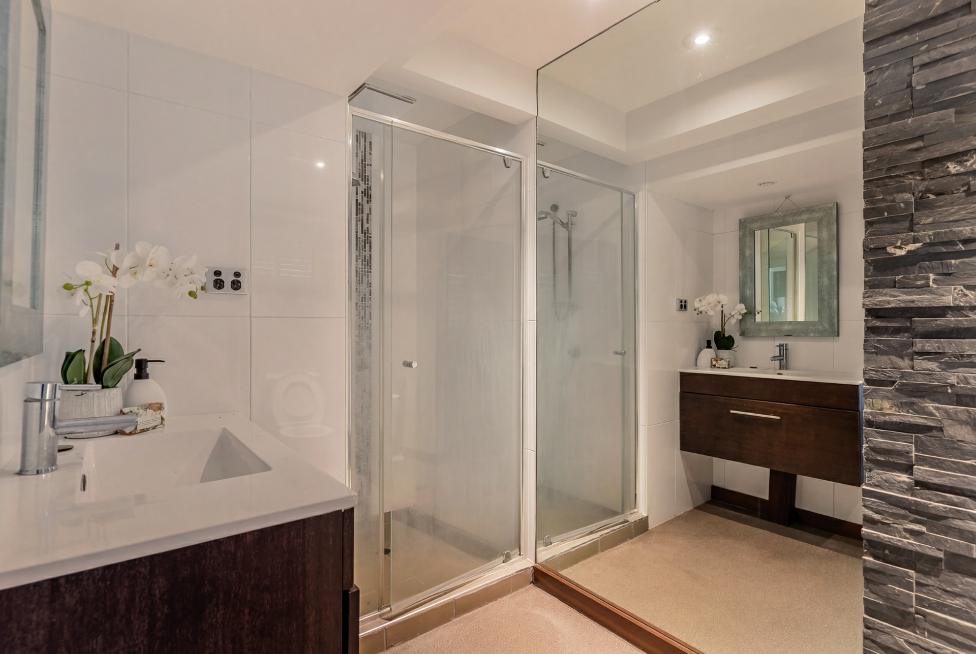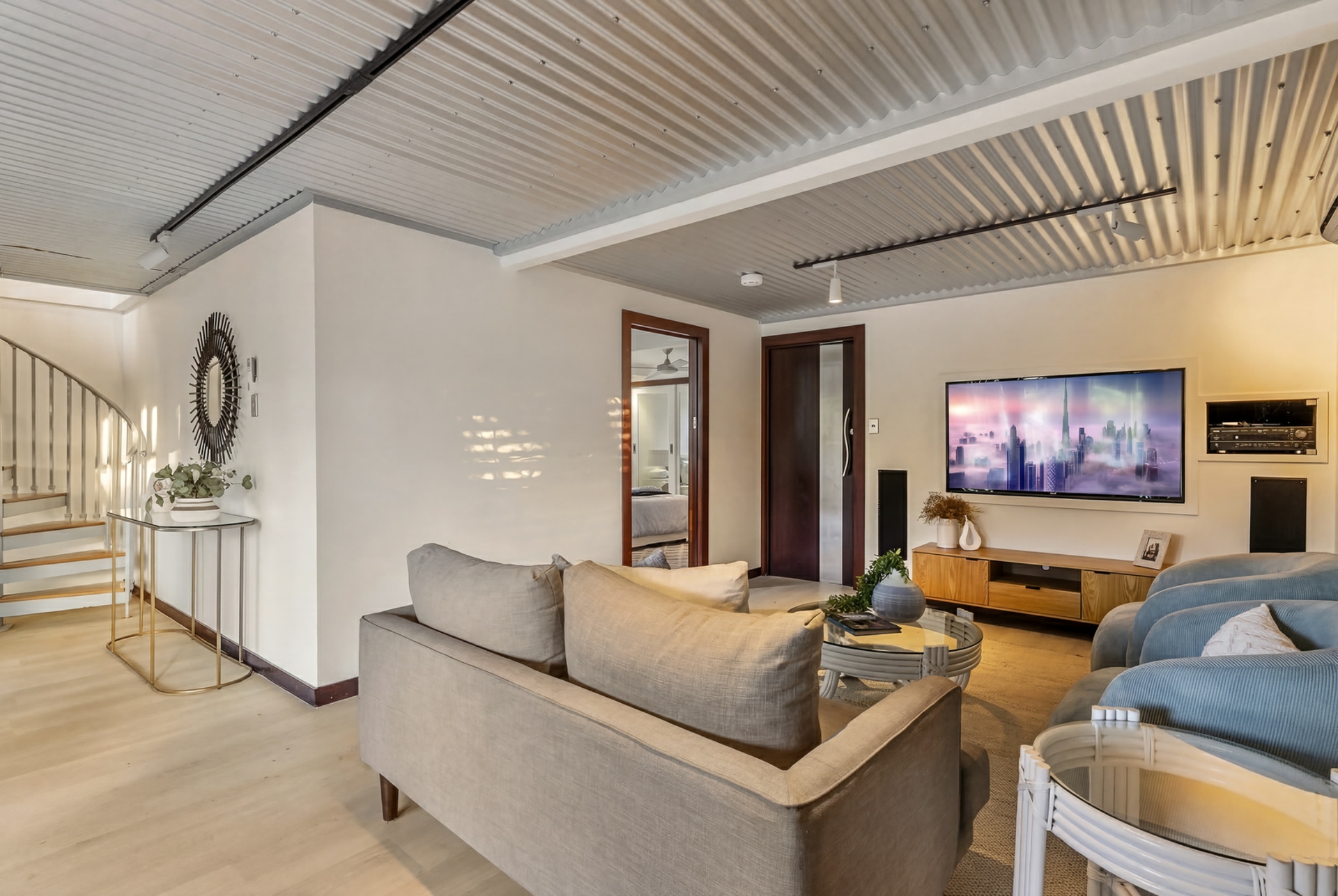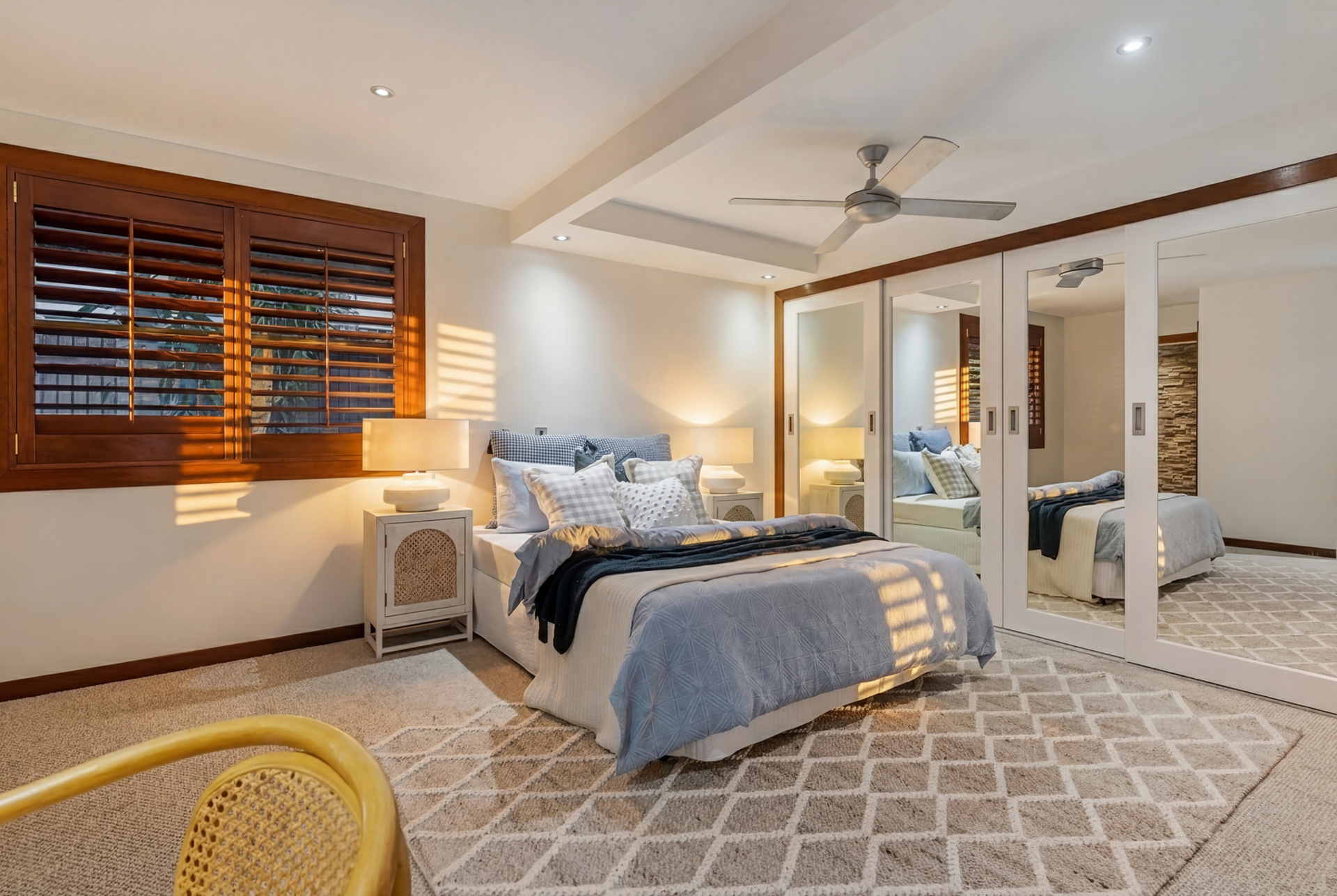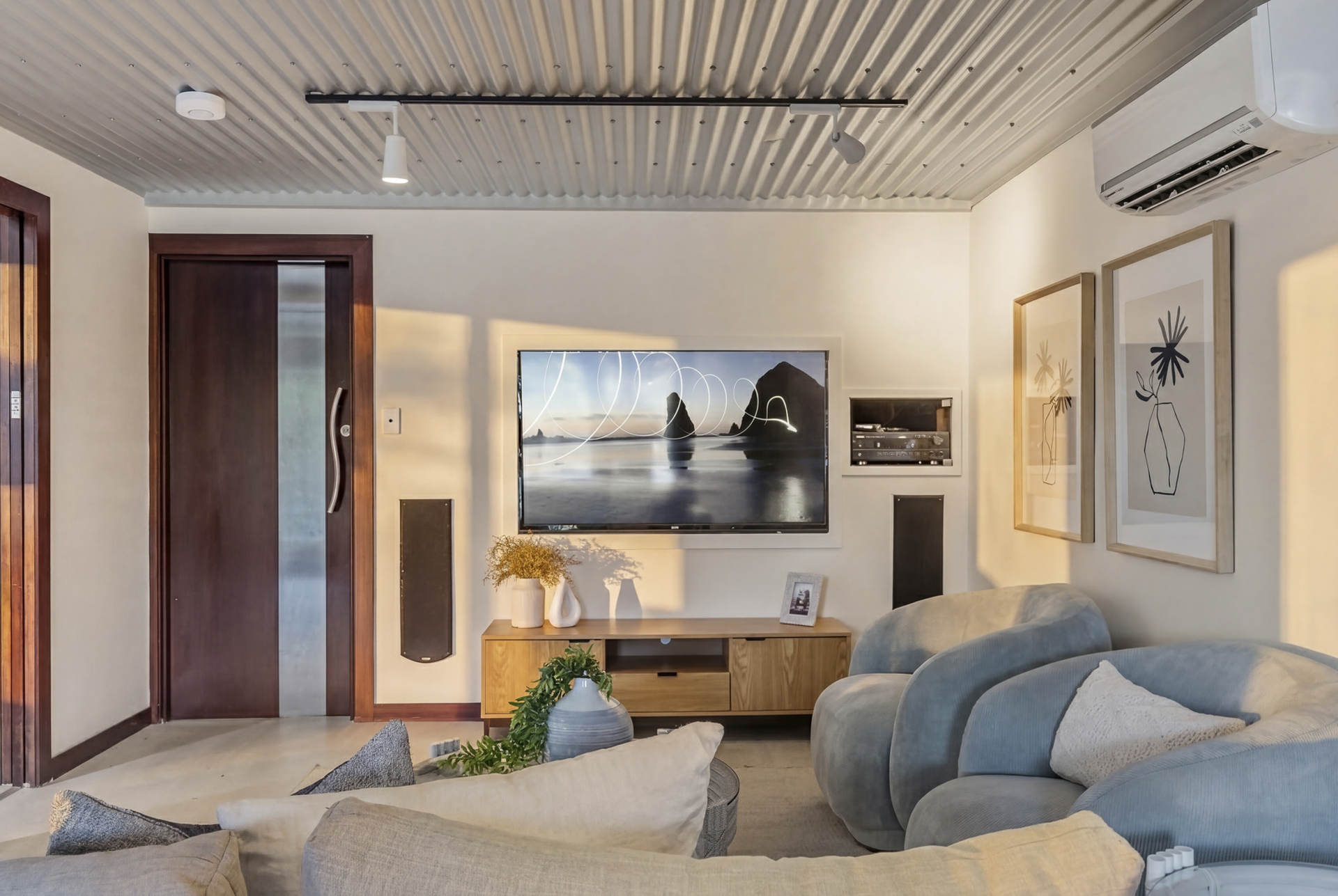 Downstairs, the home transitions into a versatile modern retreat with polished concrete flooring. A large, air-conditioned media room comes equipped with a brand-new 60-inch LCD screen and sound system, while an additional oversized bedroom with a sleek ensuite provides the perfect space for guests, teenagers, or a quiet home office.