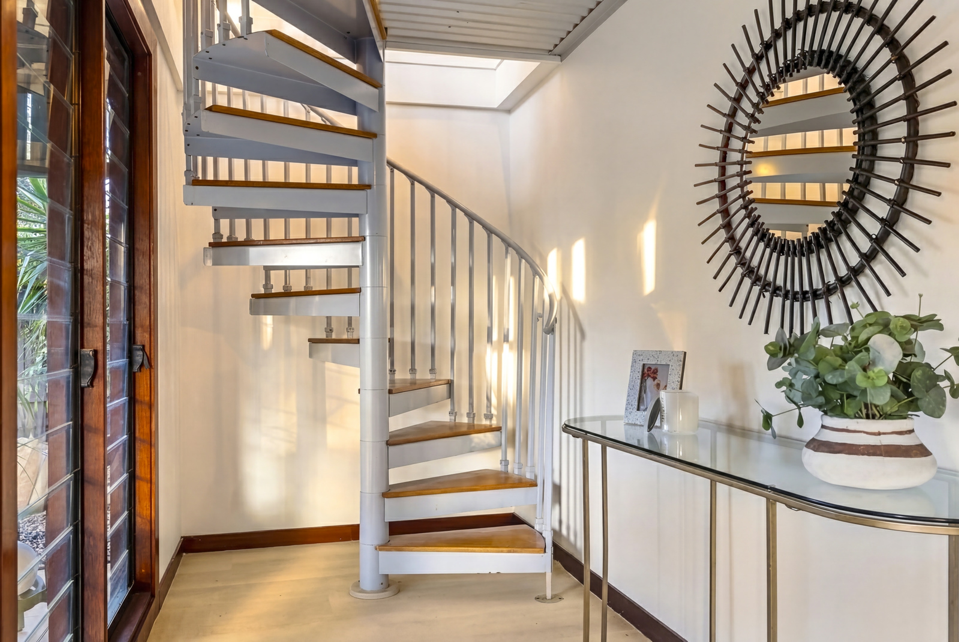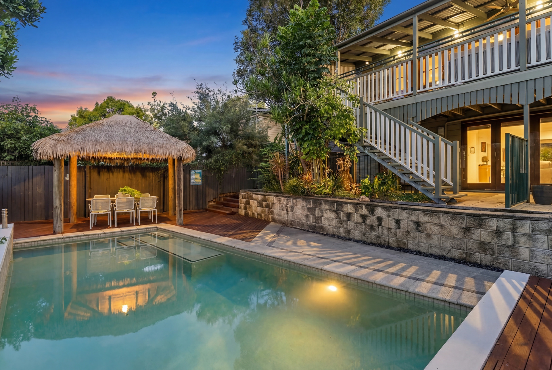 The upper level features a light-filled open-plan living area that flows seamlessly through French doors to a massive undercover deck. Overlooking the lush neighbourhood and the pool area, complete with its own tropical Bali Hut, this is the ultimate setting for weekend BBQs or quiet afternoon drinks. The designer kitchen is a chef's delight, boasting stone benchtops, a gas Blanco cooktop, and high-end stainless-steel appliances.