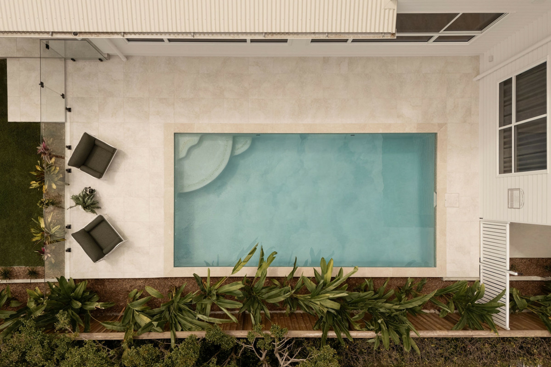 The heart of the home, that place where you and your family will create those memories, is the primary downstairs living area which these outdoor spaces frame. The eye is quietly drawn around this room to multiple touchpoints. Immediately, the cathedral ceilings, at 3.1m in height, engage the senses and create a soaring space. The texture of the soft, linen curtains filter and diffuse Brisbane's light - crafting a homely scene. The multiple windows open out onto green gardens or the soft aqua-blue of the pool and it's tiled surfaces - light and air and space again being enhanced. The island bench in the kitchen is replete with a stone top which mirrors the stone in the splashback. The Travertine pendant lighting over the island is finished with ceramic stone coverings - echoing the stone it hangs above. Each piece functions as part of the larger whole, crafting a picture of warm and bespoke homeliness without overwhelming.