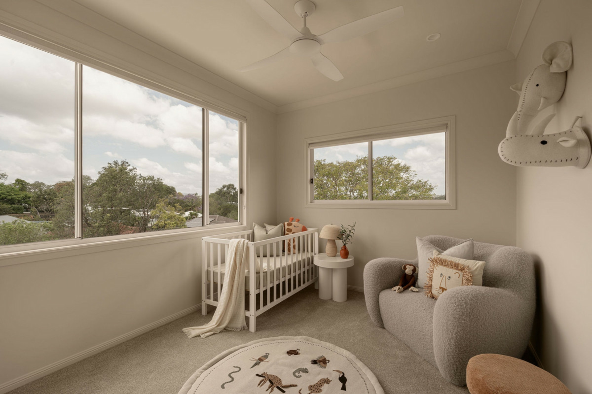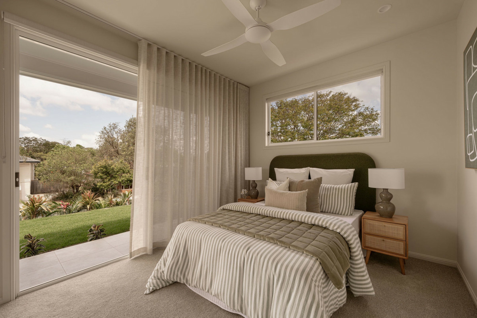 � Downstairs bedroom with built-in wardrobe, sheer curtain and Juliette patio - perfect morning coffee spot overlooking your elevated front yard.