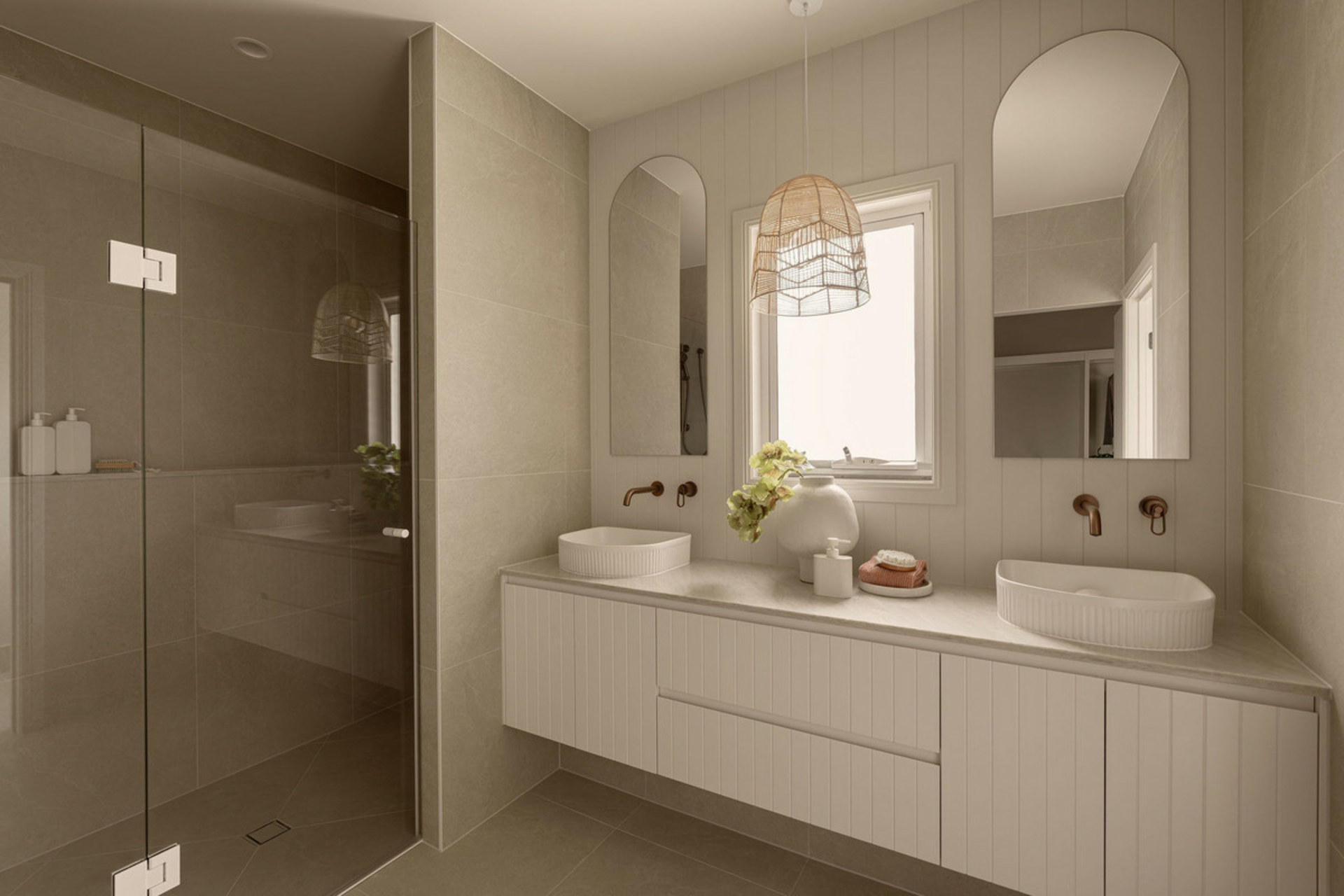 � Ensuite with curved mirrors, stylish fluted sinks, floating vanity, and shower shelf with double showers.