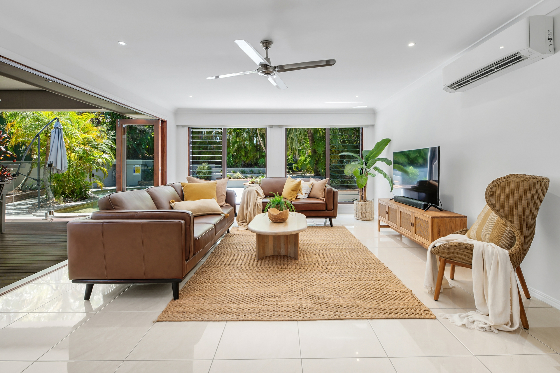 • Large lounge area boasting louvred windows to cleverly allow the breeze-flow, whilst stacker doors open fully for easy access to outdoors
