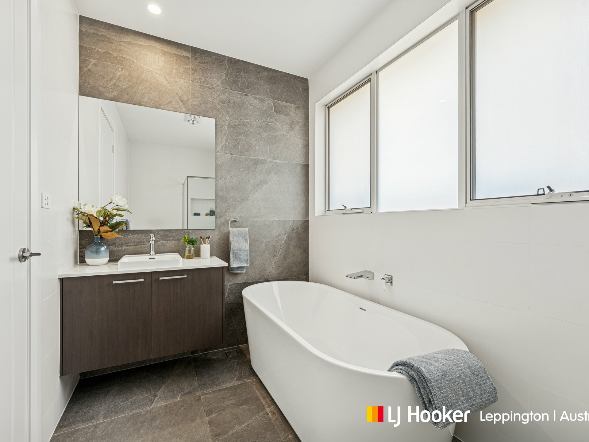 - Designer bathrooms featuring stone-top vanities, semi-frameless shower screens, floor-to-ceiling tiling, and a freestanding bathtub