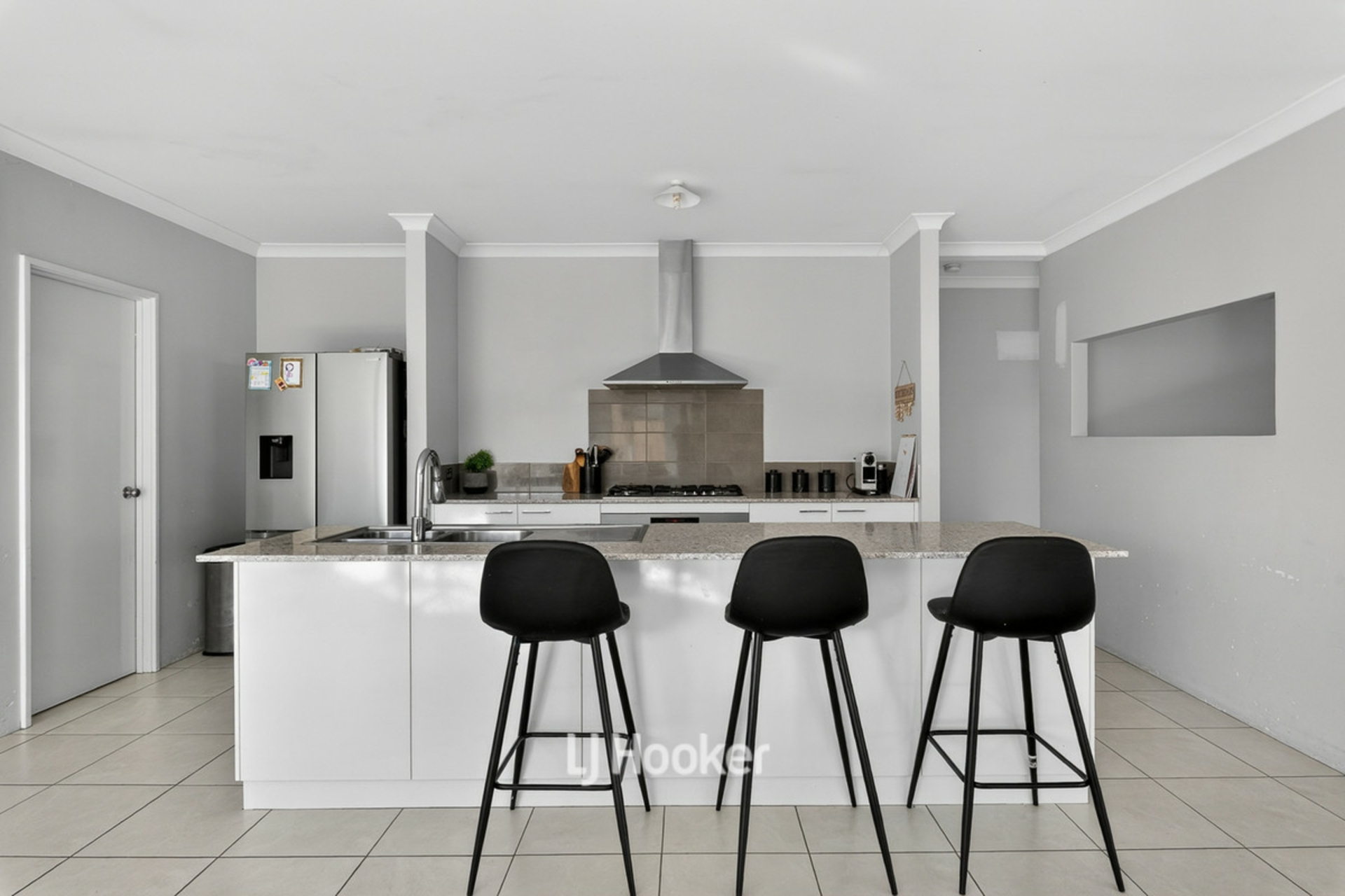 The kitchen is both stylish and practical, finished with stone benchtops and centred around a generous island bench that doubles as a breakfast bar. Equipped with quality 900mm wide appliances and complemented by a spacious walk-in pantry, this is a well-appointed space that will appeal to home cooks and entertainers alike.