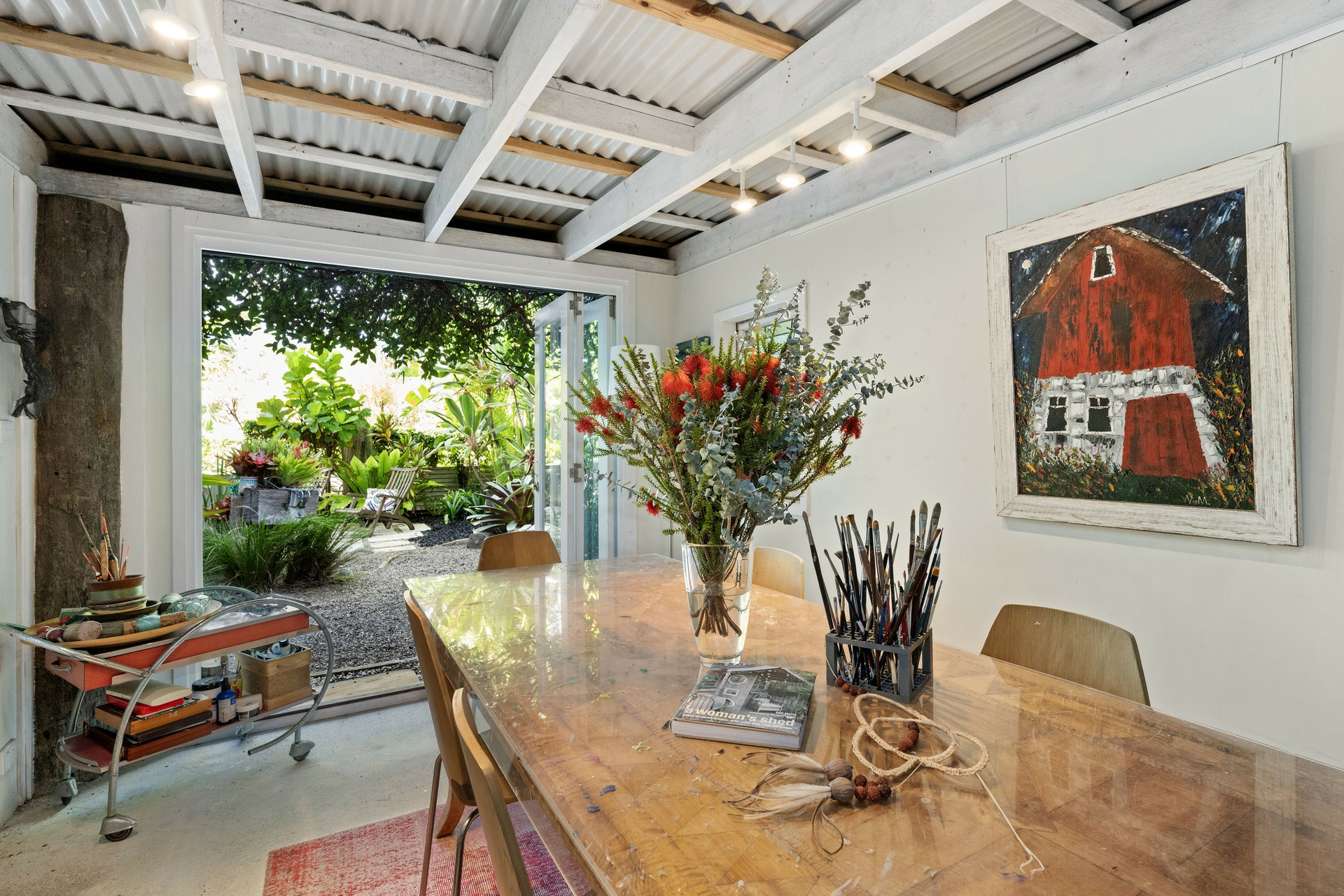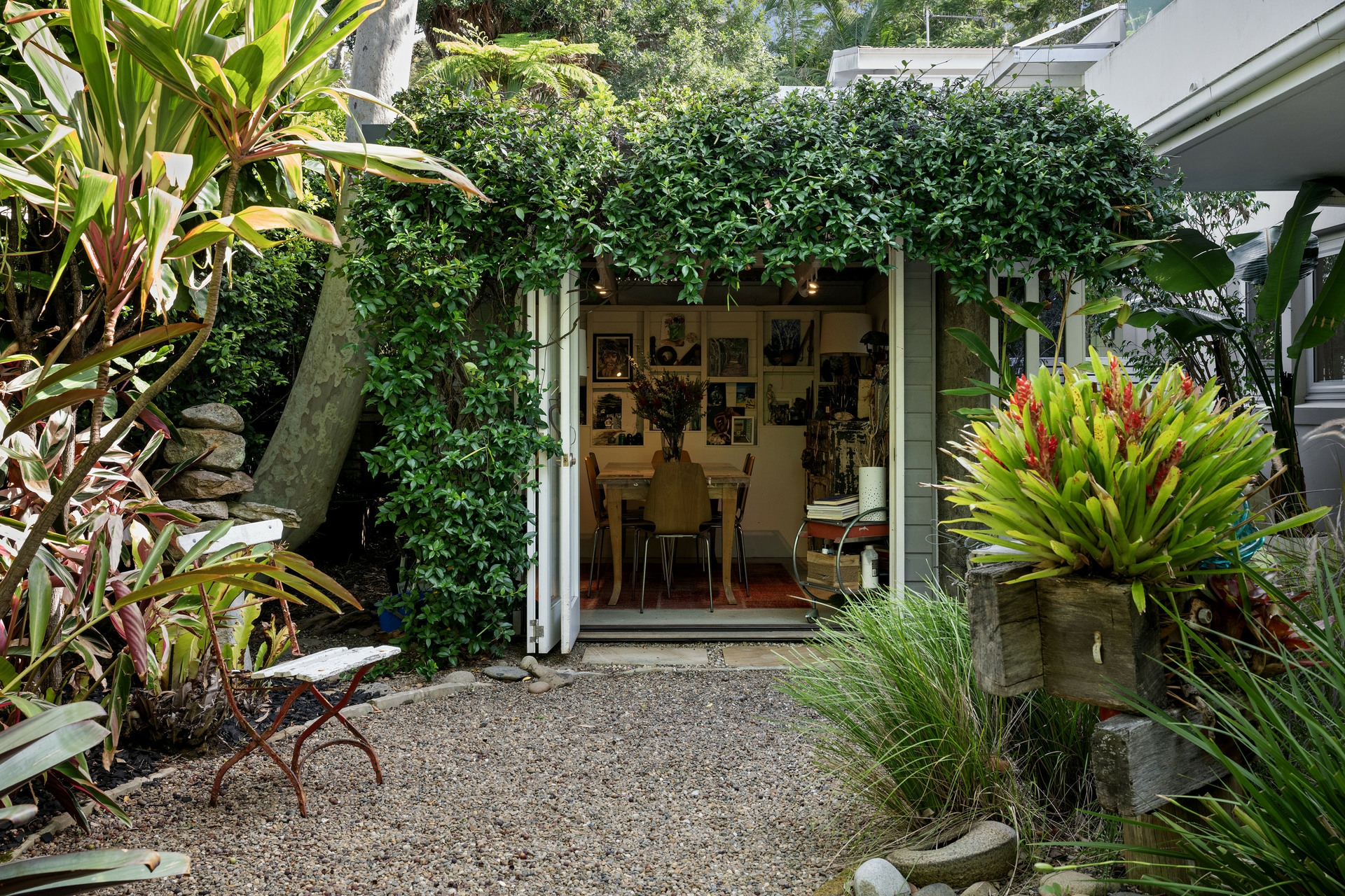 Adding further versatility is the charming separate cabin, affectionately known as the "She Shed". Designed by landscape architect Olof Von Sperl of Adore My Garden and built by respected local builder Dave Mundell, this unique space has drawn widespread attention including a filmed feature on Sunrise and various press articles. With reclaimed doors, a stained-glass window and thoughtful detailing throughout, it offers a perfect retreat as an artist's studio, dining pavilion, or peaceful escape. The living roof of faux grass, cascading jasmine and clever design ensures privacy for neighbours while filling the garden with beautiful seasonal fragrance.