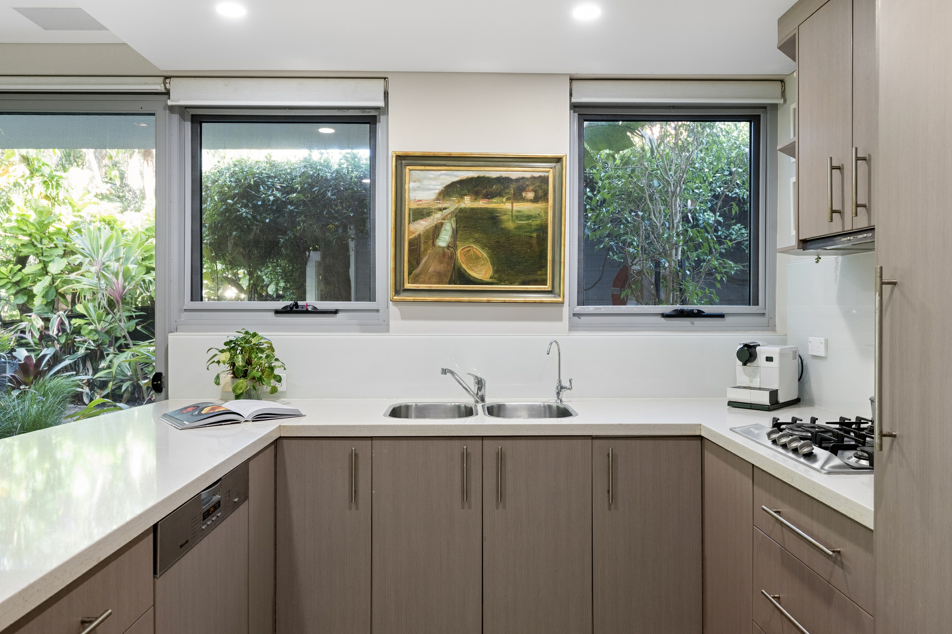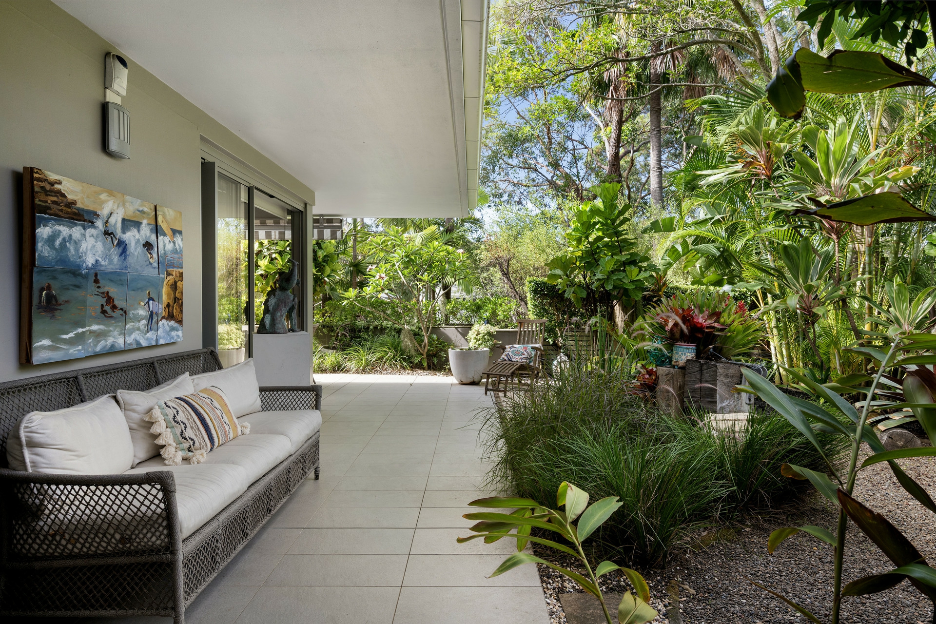 Beyond the interiors, the residence unfolds into a truly unique garden sanctuary. Professionally designed and fully landscaped by the acclaimed team behind the Boathouse aesthetic, the gardens have been transformed into a striking yet incredibly low-maintenance retreat. The space has attracted significant attention, featured in the Sydney Private Garden Show and highlighted in Sydney garden and landscape publications. Among its many distinctive features are six reclaimed Sydney wharf poles sourced near Garden Island, adding character and a subtle nod to the area's maritime heritage.