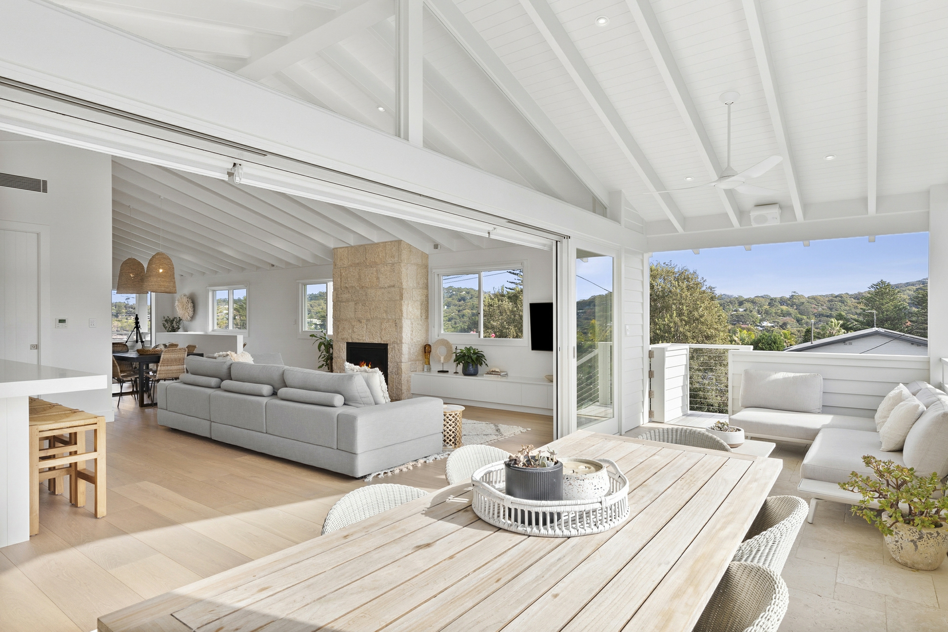 On the upper level, an expansive open-plan kitchen and living, extends to the rear entertaining zone, featuring built in BBQ with views across the pool towards Bangalley Headland. A statement gas fireplace anchors the space with the dining and sitting room flowing to the front veranda overlooking the beach and beyond. The master bedroom with walk in robe and ensuite enjoys direct access to the veranda and takes advantage of the coastal views.
