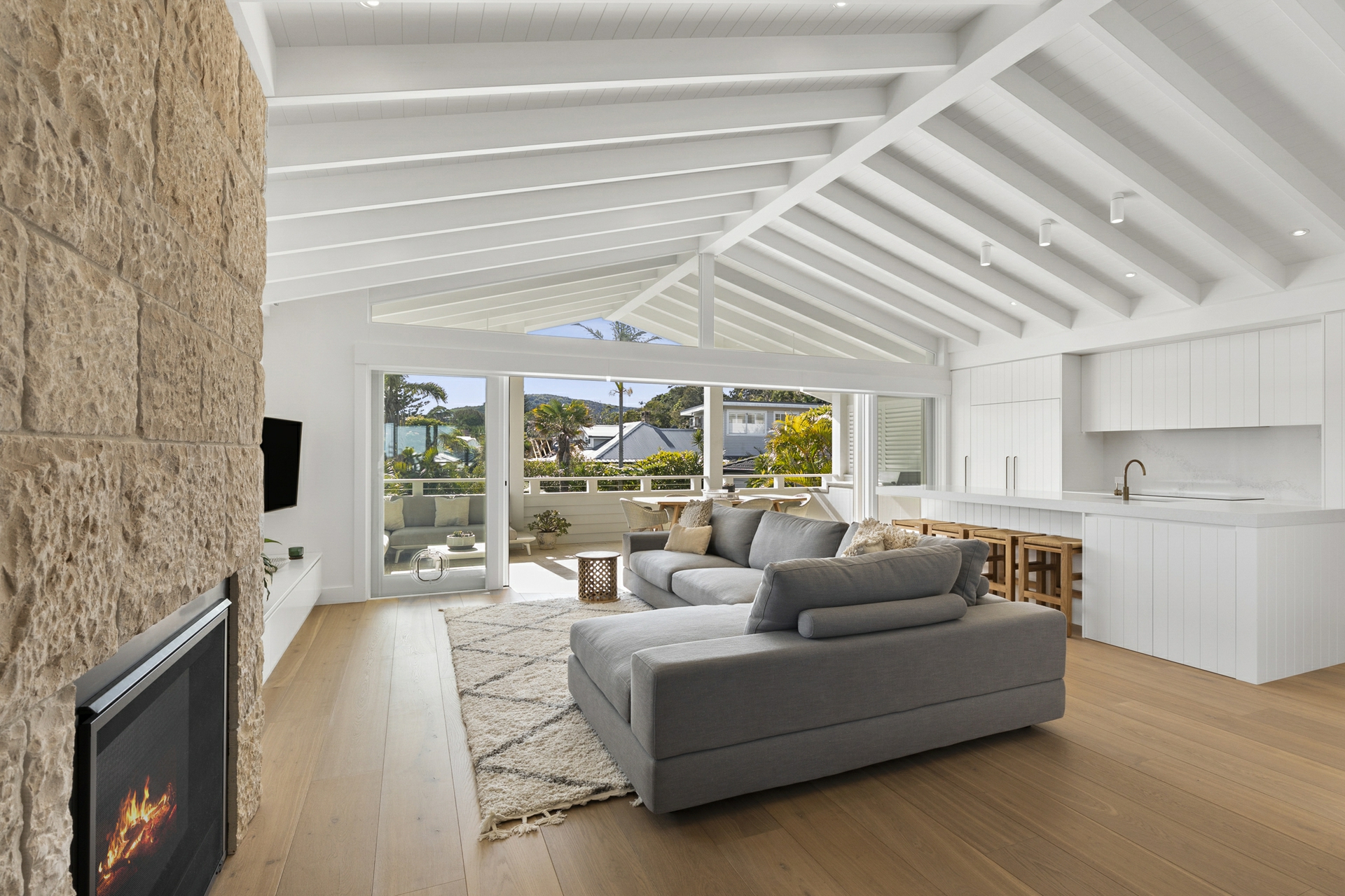 On the upper level, an expansive open-plan kitchen and living, extends to the rear entertaining zone, featuring built in BBQ with views across the pool towards Bangalley Headland. A statement gas fireplace anchors the space with the dining and sitting room flowing to the front veranda overlooking the beach and beyond. The master bedroom with walk in robe and ensuite enjoys direct access to the veranda and takes advantage of the coastal views.