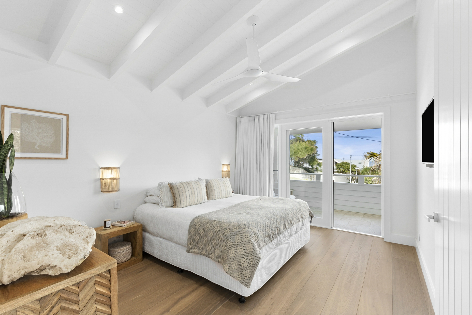 On the upper level, an expansive open-plan kitchen and living, extends to the rear entertaining zone, featuring built in BBQ with views across the pool towards Bangalley Headland. A statement gas fireplace anchors the space with the dining and sitting room flowing to the front veranda overlooking the beach and beyond. The master bedroom with walk in robe and ensuite enjoys direct access to the veranda and takes advantage of the coastal views.