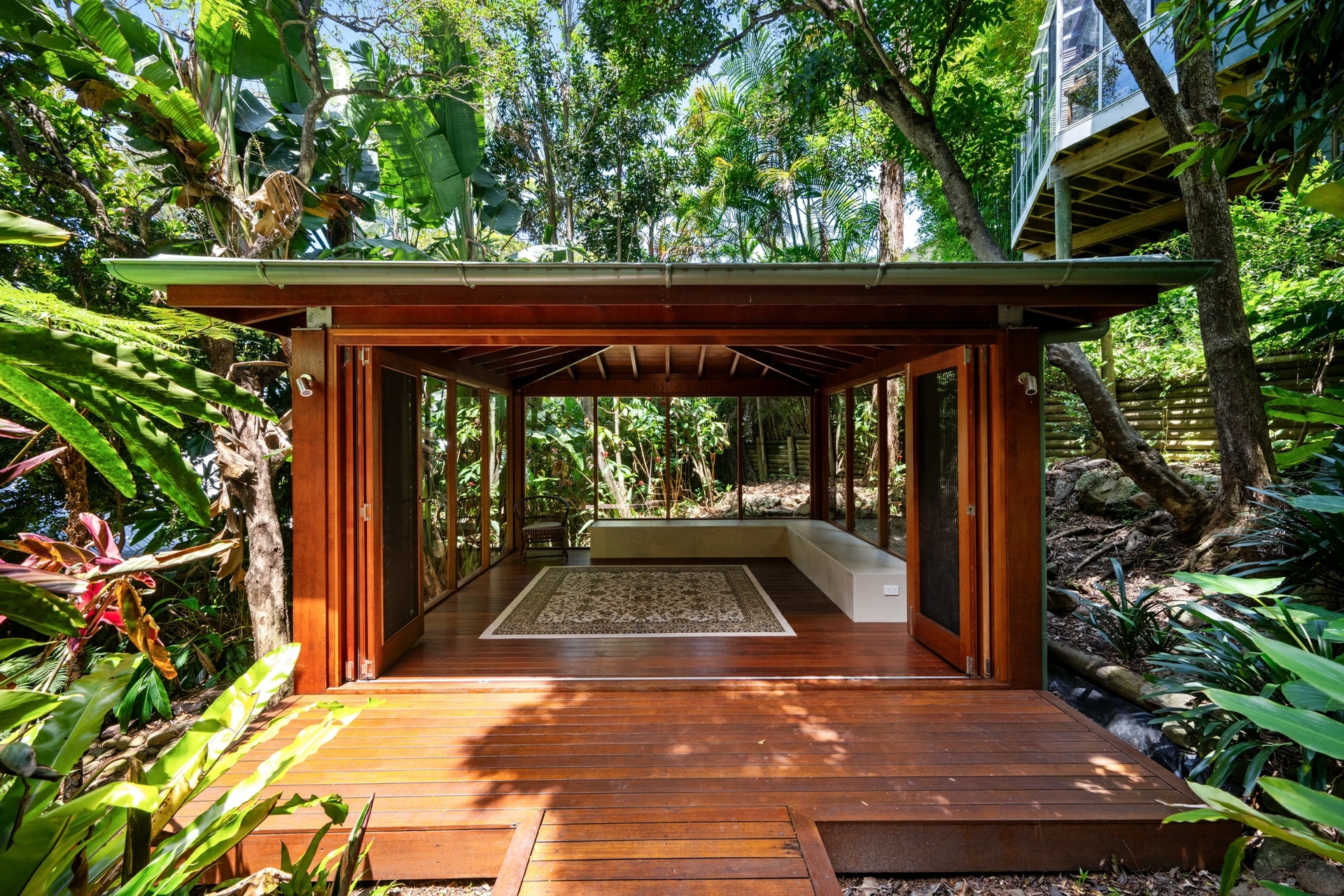 - Enclosed decked, secluded pavilion-style space amongst low-maintenance tropical plants. Perfect for a wellness retreat, artist studio, writers den or home office.