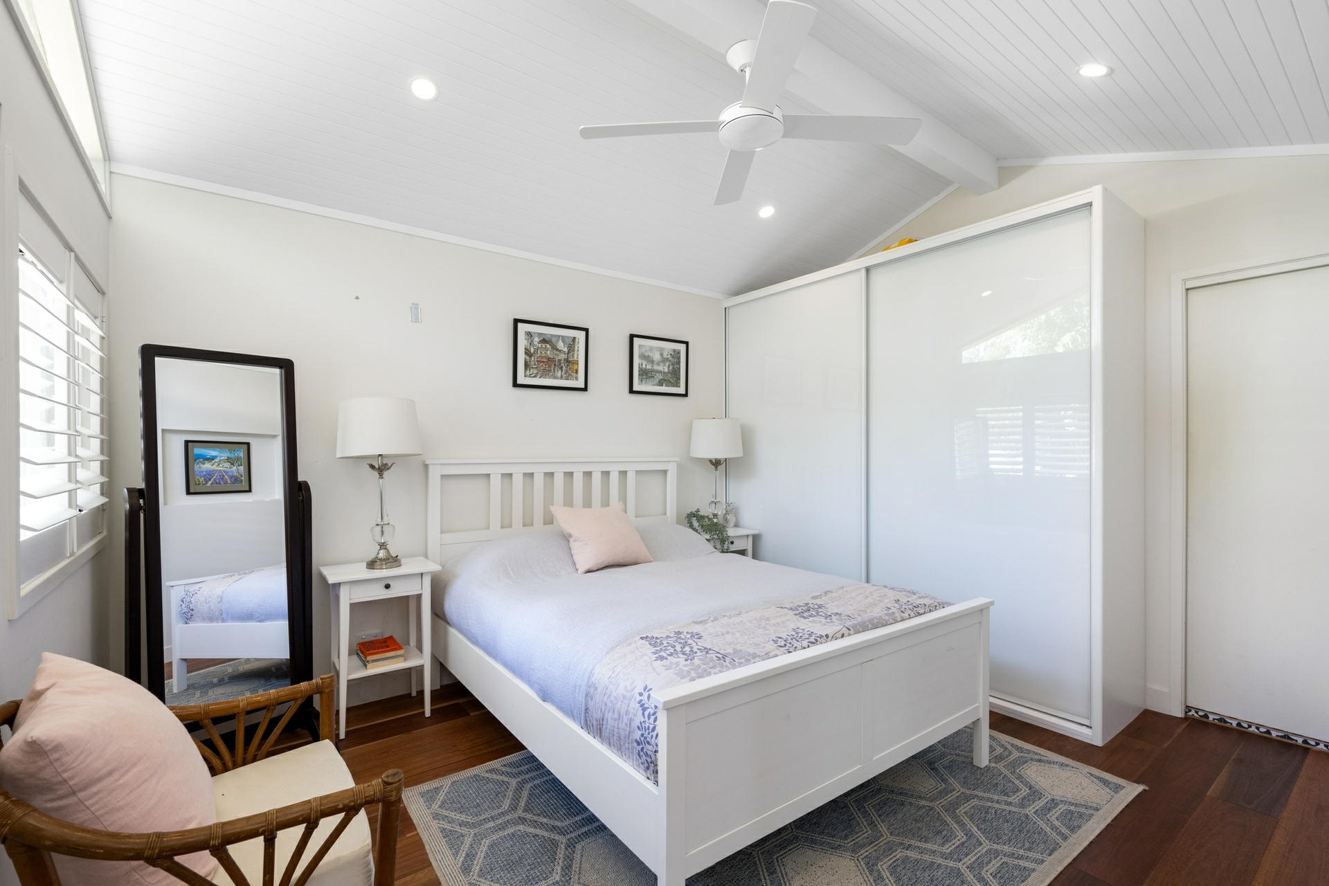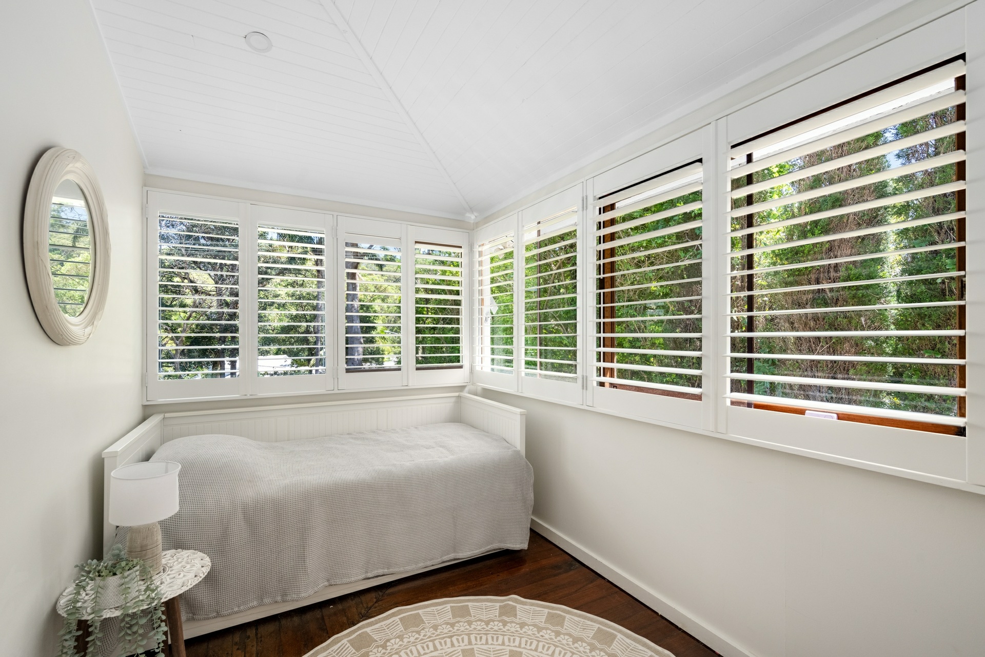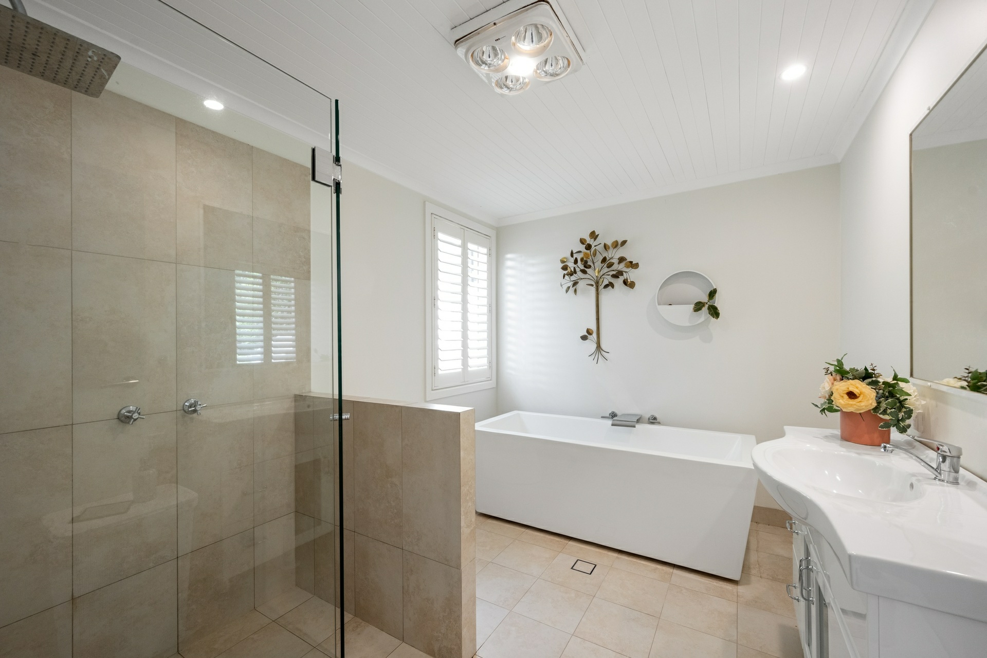 - V-groove raked ceilings, plantation shutters, and timber flooring