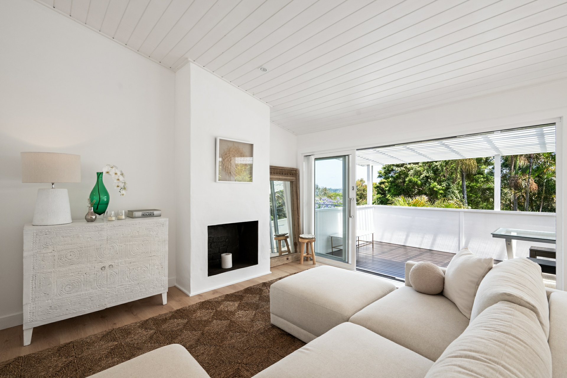 The split-level layout is both practical and seamless. Bedrooms and bathrooms are thoughtfully separated from the open-plan kitchen, living, and dining spaces below, creating a sense of privacy and calm. Large sliding glass doors blur the line between indoors and out, opening to a generous timber deck with vignettes of the horizon above Avalon Beach. Below, a lush tropical garden sets the scene for effortless entertaining, complete with a pool and outdoor shower.