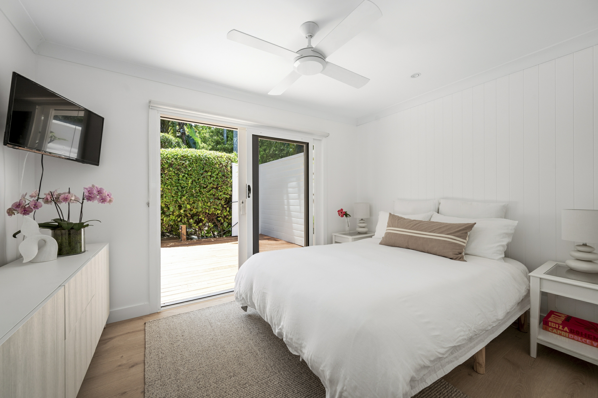 - Three bedrooms: main with a walk-in robe, ensuite, and front deck access; two additional bedrooms with built-ins