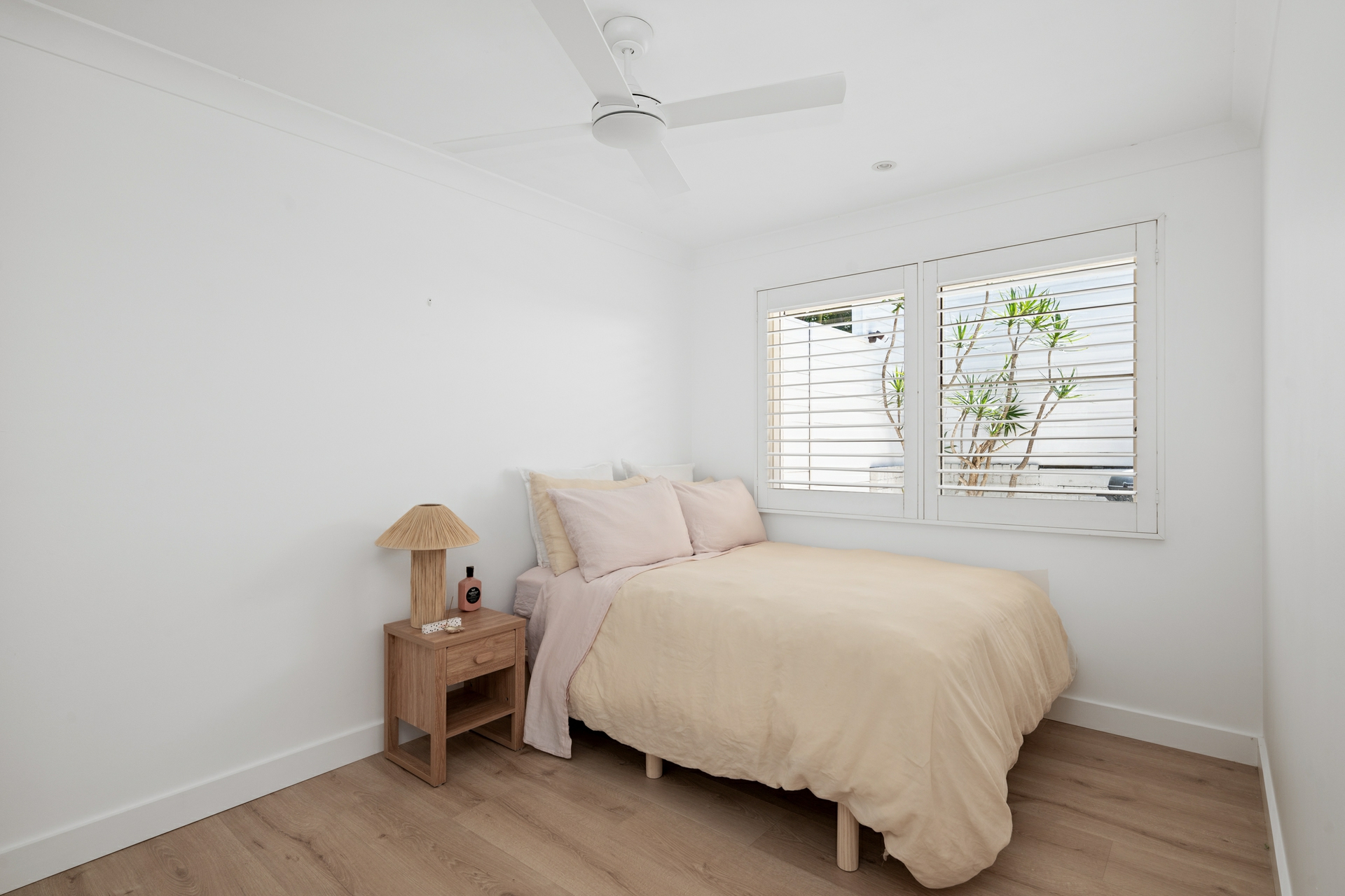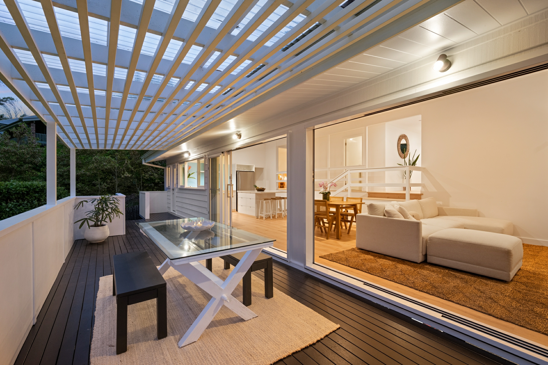 - Sunlit interiors with glass sliding doors, skylights, and plantation shutters