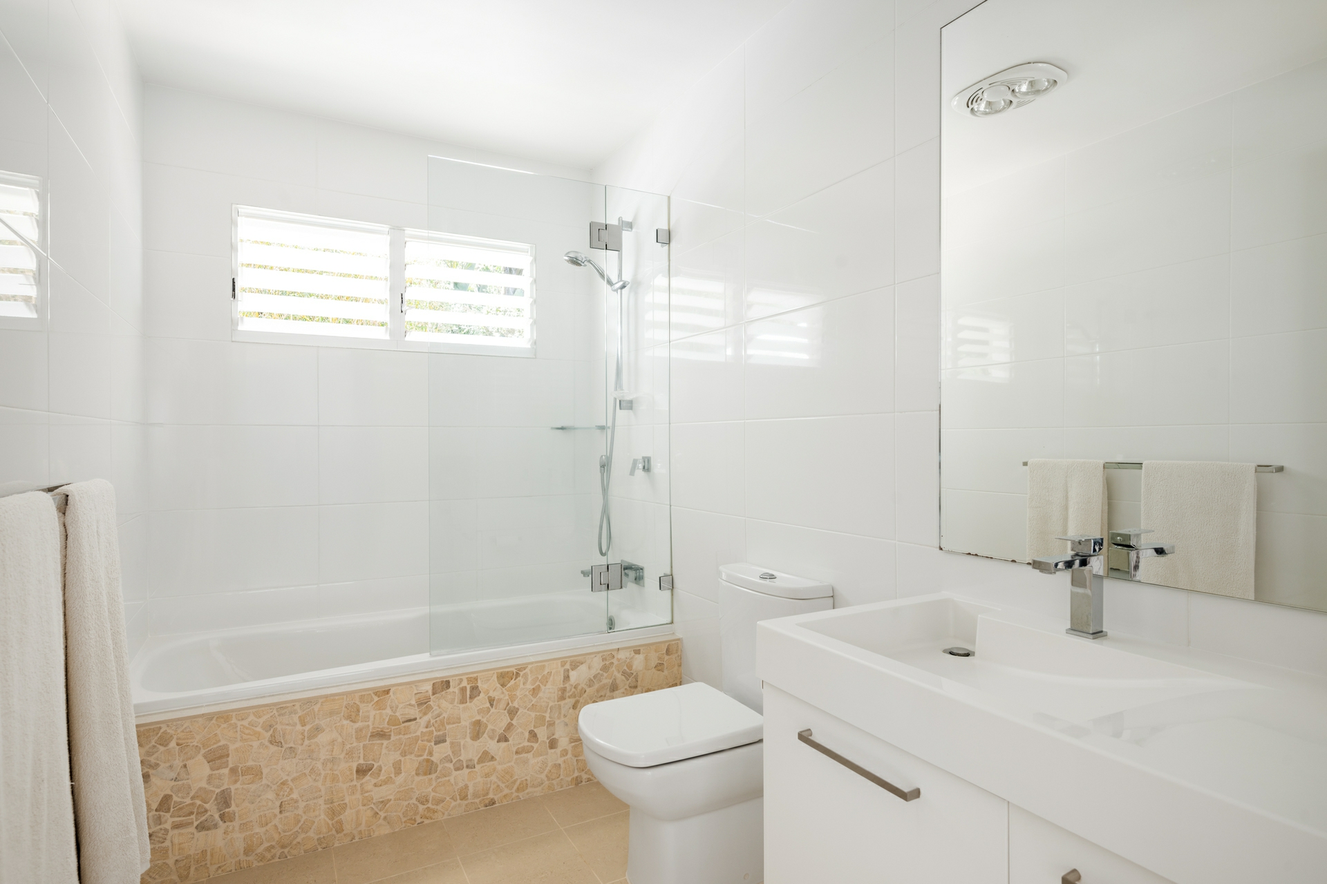 - Well-appointed bathroom featuring stone accents on the bath