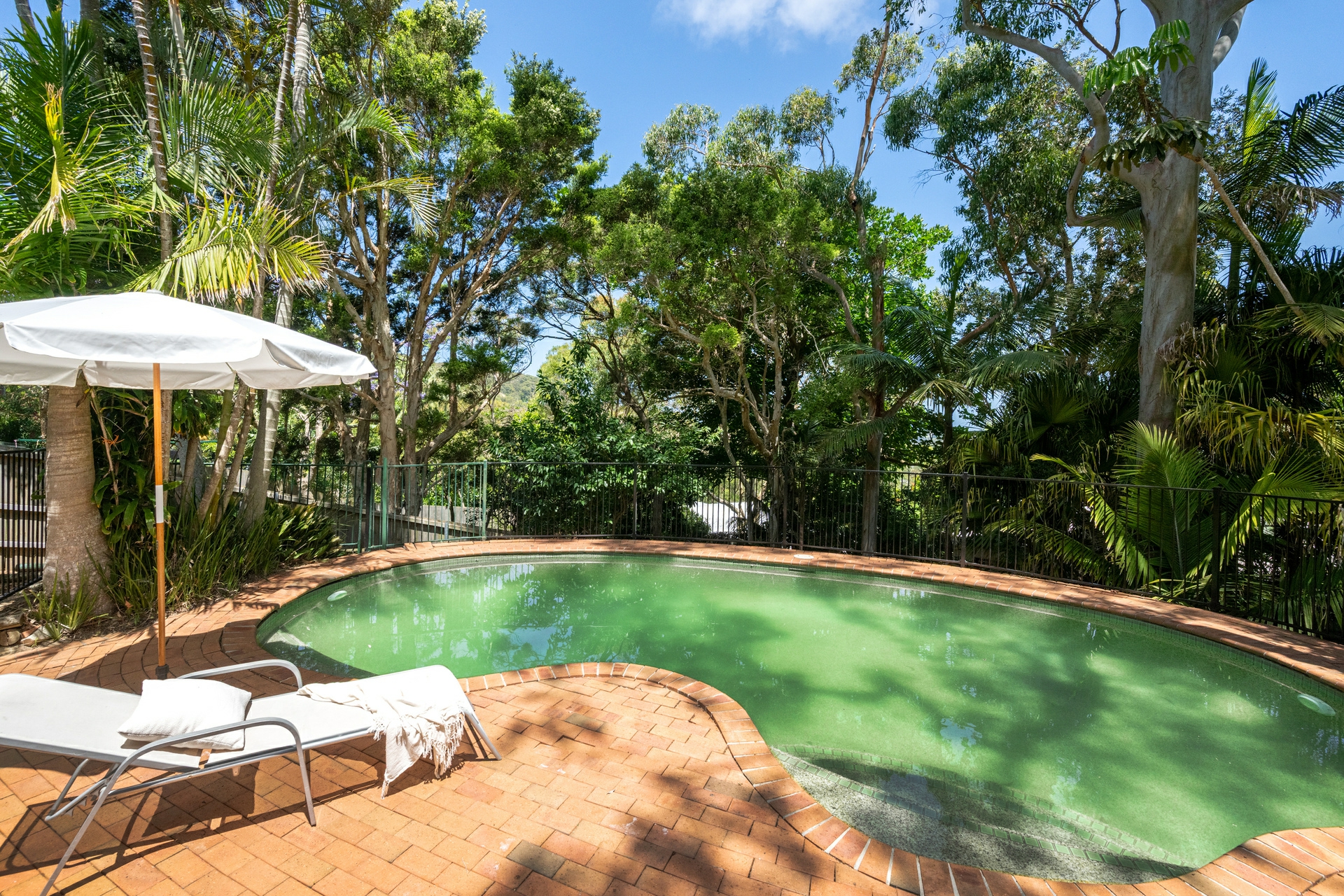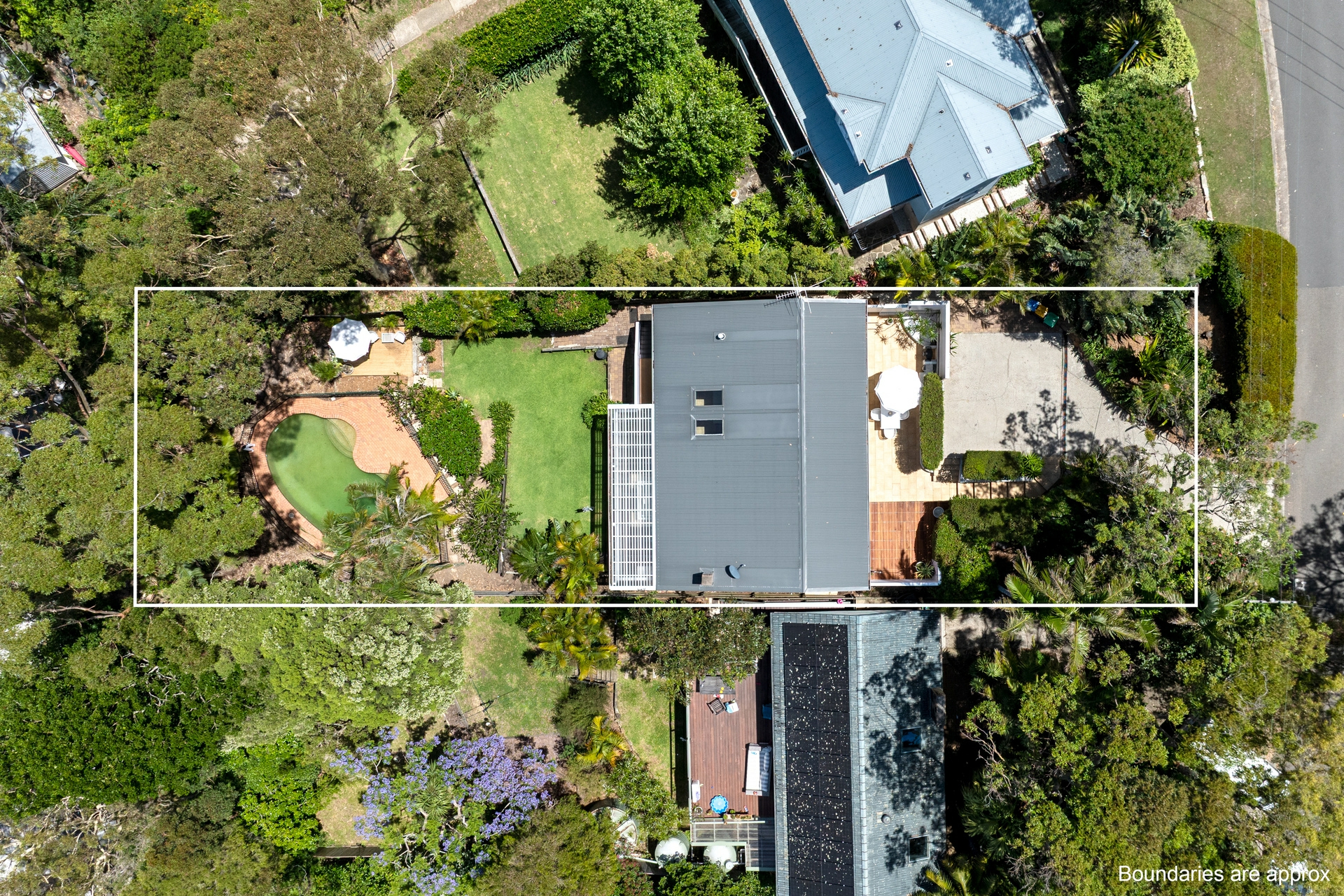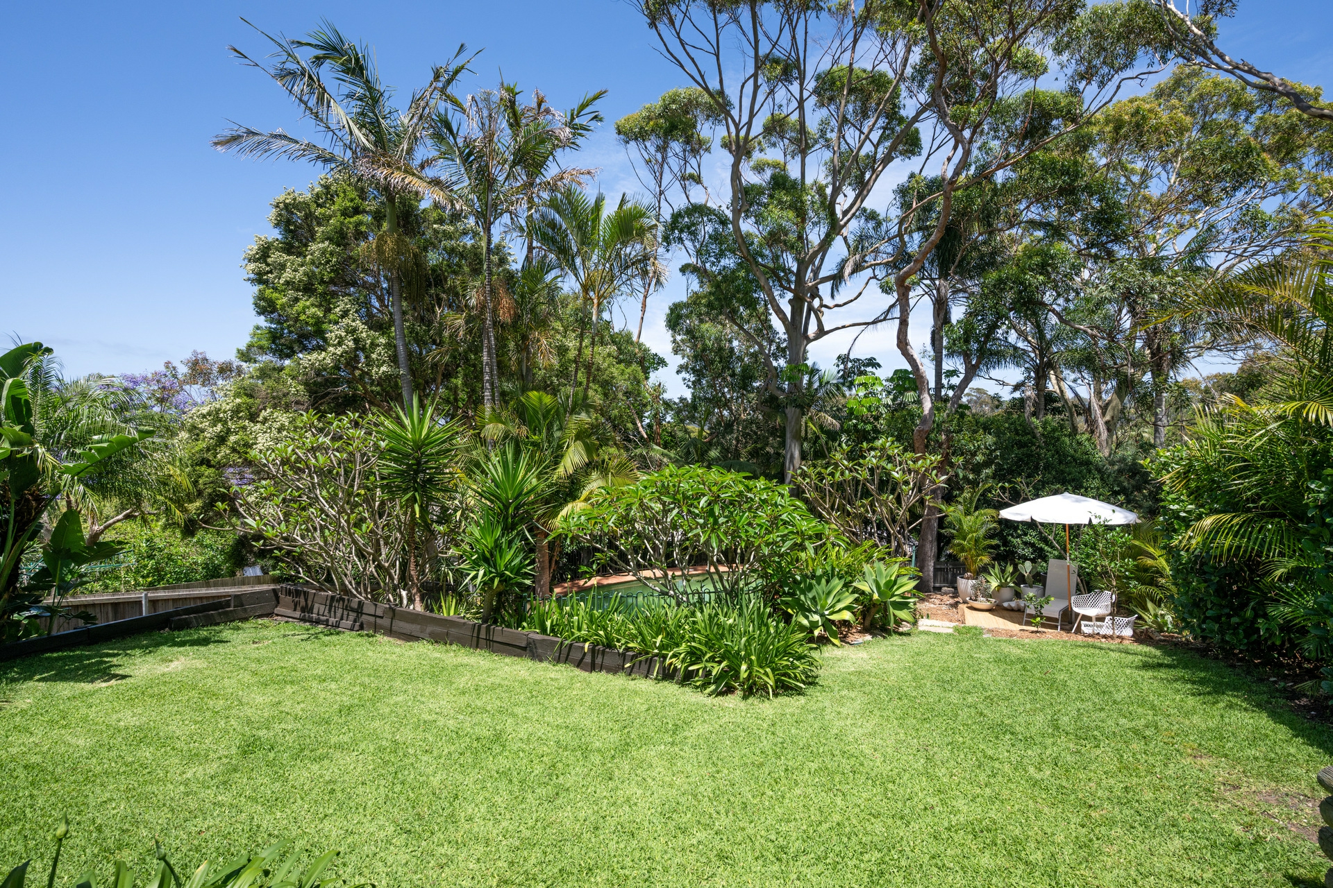 - Covered timber deck overlooking tropical garden with outdoor shower, pool, and level lawn