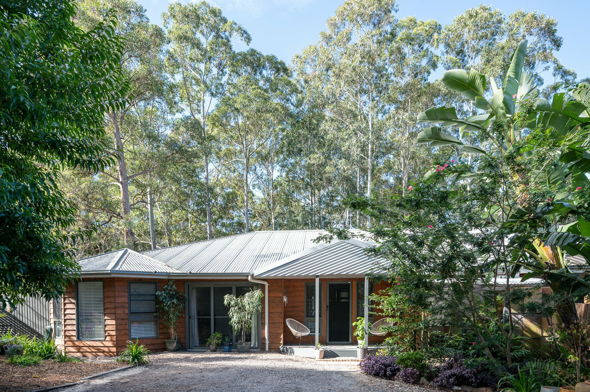 The back yard is landscaped with native trees and shrubs, has a vegetable garden and chook pen.