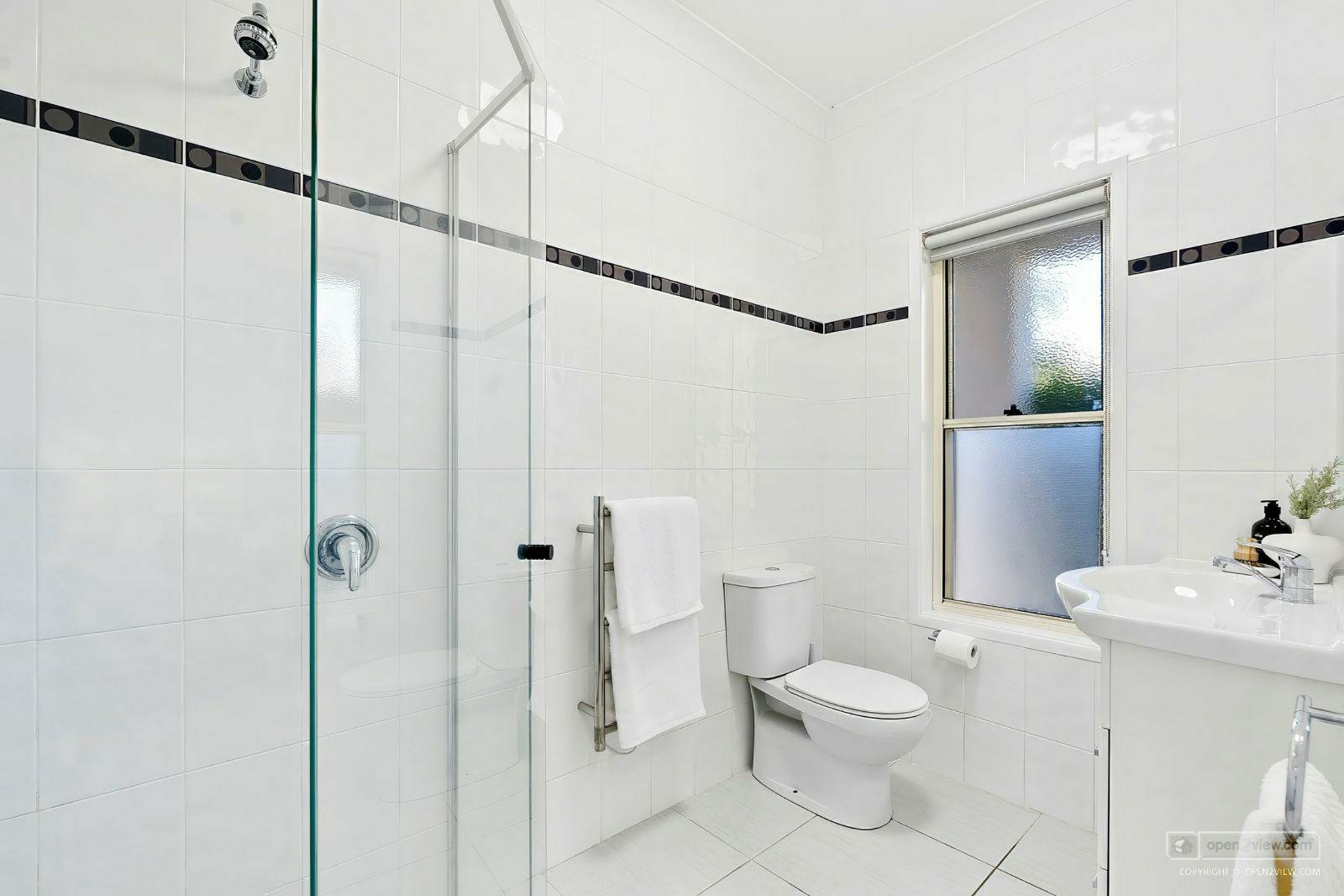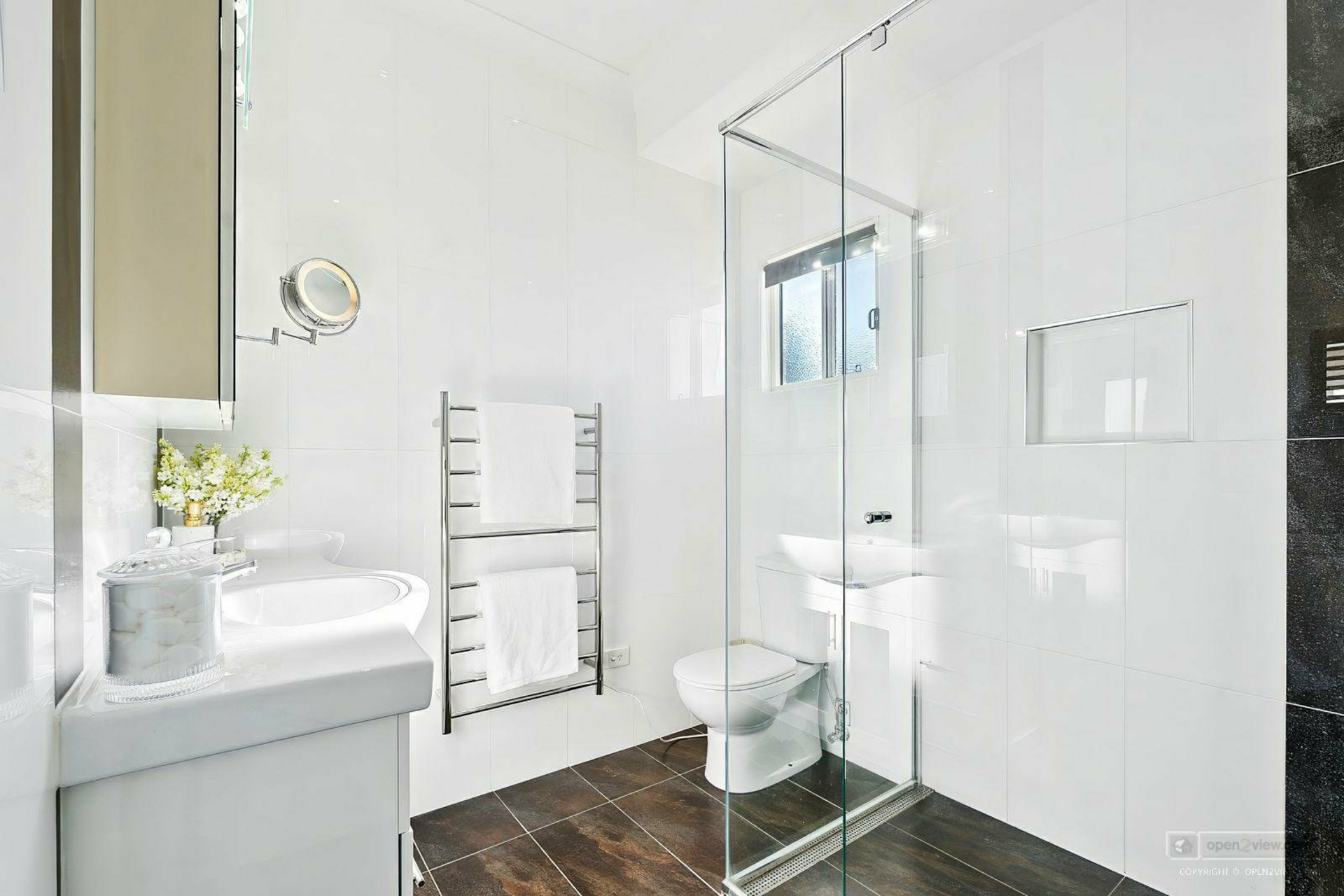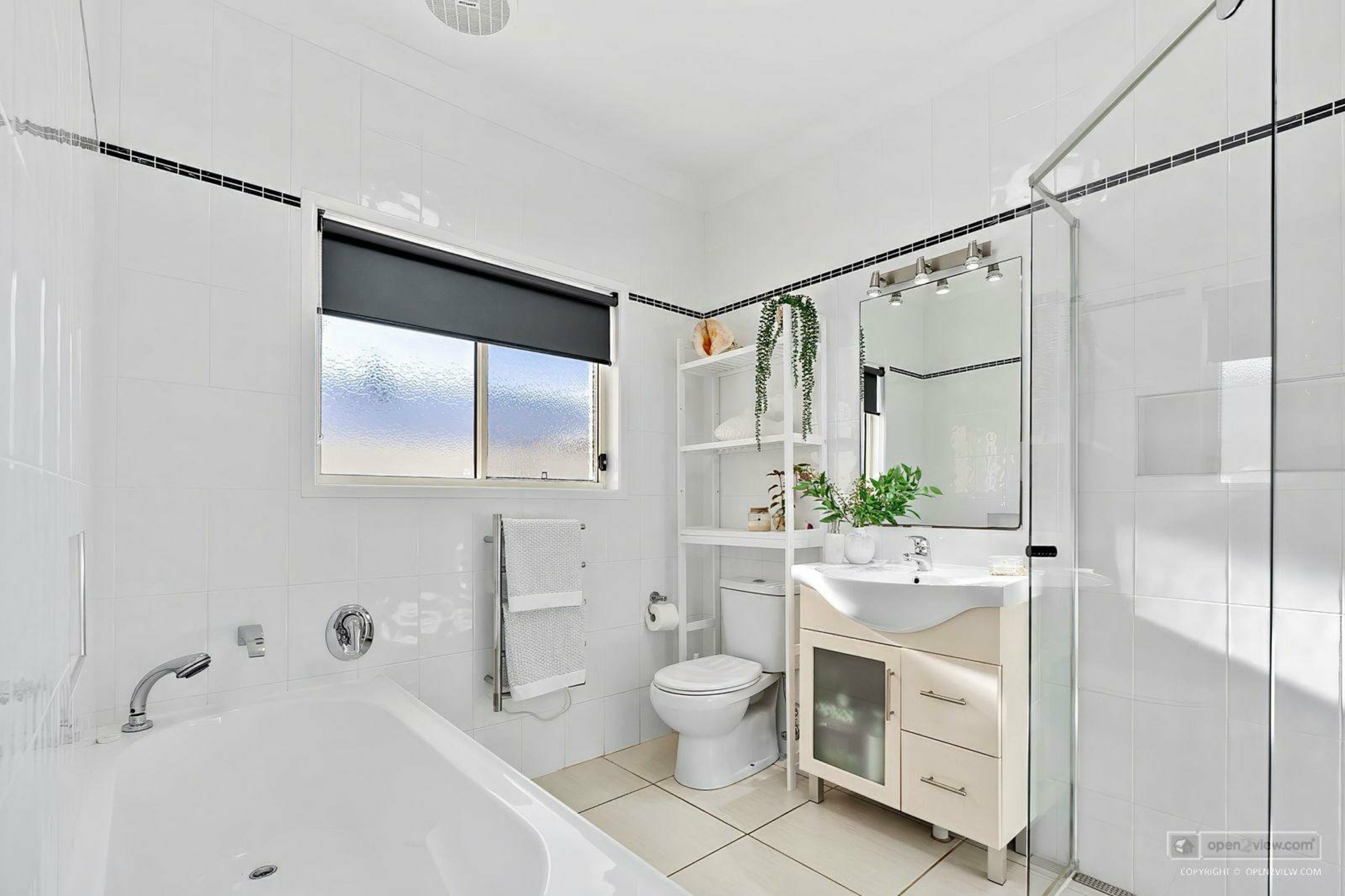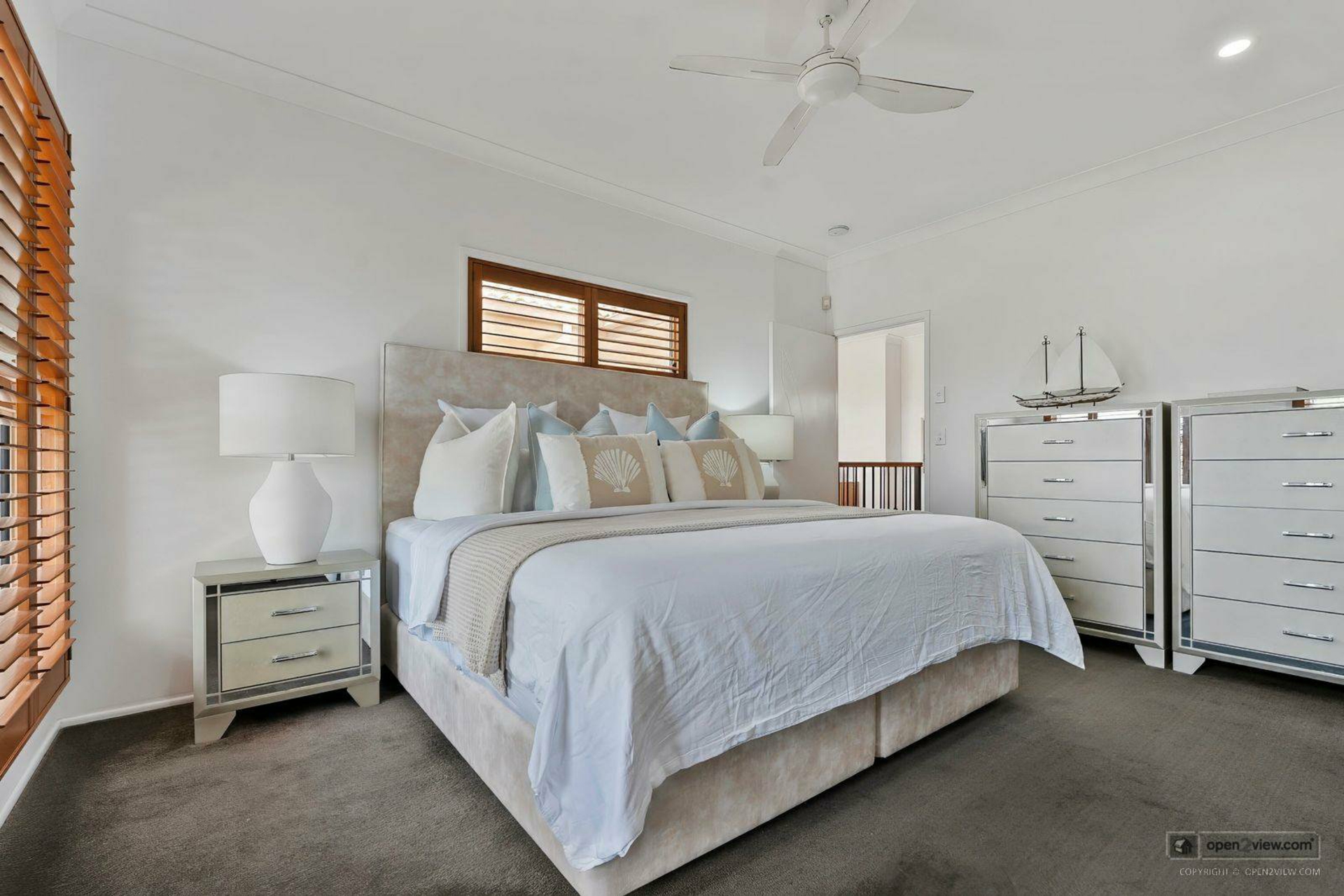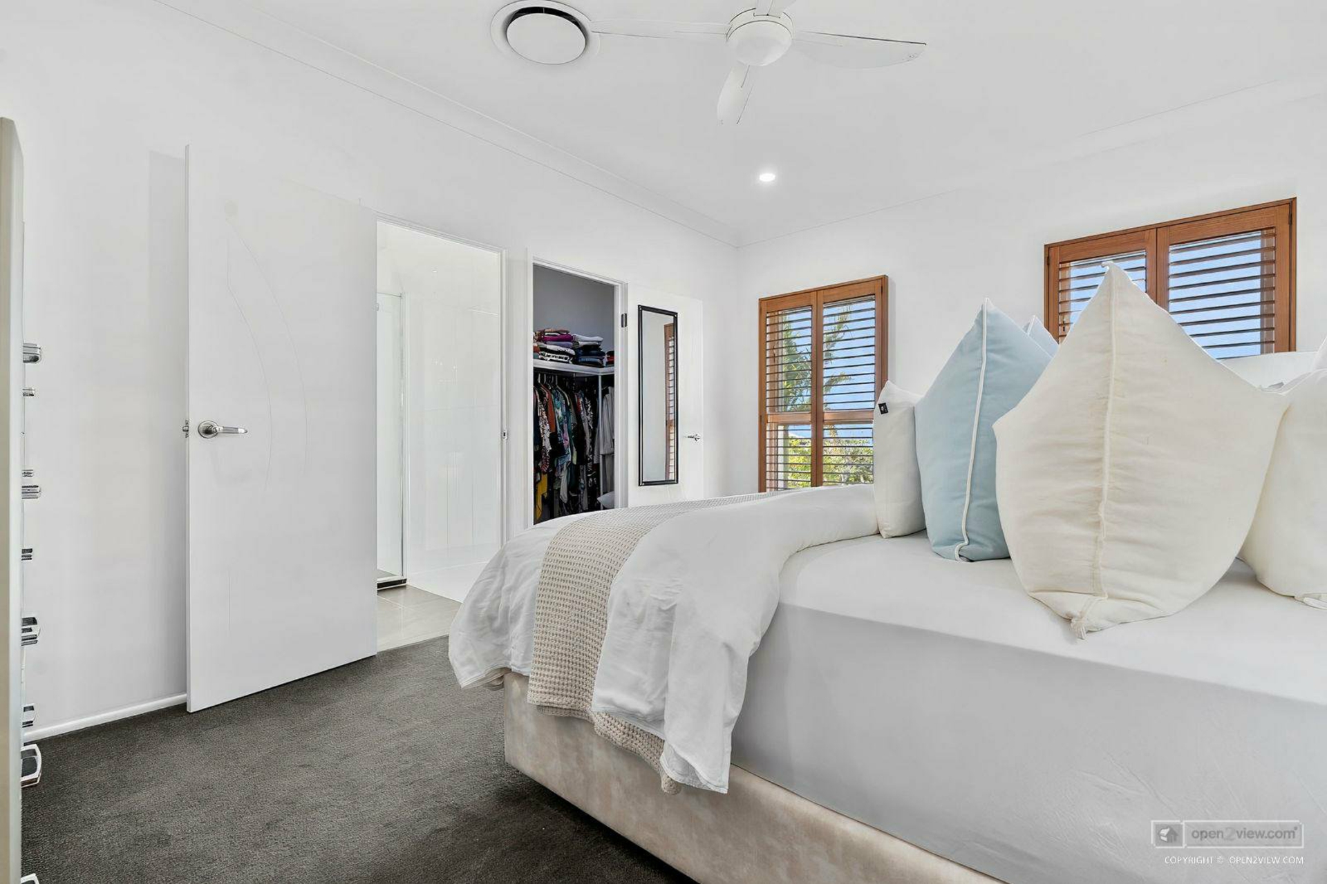 Main master bedroom - Carpet, ceiling fan, plantation shutters, walk in robe, ensuite - Tiled - floor to ceiling, heated towel rack, shower, toilet, vanity