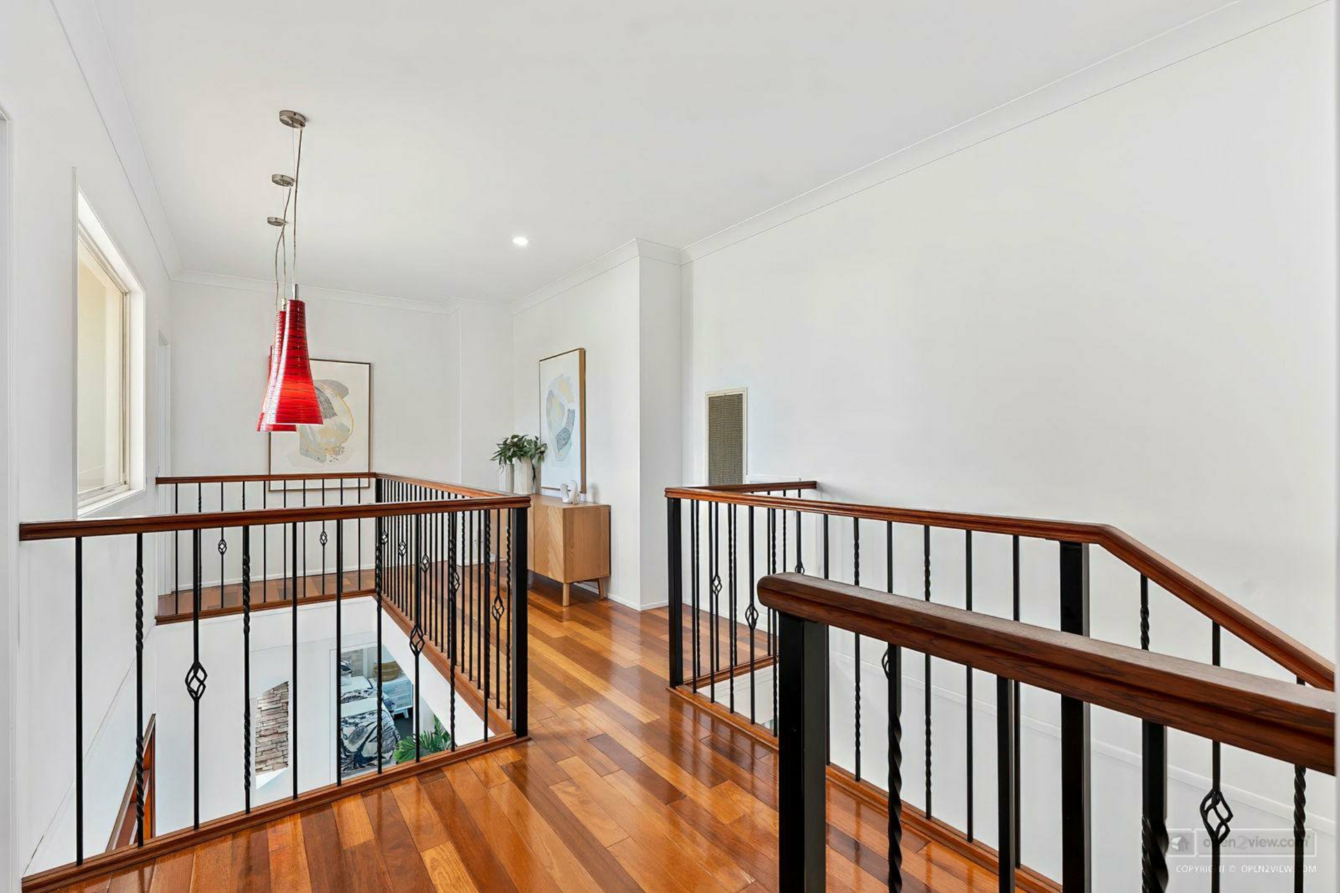 Catwalk leading from stairs to 5th bedroom - Polished timber flooring