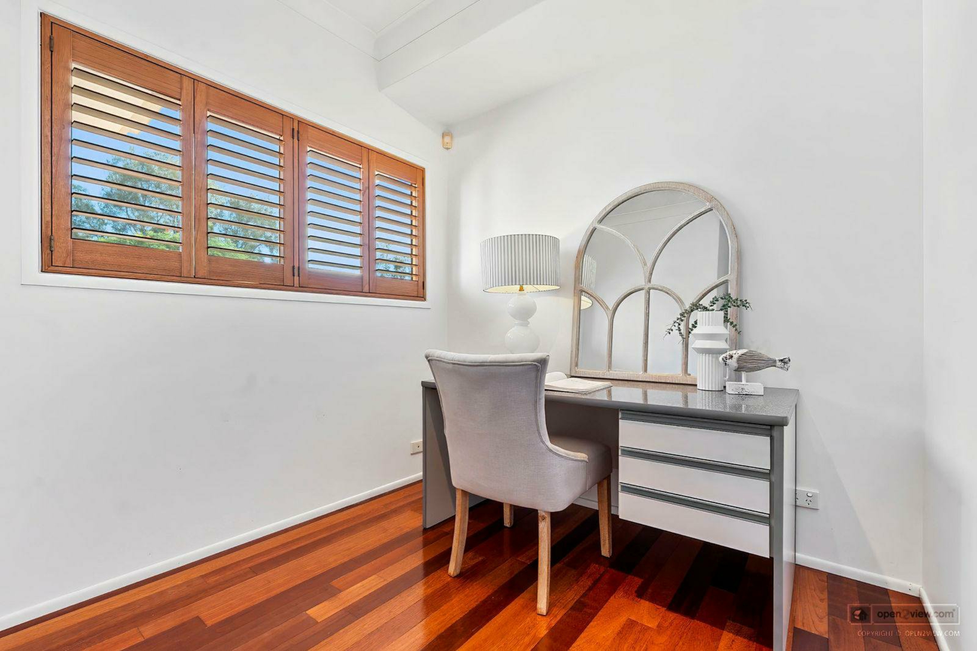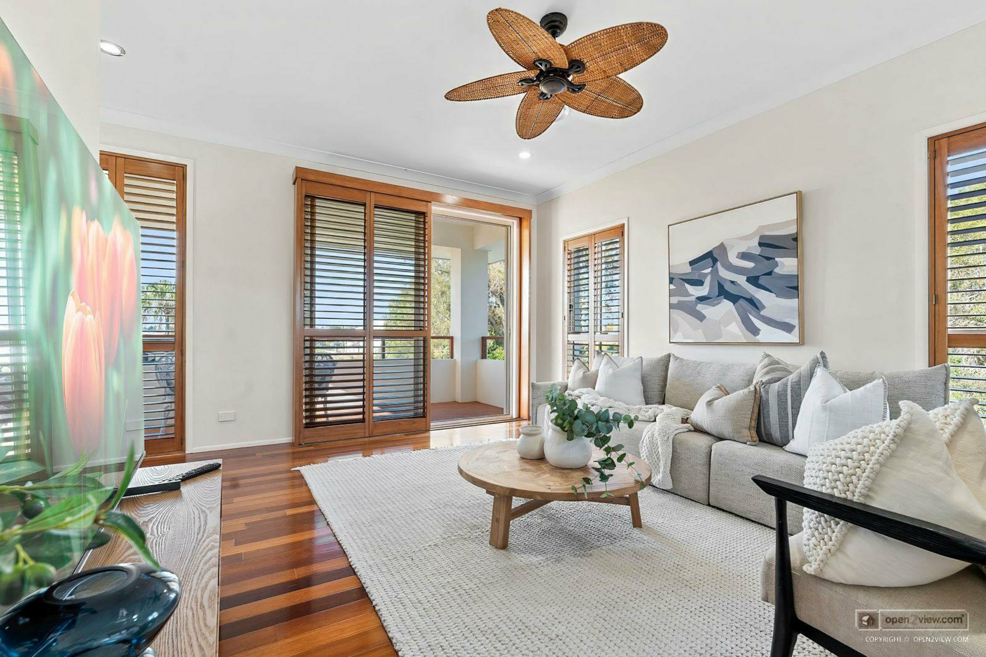 Bedroom five - Timber flooring, designer fan, plantation shutters, exclusive use balcony