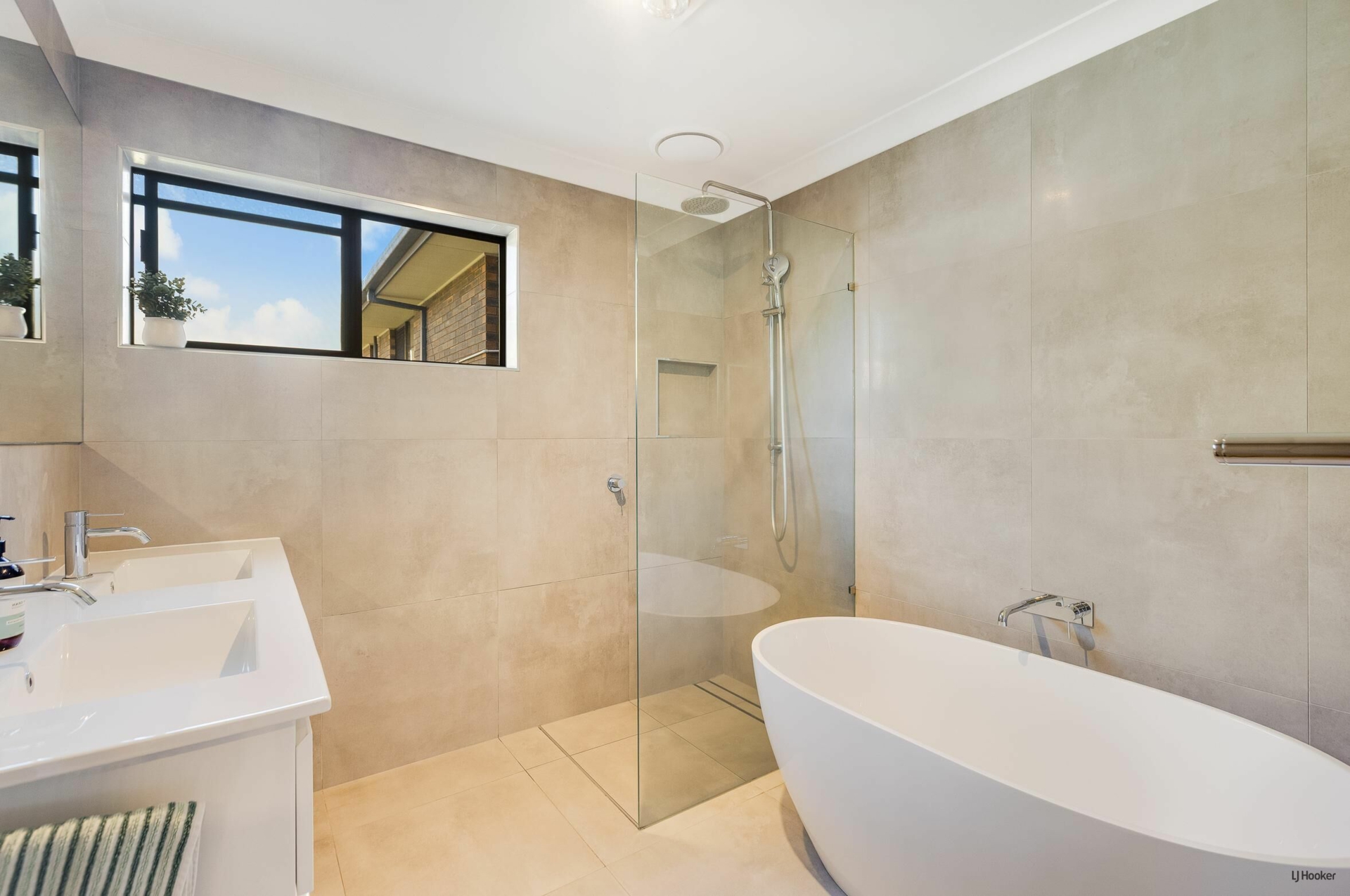 - Renovated bathroom with separate large deep bath, separate shower, double vanity floor to ceiling modern tiling