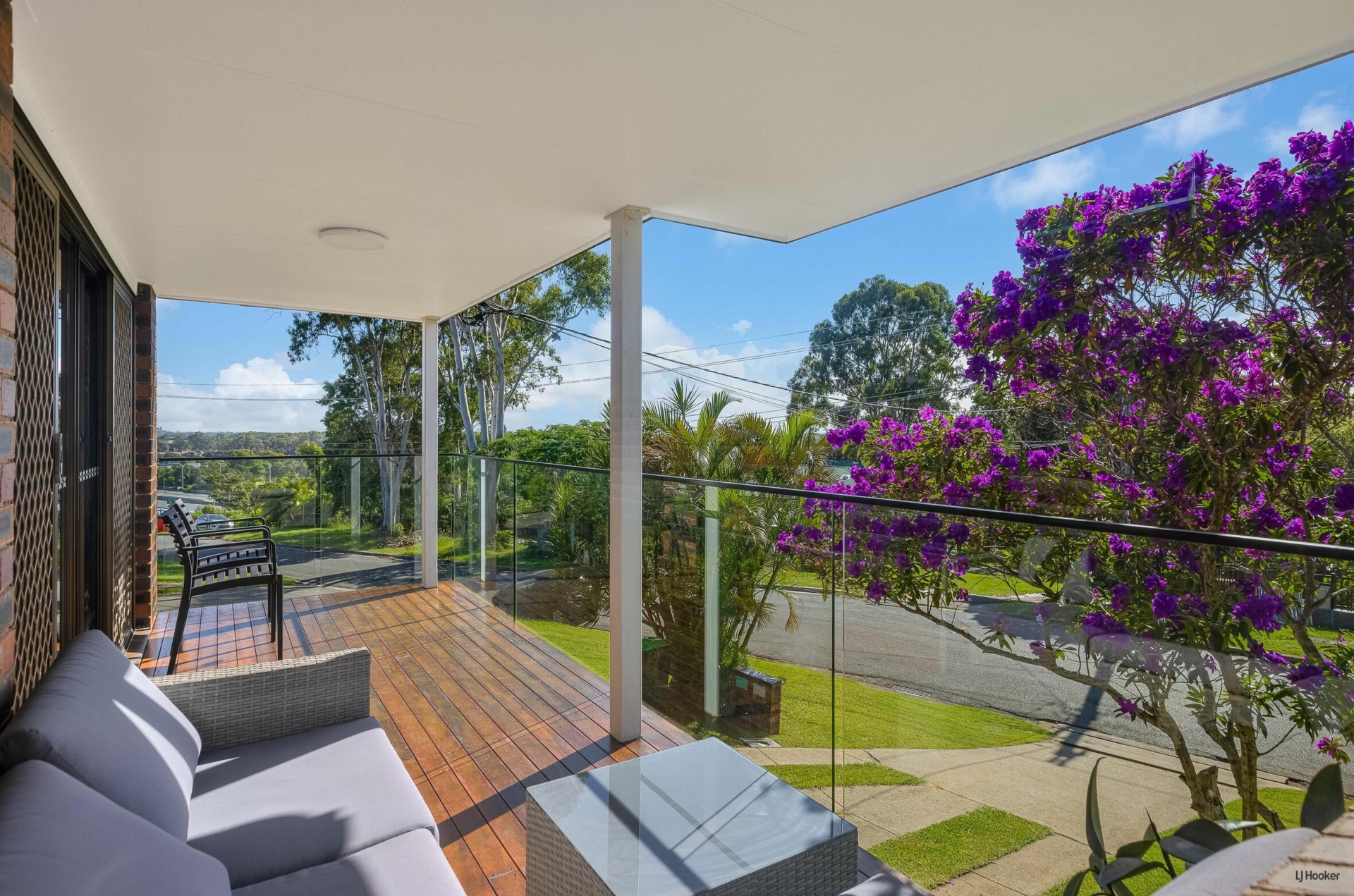 - Covered front deck with easy care flooring and glass balustrades