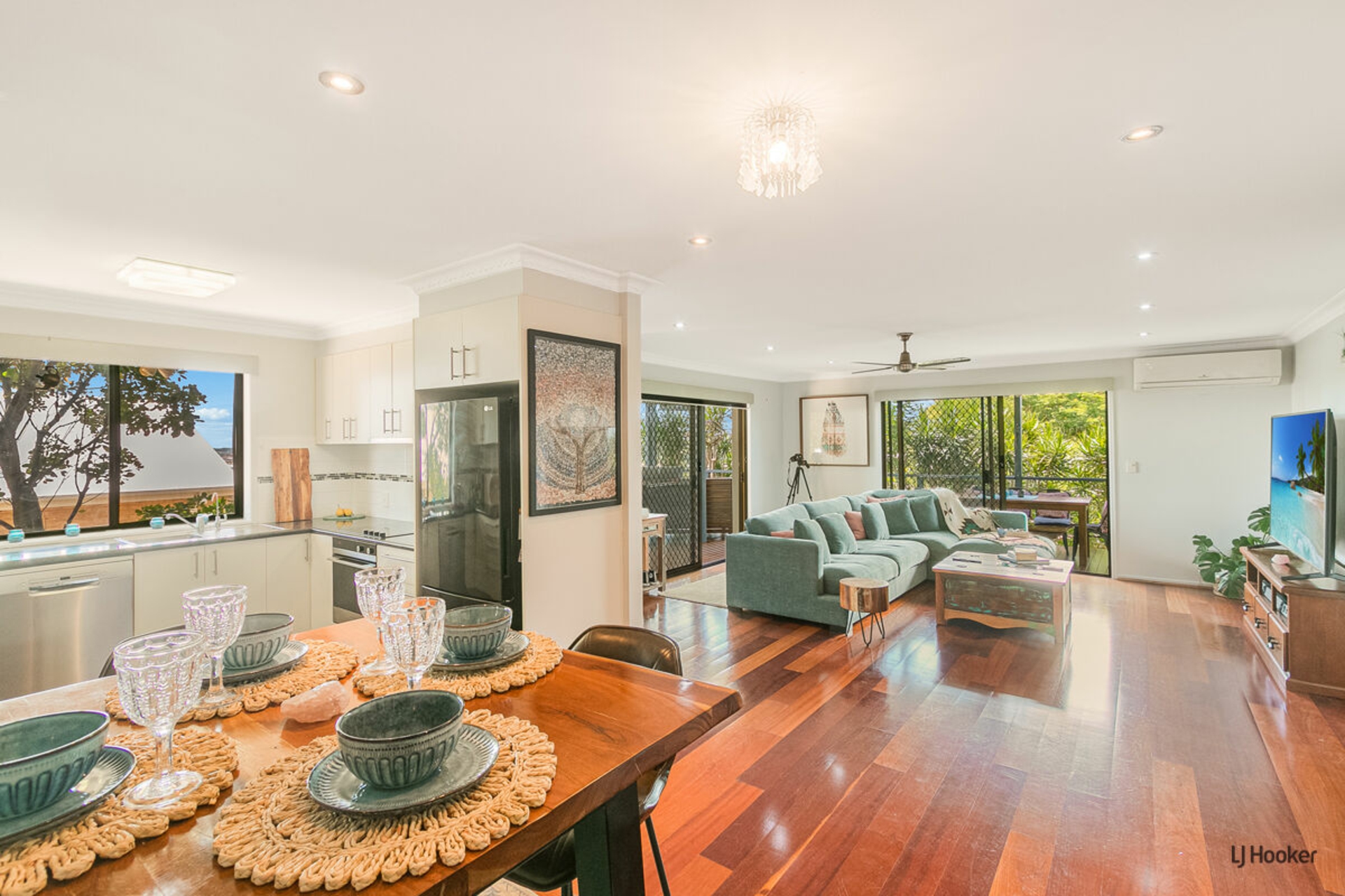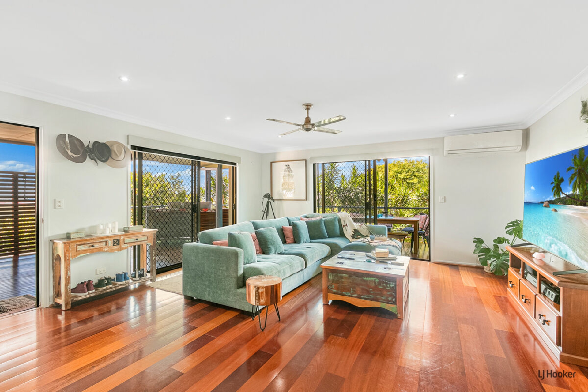 - Open plan living/ dining with beautiful floor boards leads out the the EXPANSIVE wrap around covered deck- entertainment area the living room boasts natural light, sea breezes A/C and ceiling fans